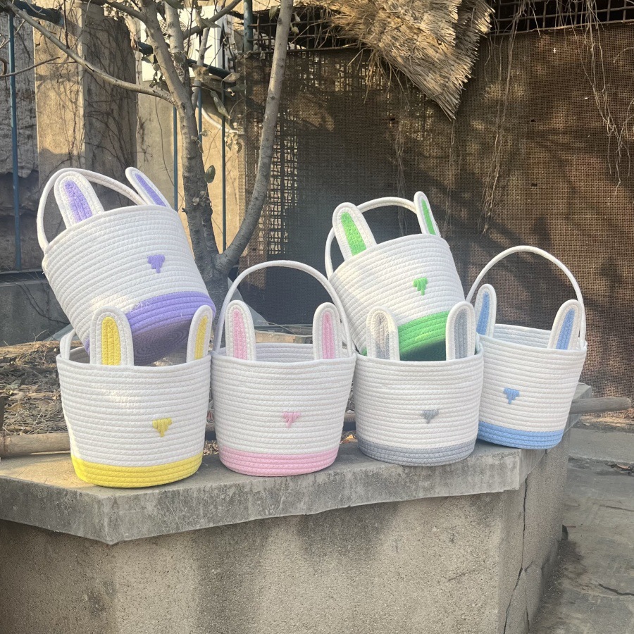Blue And White Stitching Charming Easter Egg Tote Basket – Cute Rabbit-Themed Handwoven Cotton Rope Candy Holder