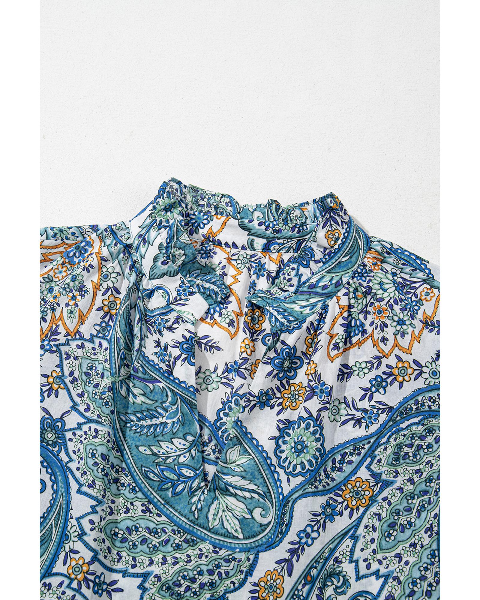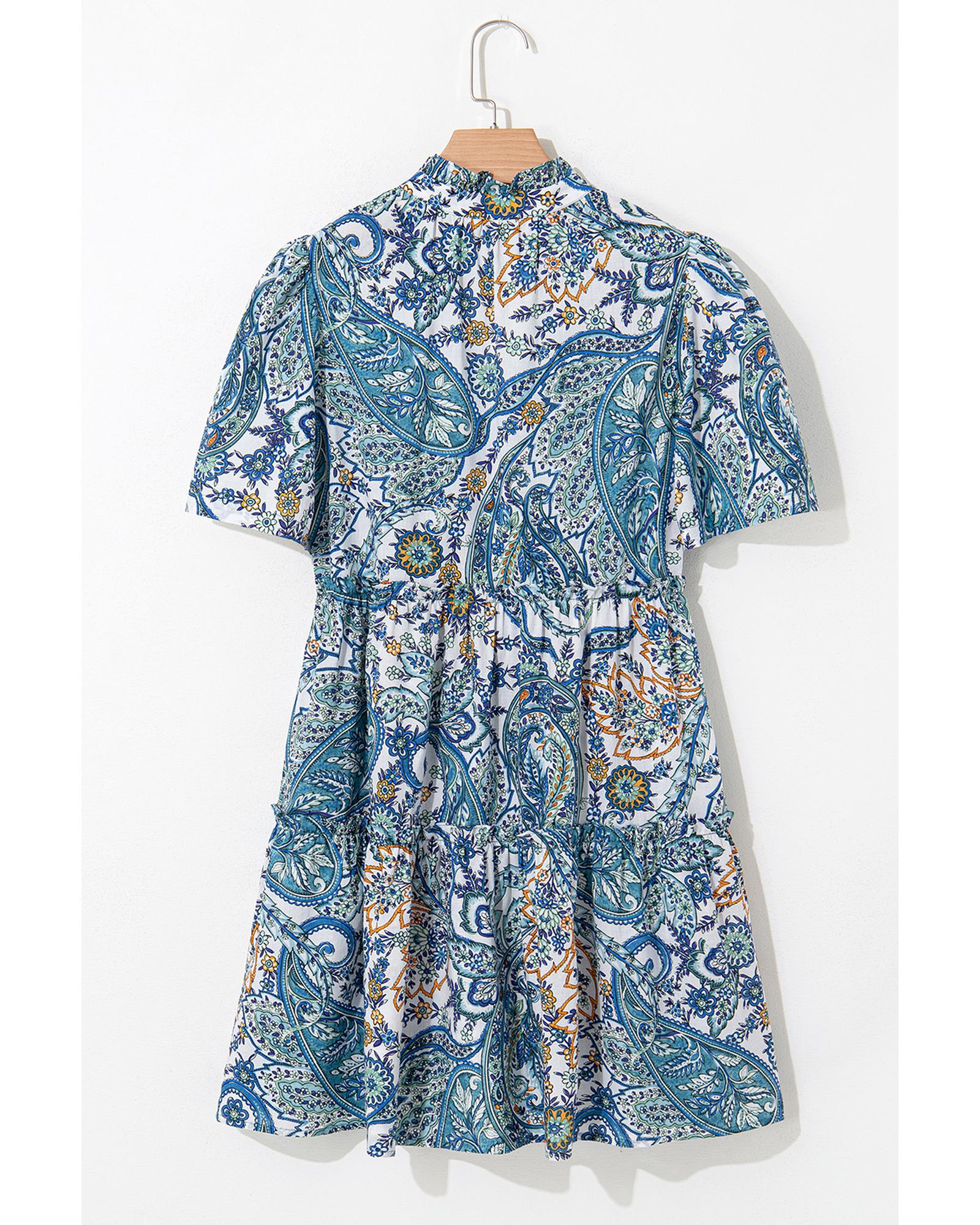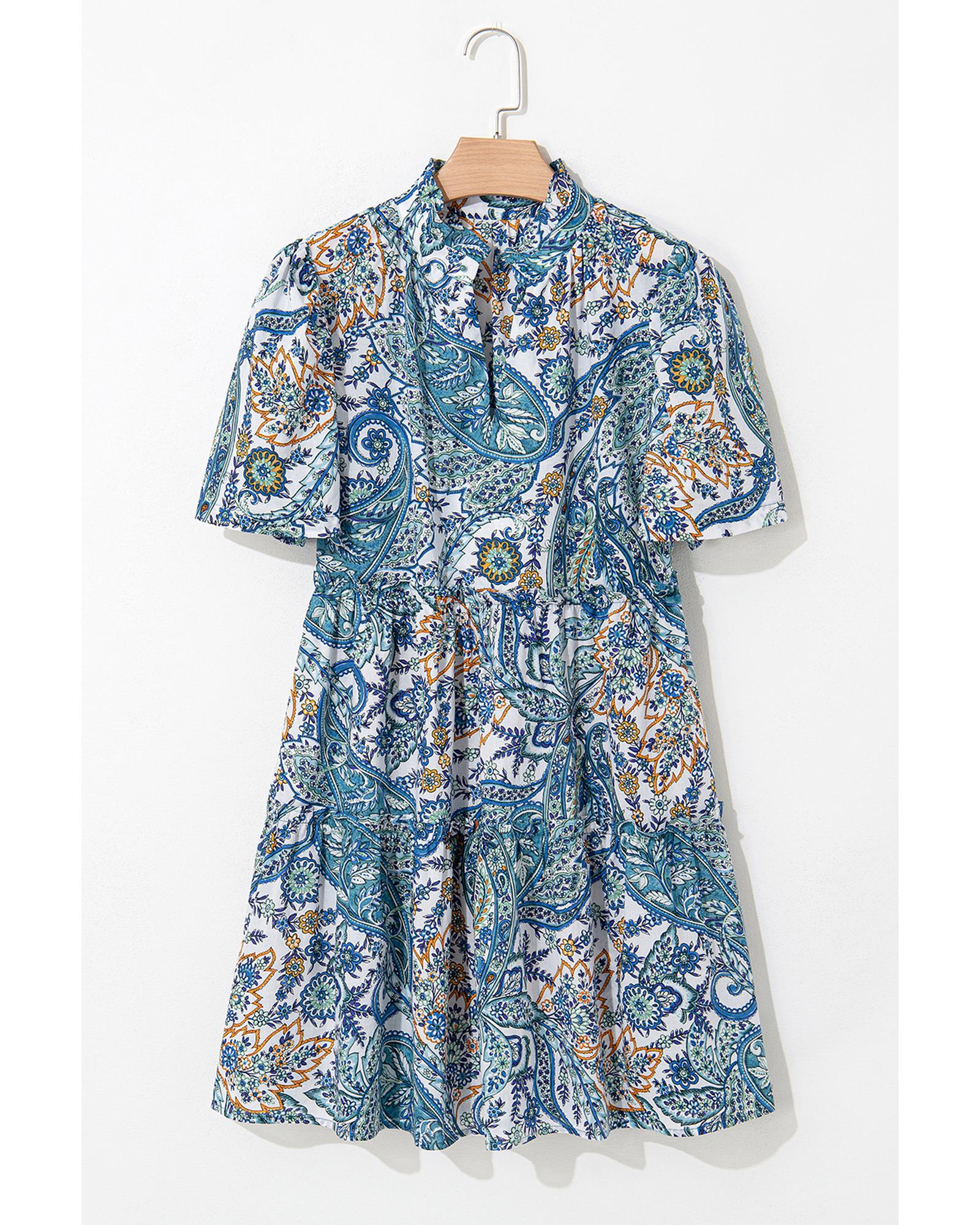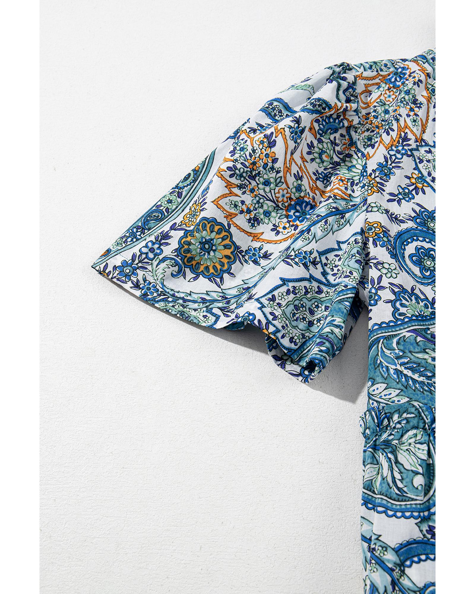 • Blue Bohemian Paisley Floral V Neck Short Sleeve Mini Dress