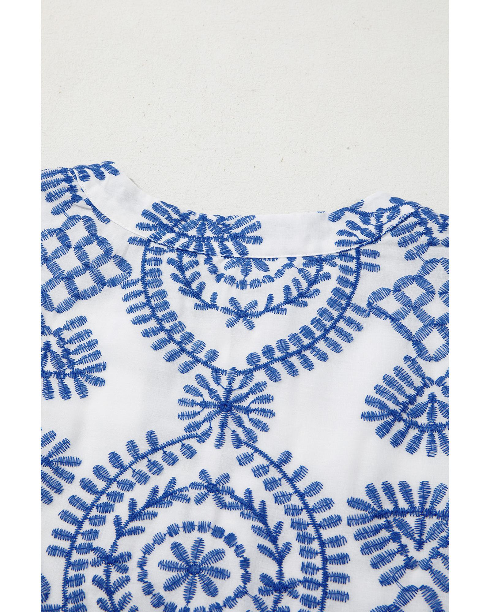 Blue Boho Floral Embroidered Notch V Neck Shift Mini Dress - M