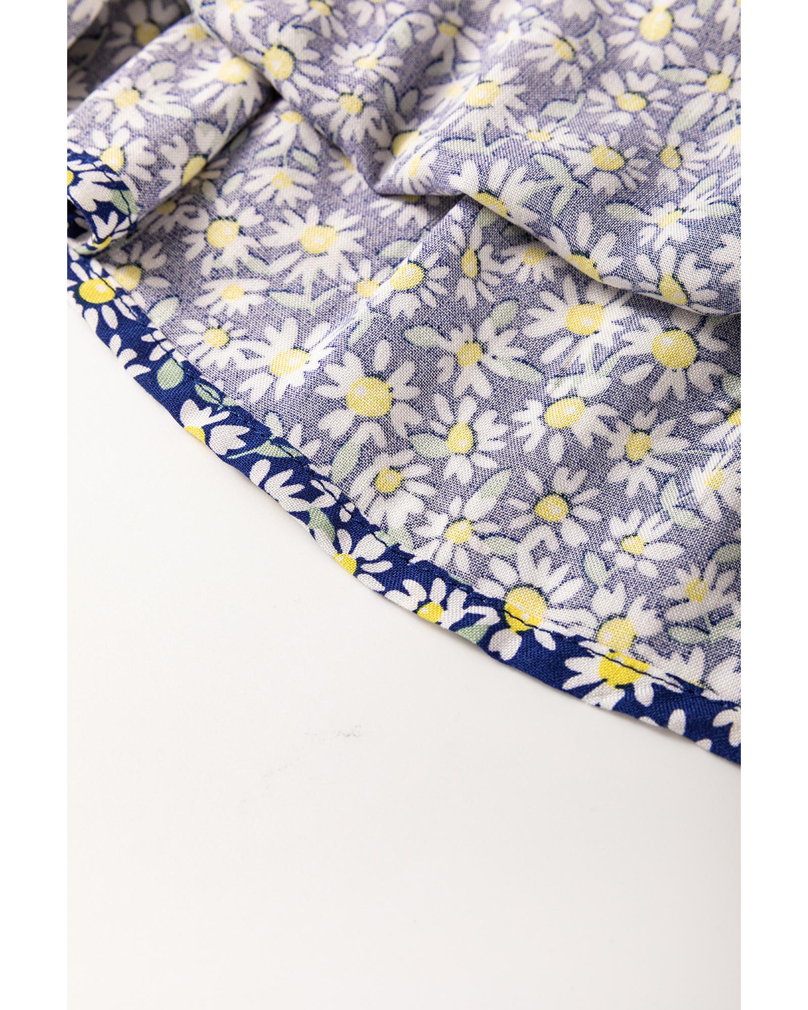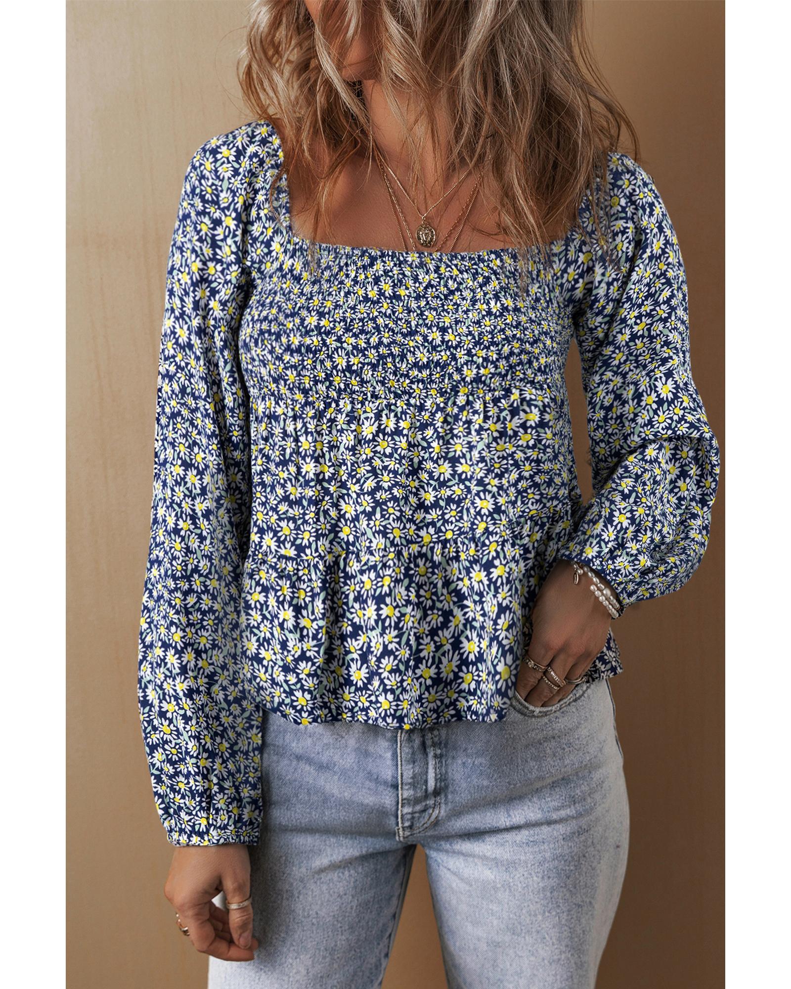 Blue Boho Floral Print Smocked Square Neck Loose Fit Blouse – M