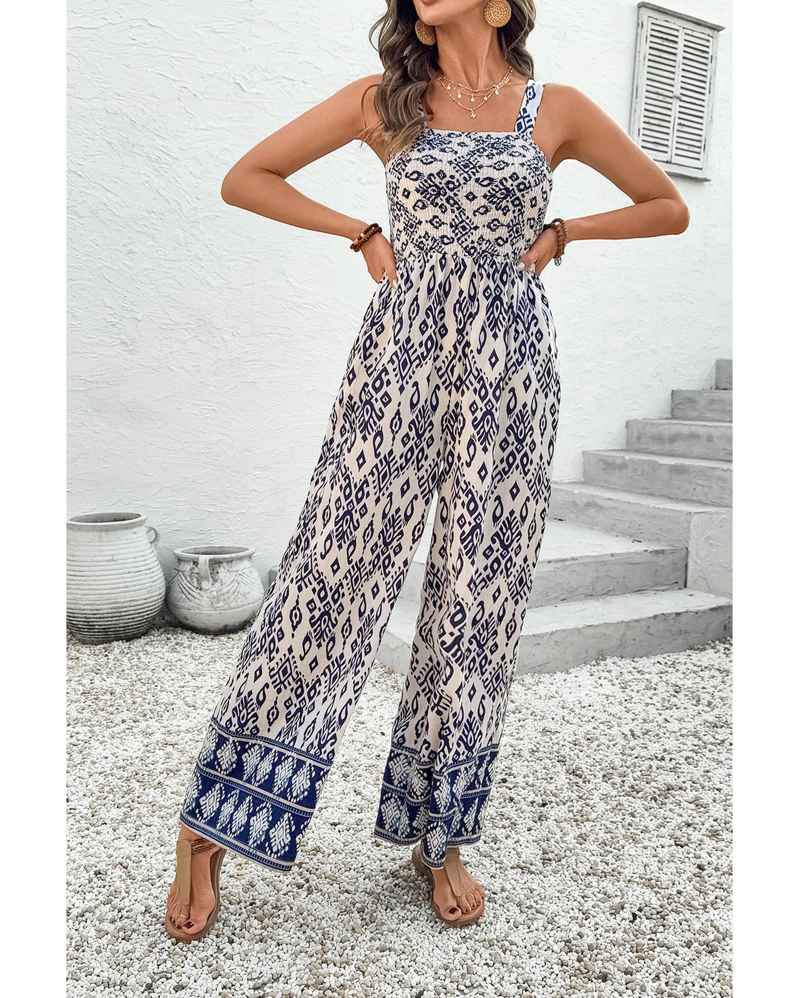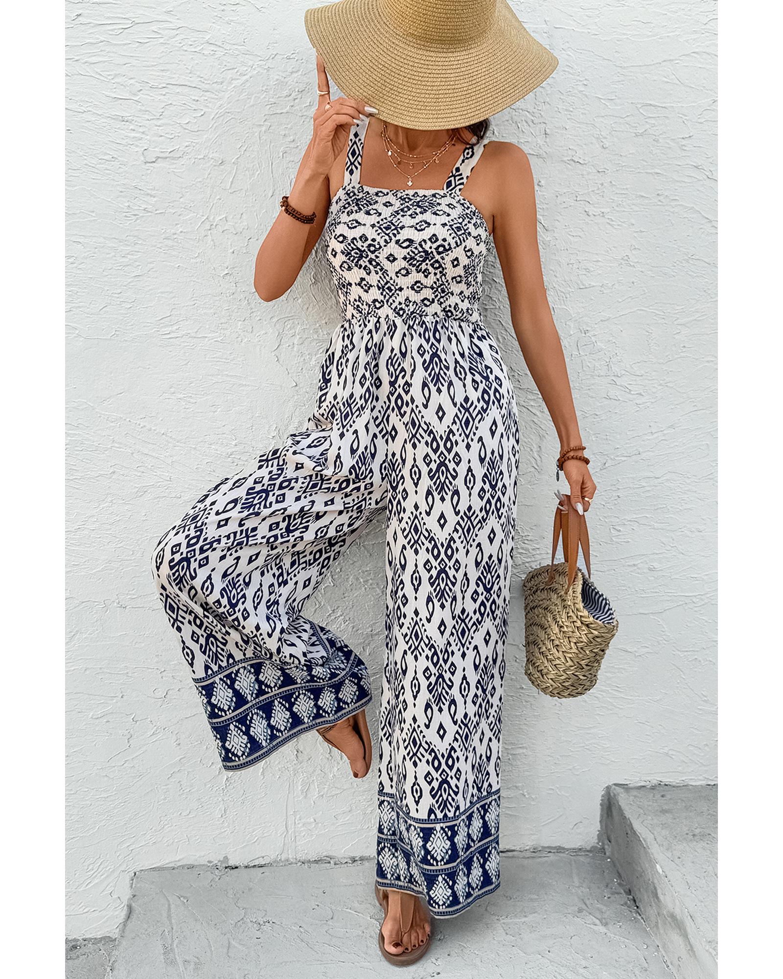 Blue Boho Geometric Print Shirred High Waist Wide Leg Jumpsuit – M