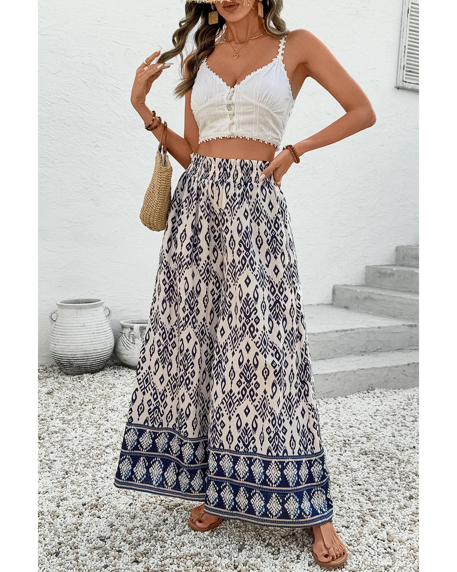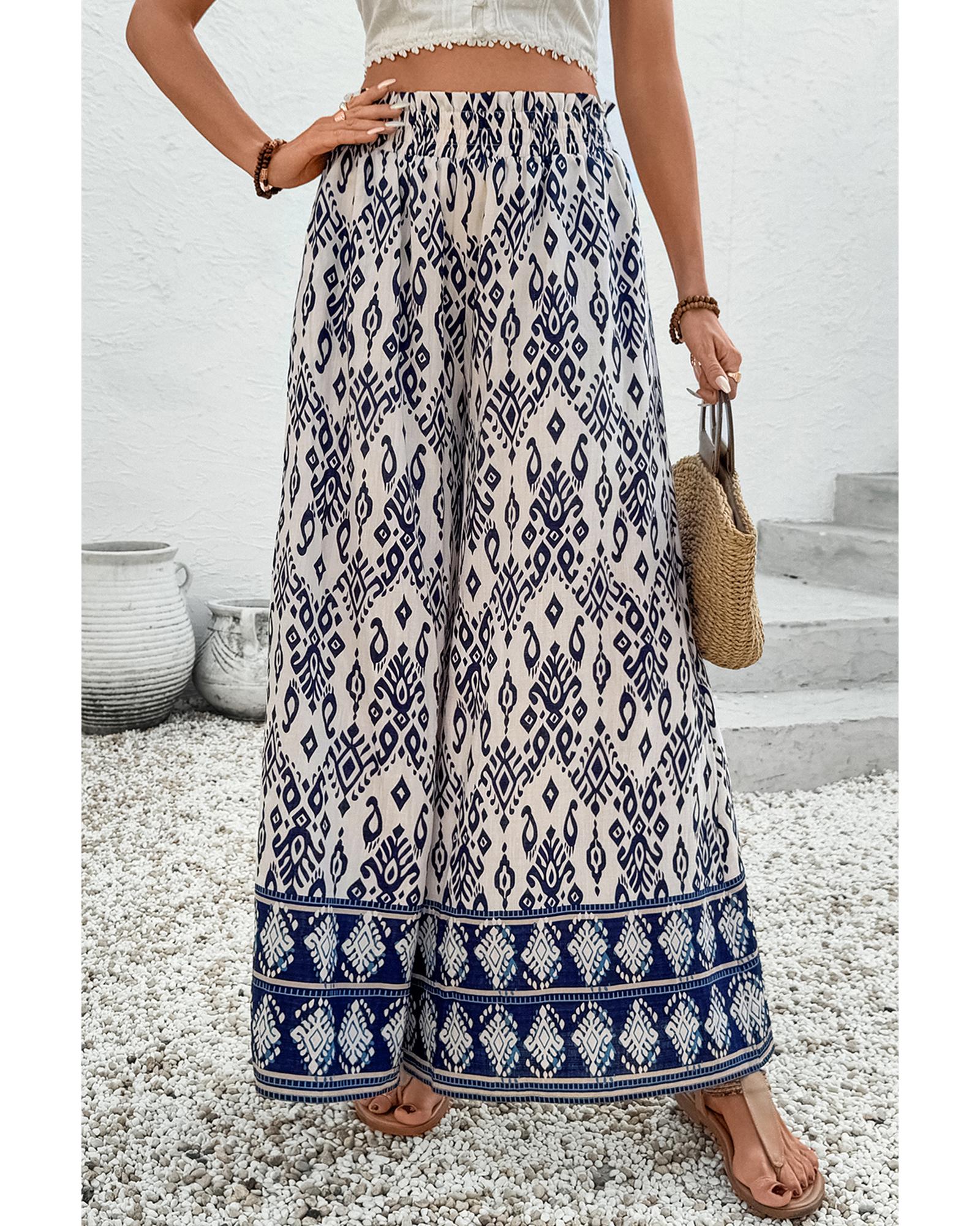 Blue Boho Pattern Print High Waist Wide Leg Loose Pants – L