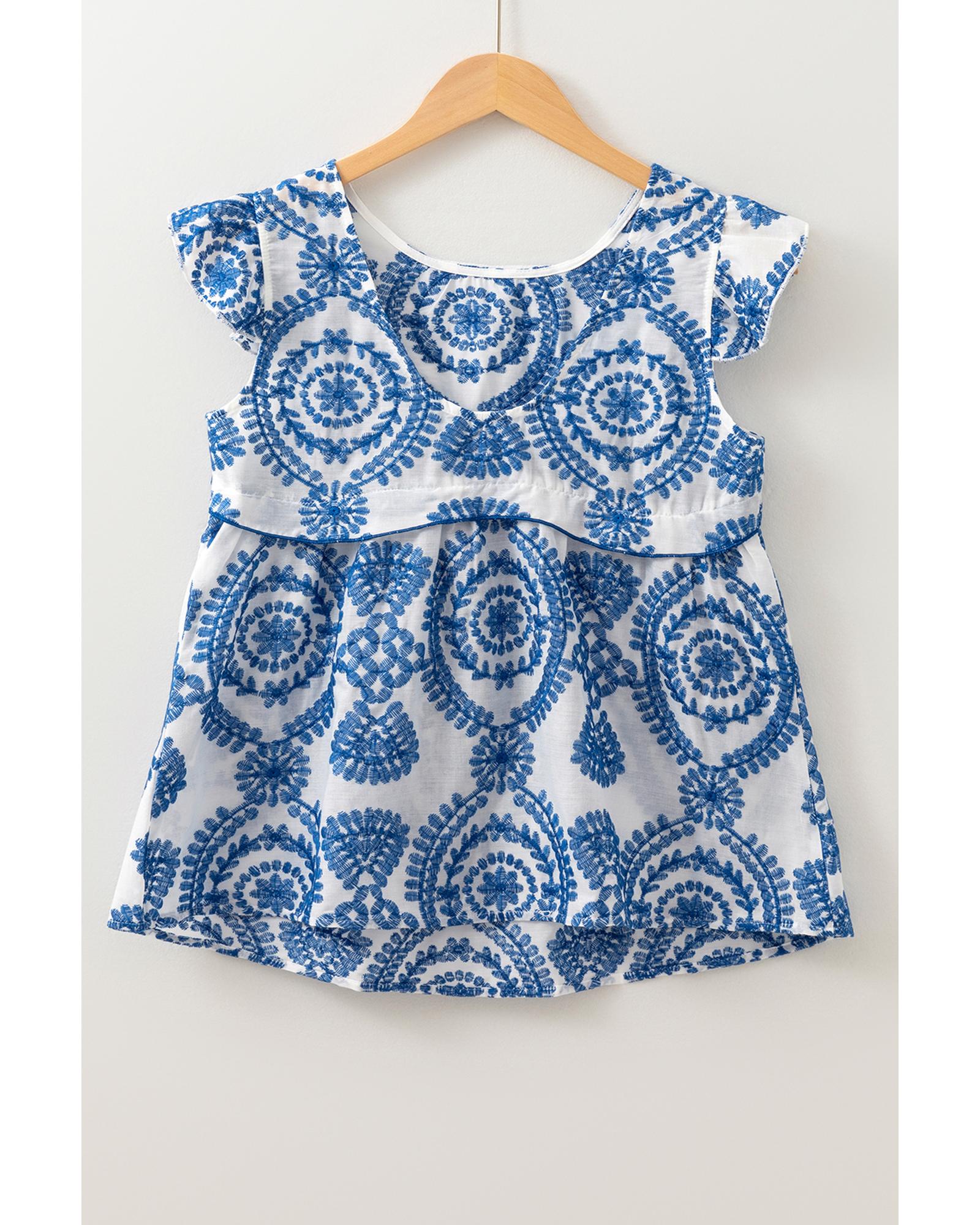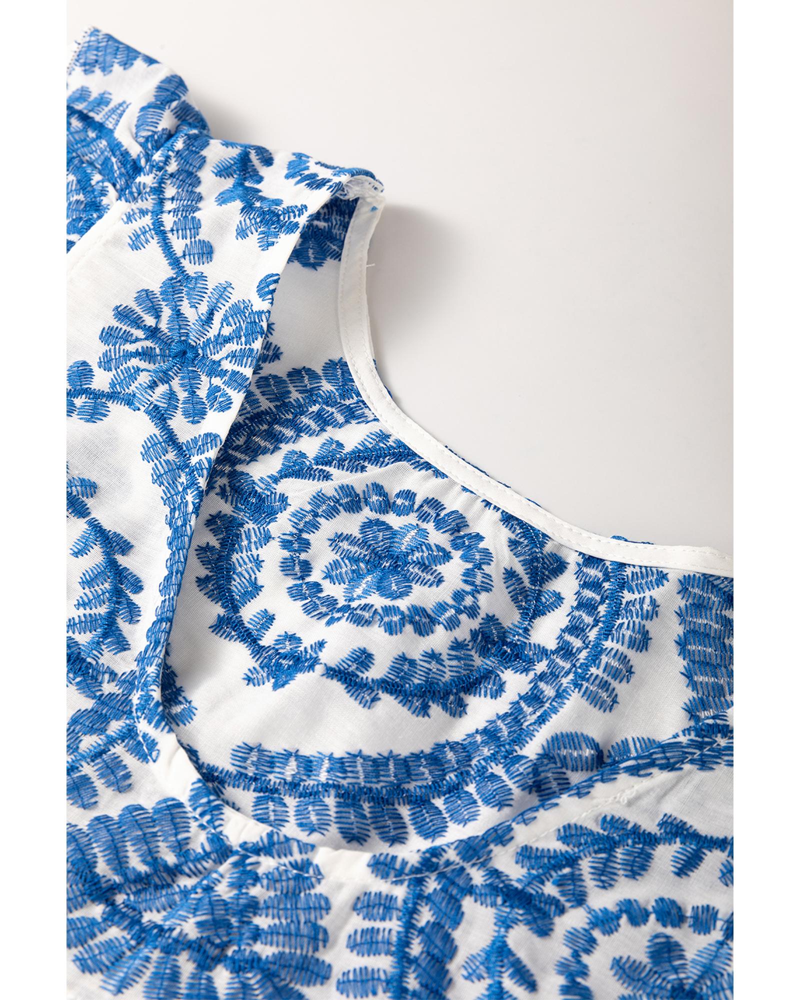 Blue Boho Print Flutter Sleeve Crew Neck Blouse – S