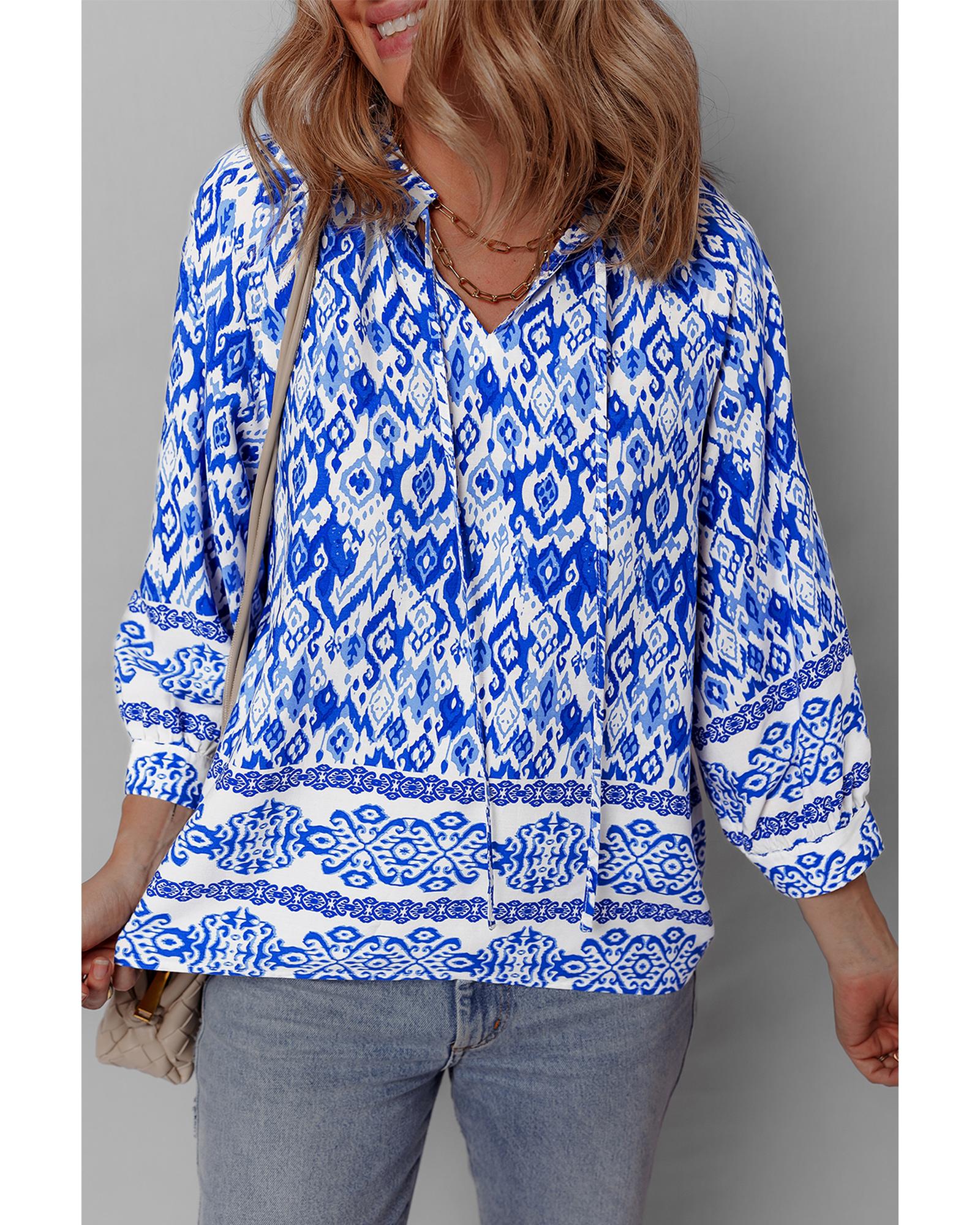 Blue Boho Printed 3/4 Sleeve Tied Neck Blouse – L