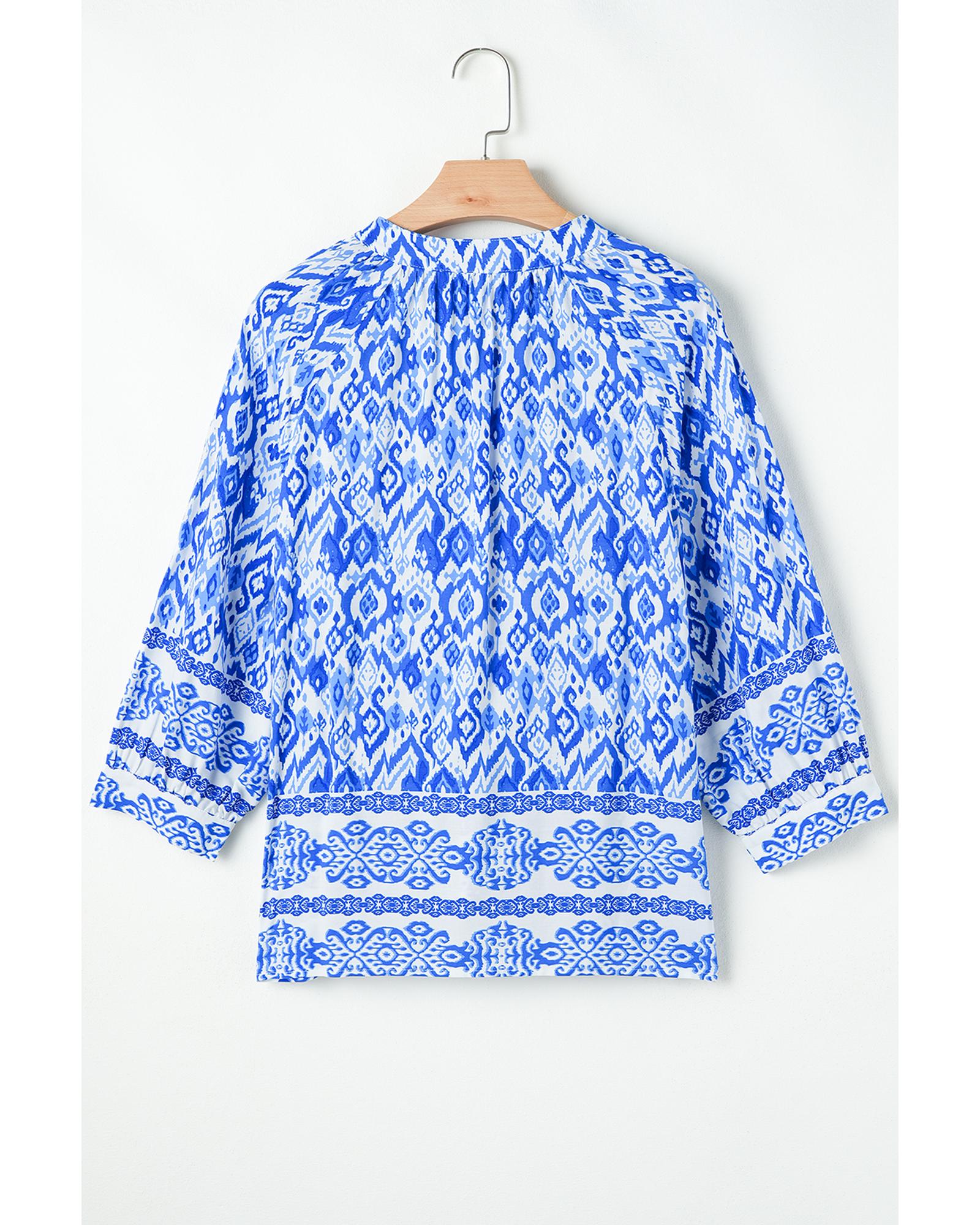 Blue Tribal Geometric Print 3/4 Sleeve Flowy Fit Blouse - M