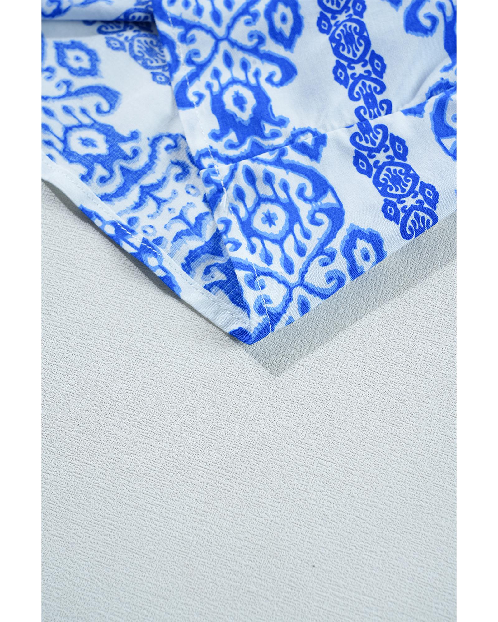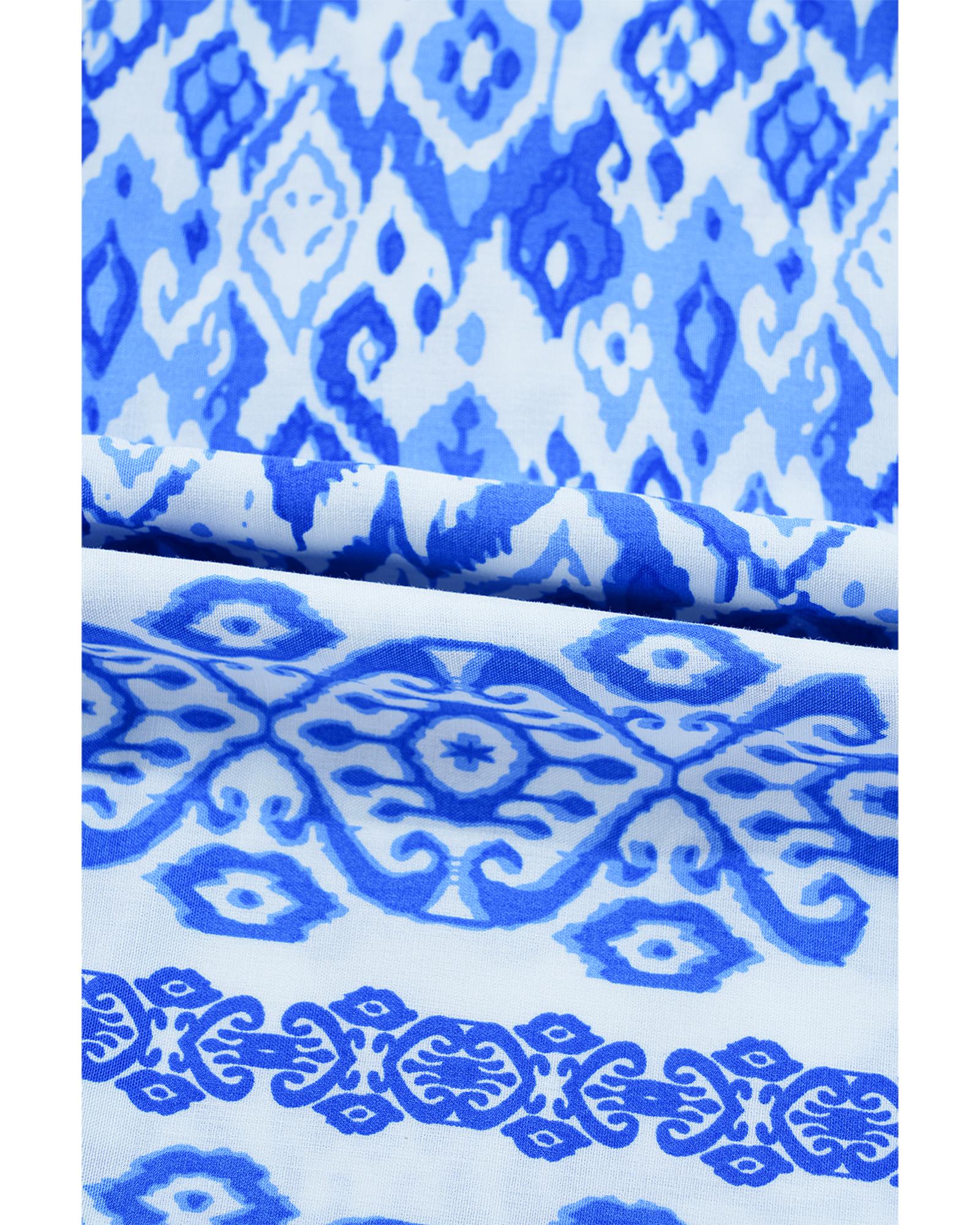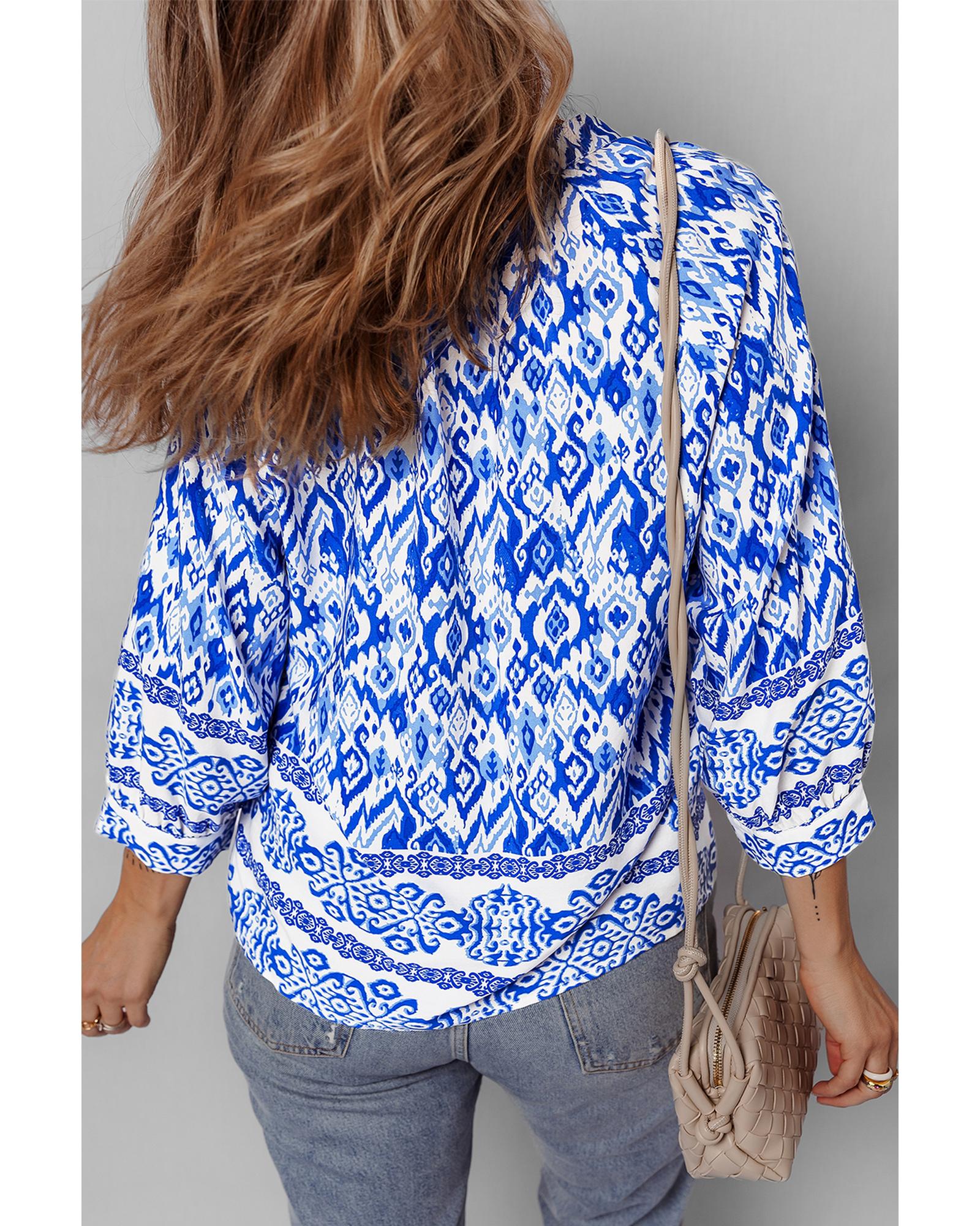 Blue Boho Printed 3/4 Sleeve Tied Neck Blouse – S