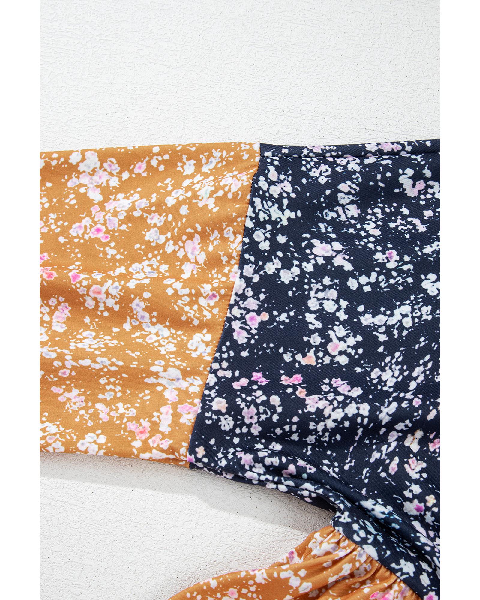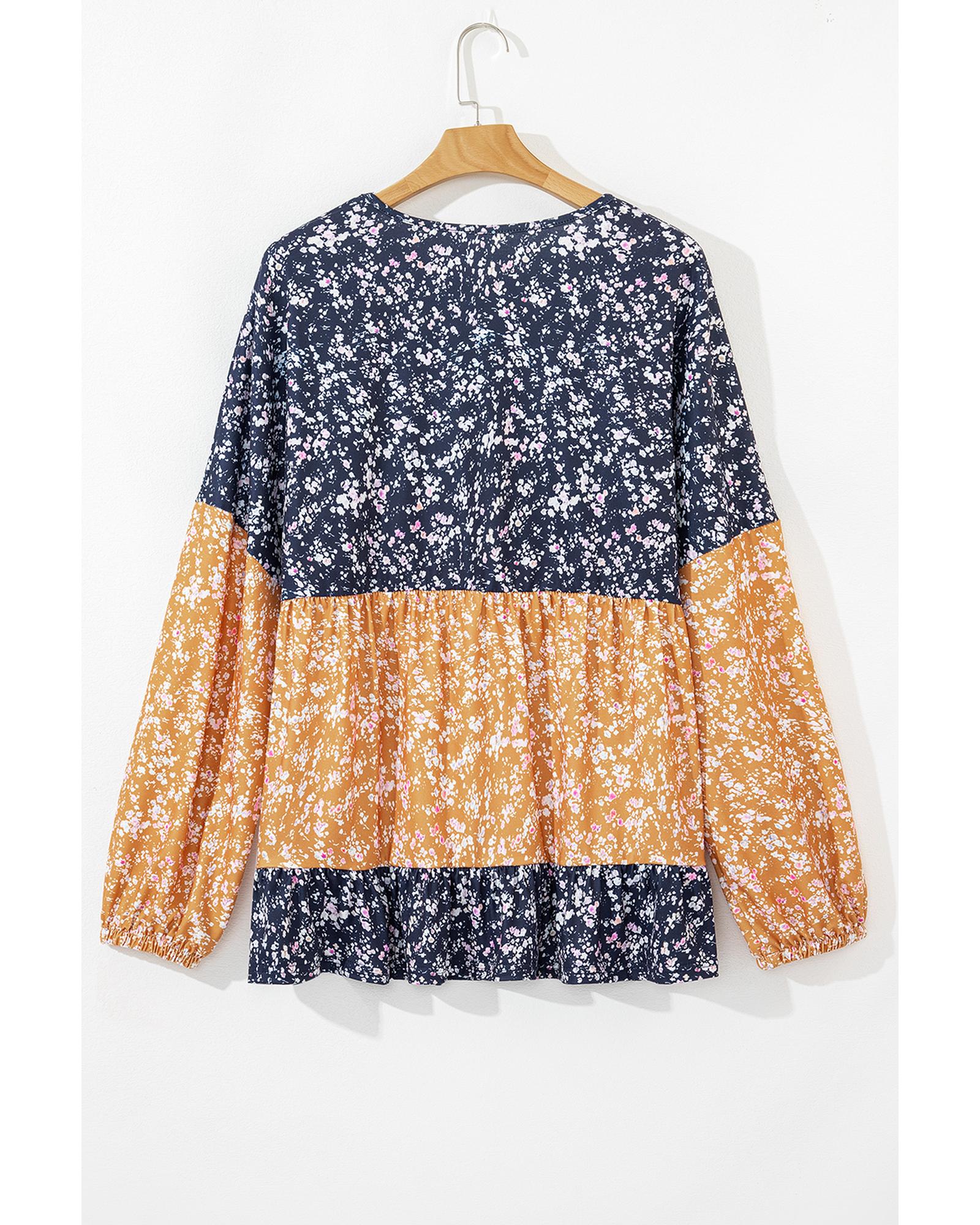 Blue Floral Color Block Patchwork Ruffled Hem Round Neck Blouse – L