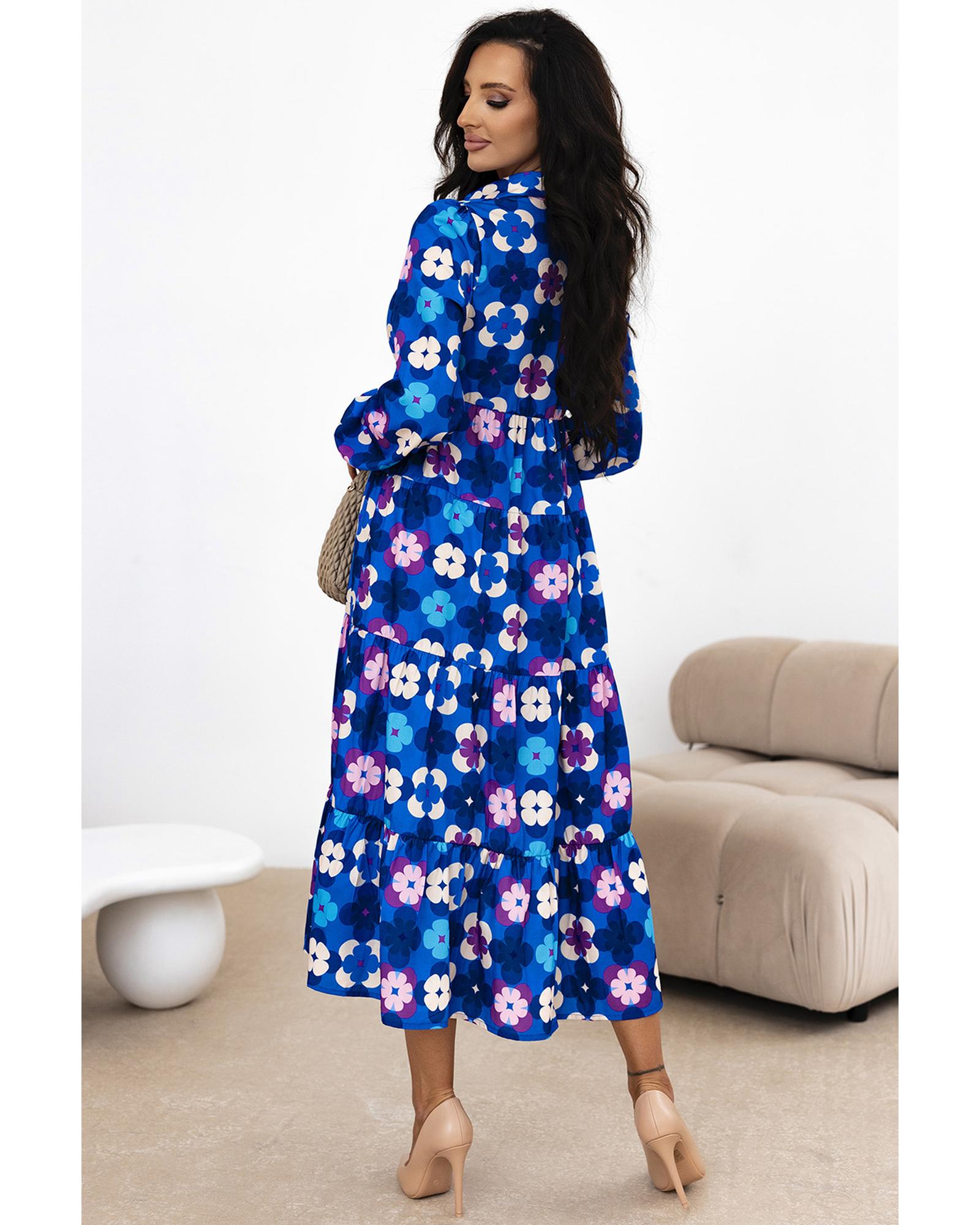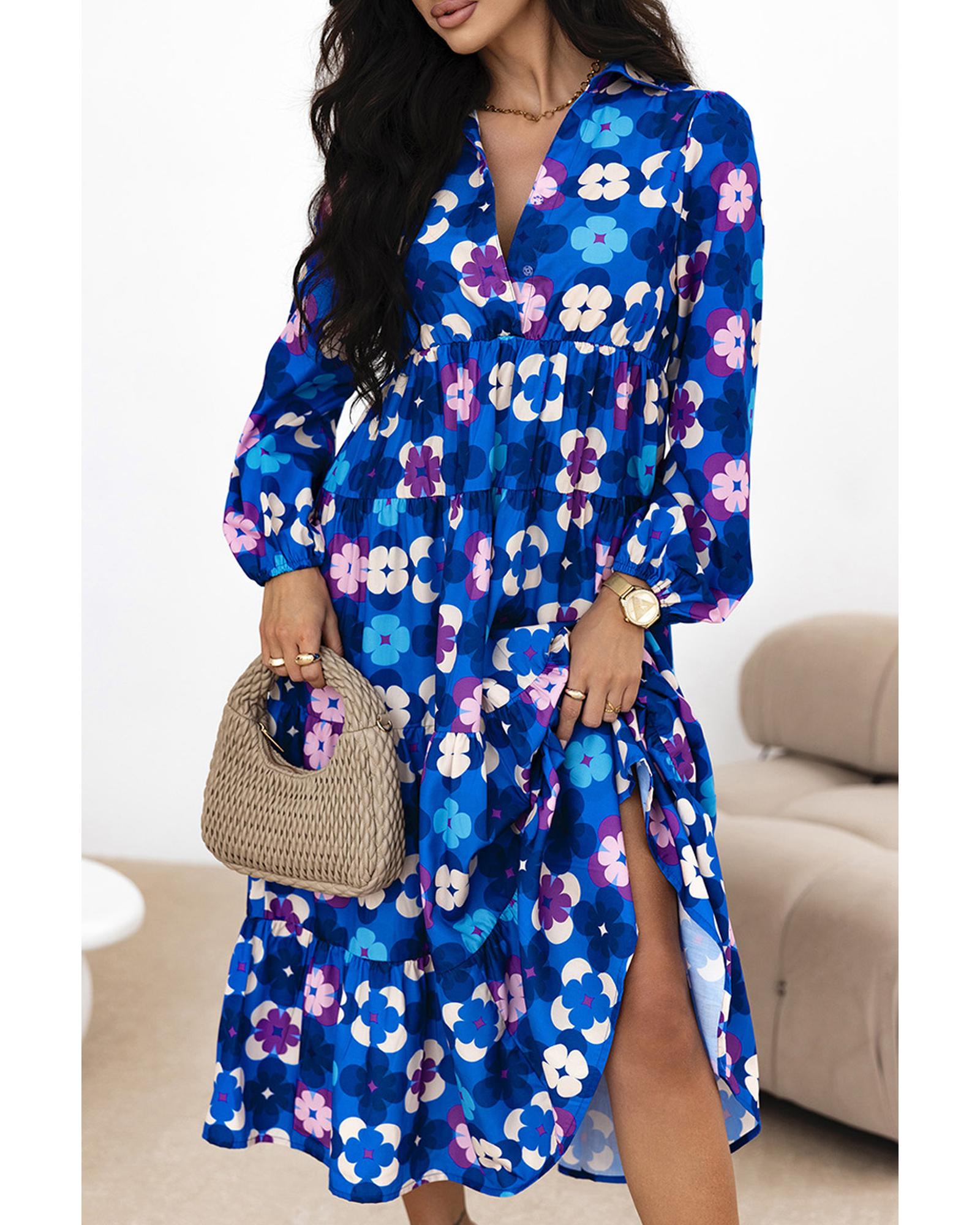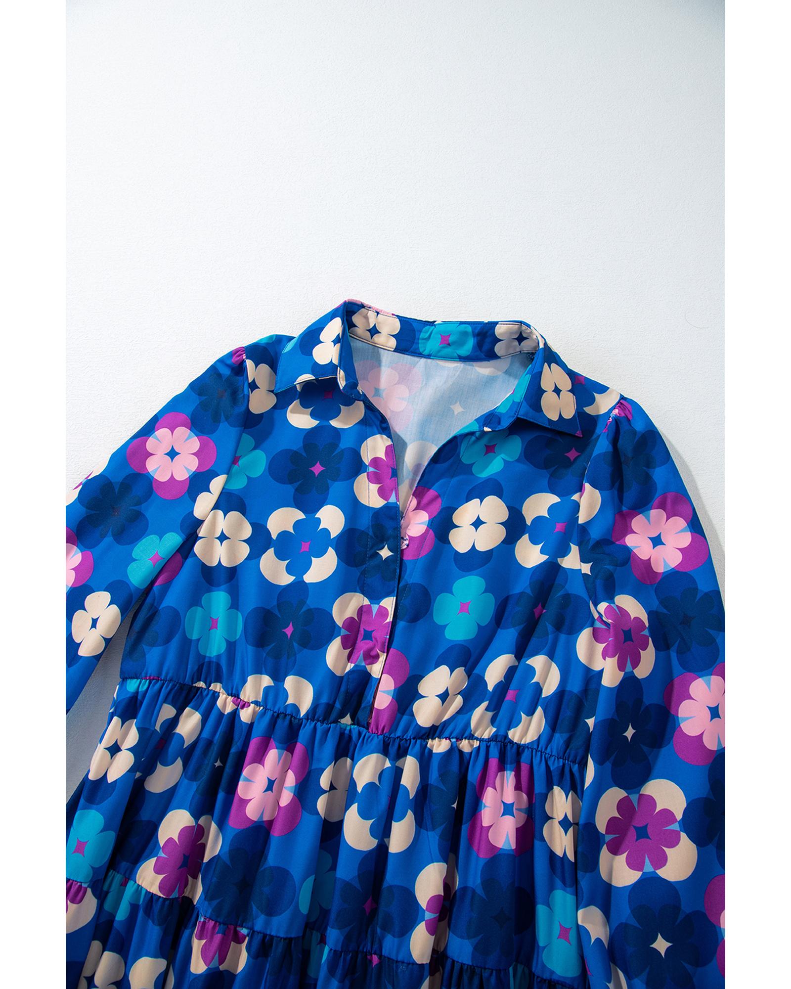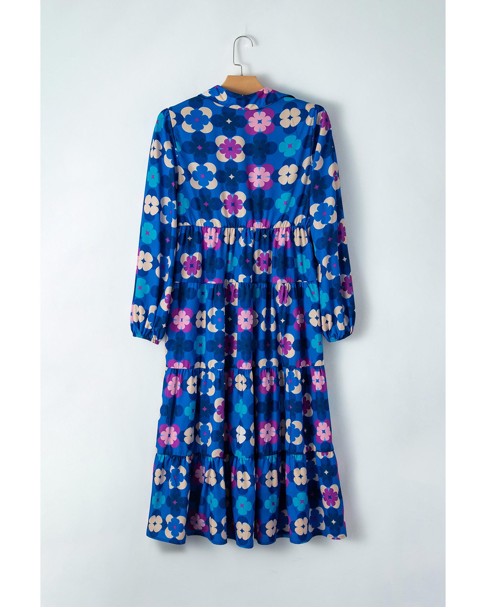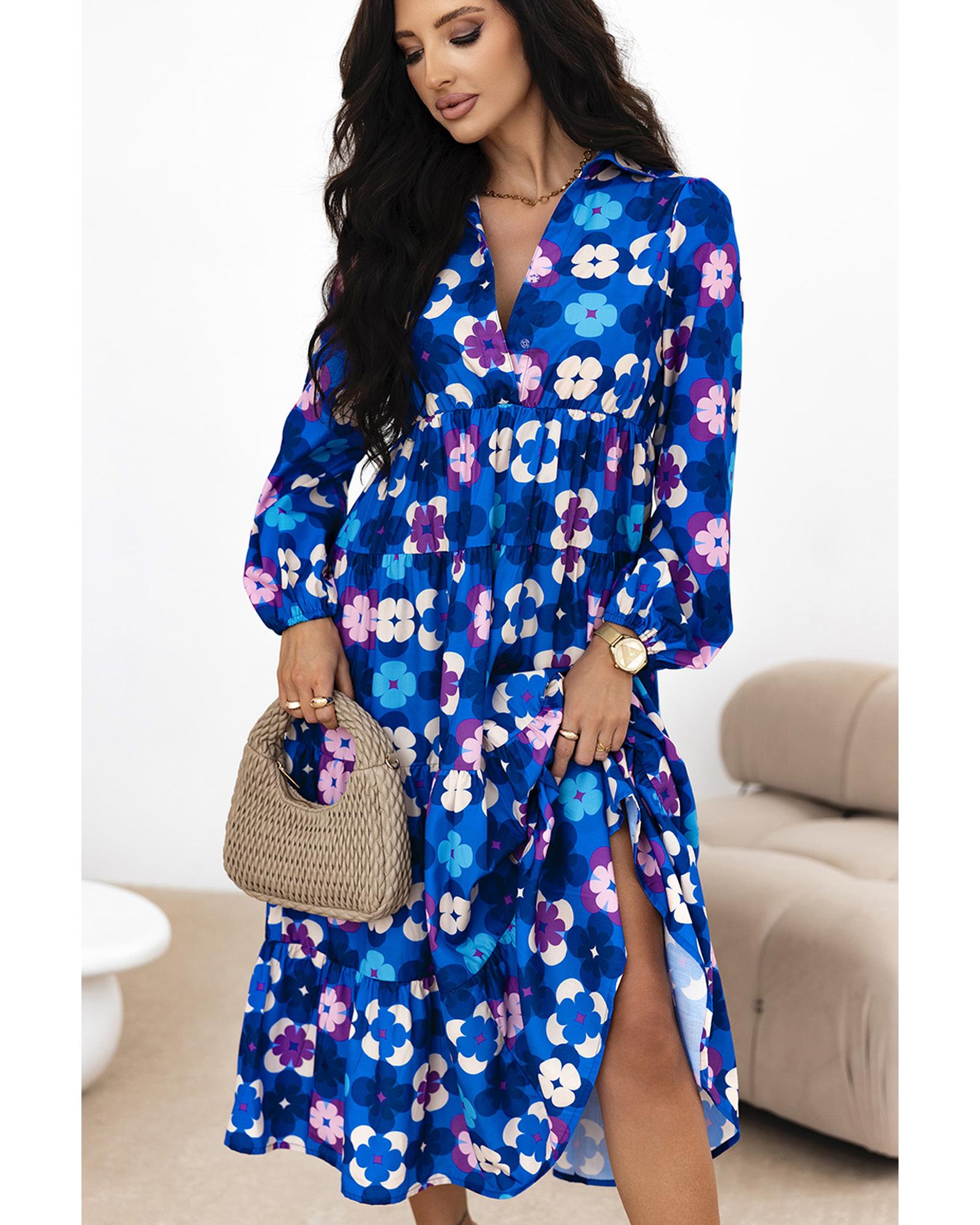 Blue Floral Peasant Sleeve Tiered Ruffle Midi Dress – S