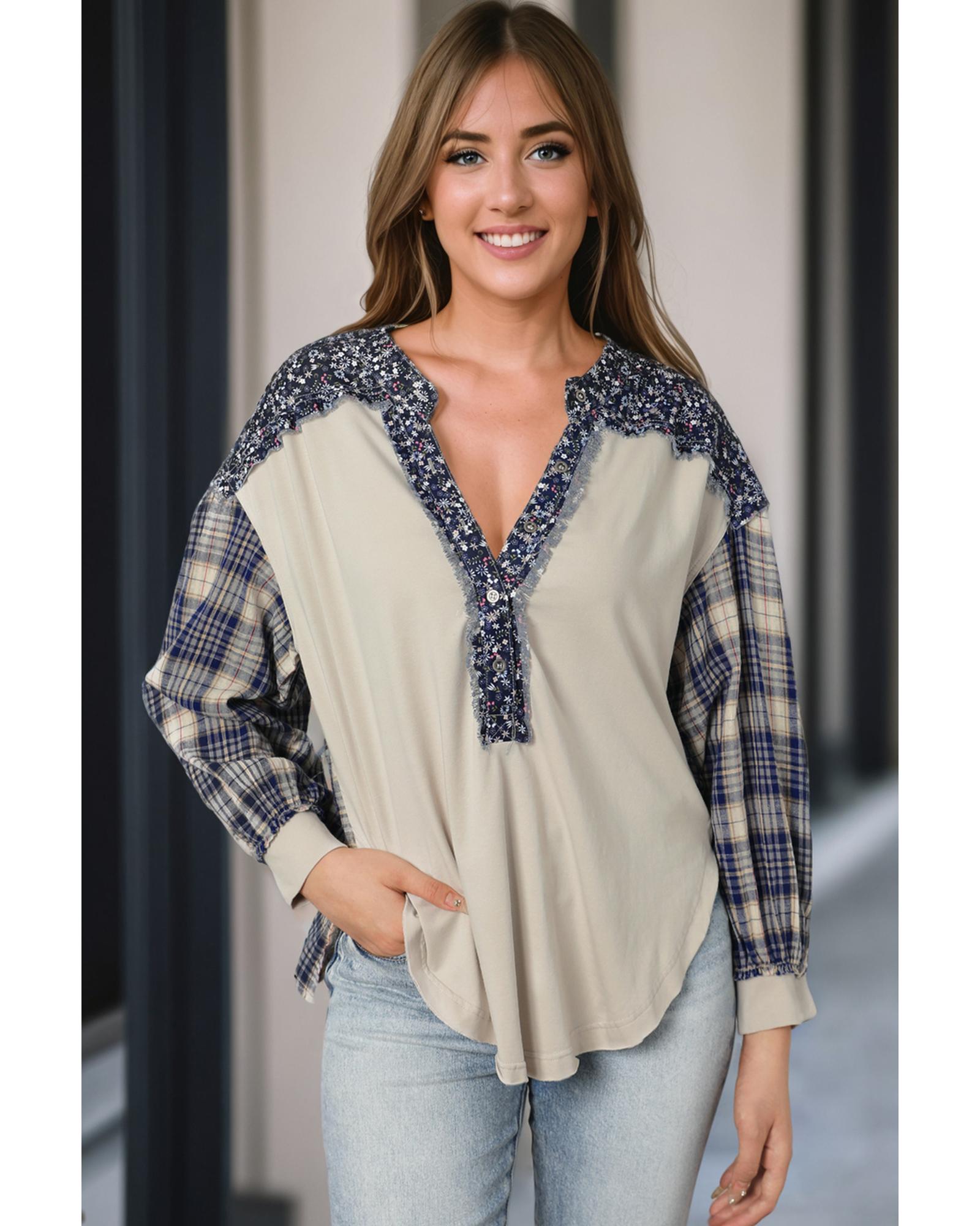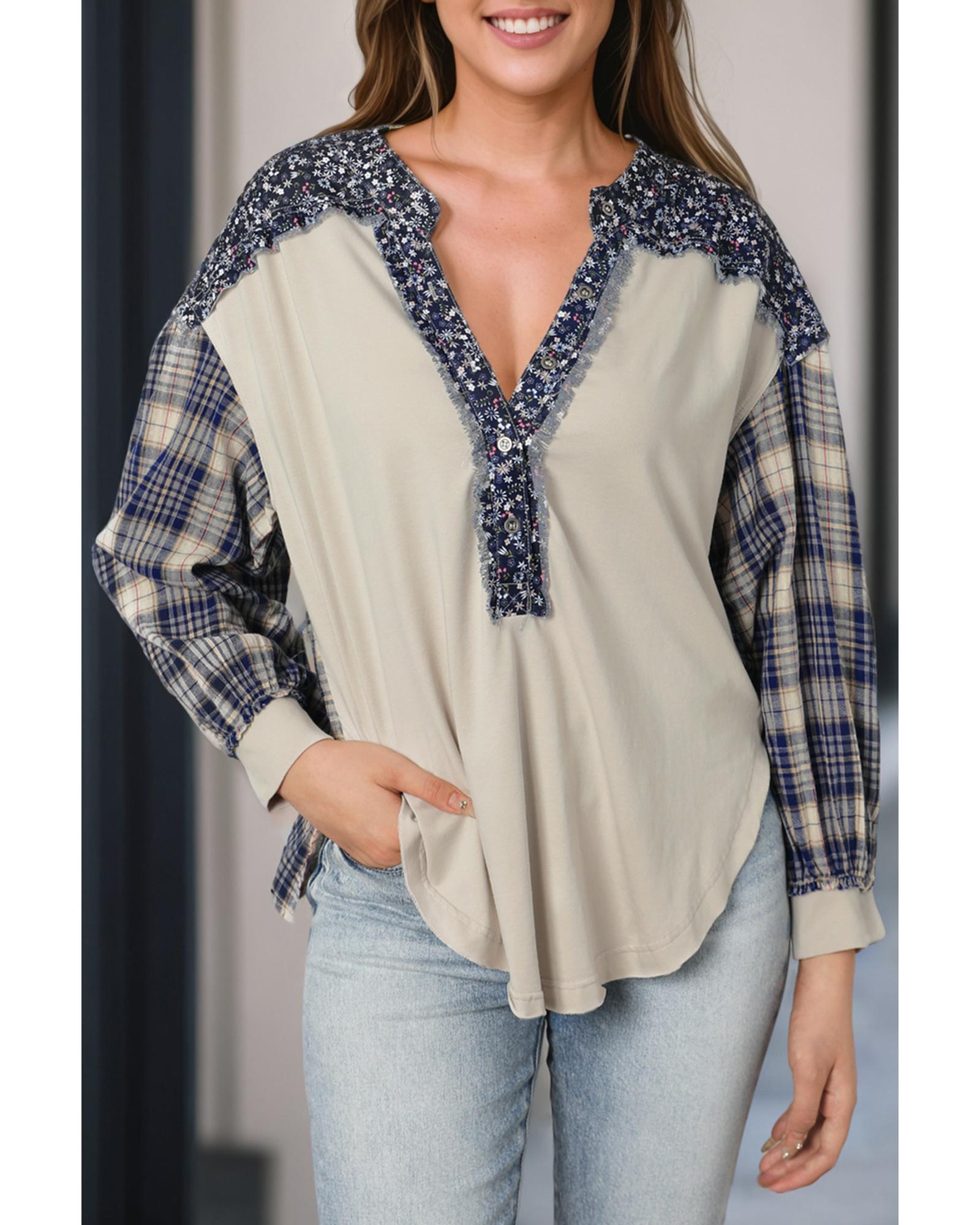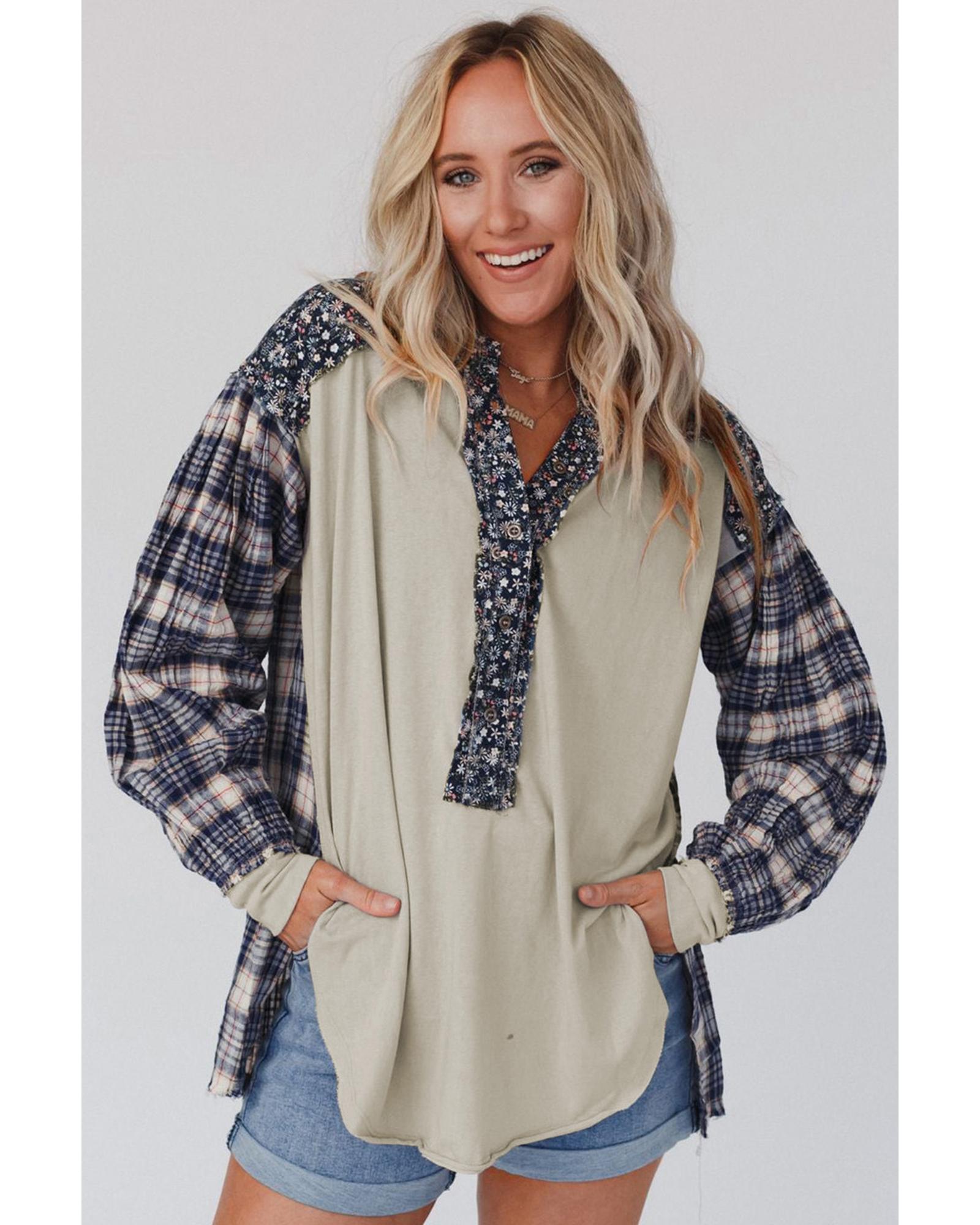 Blue Floral Plaid Mixed Print Bishop Sleeve Patchwork Top – M