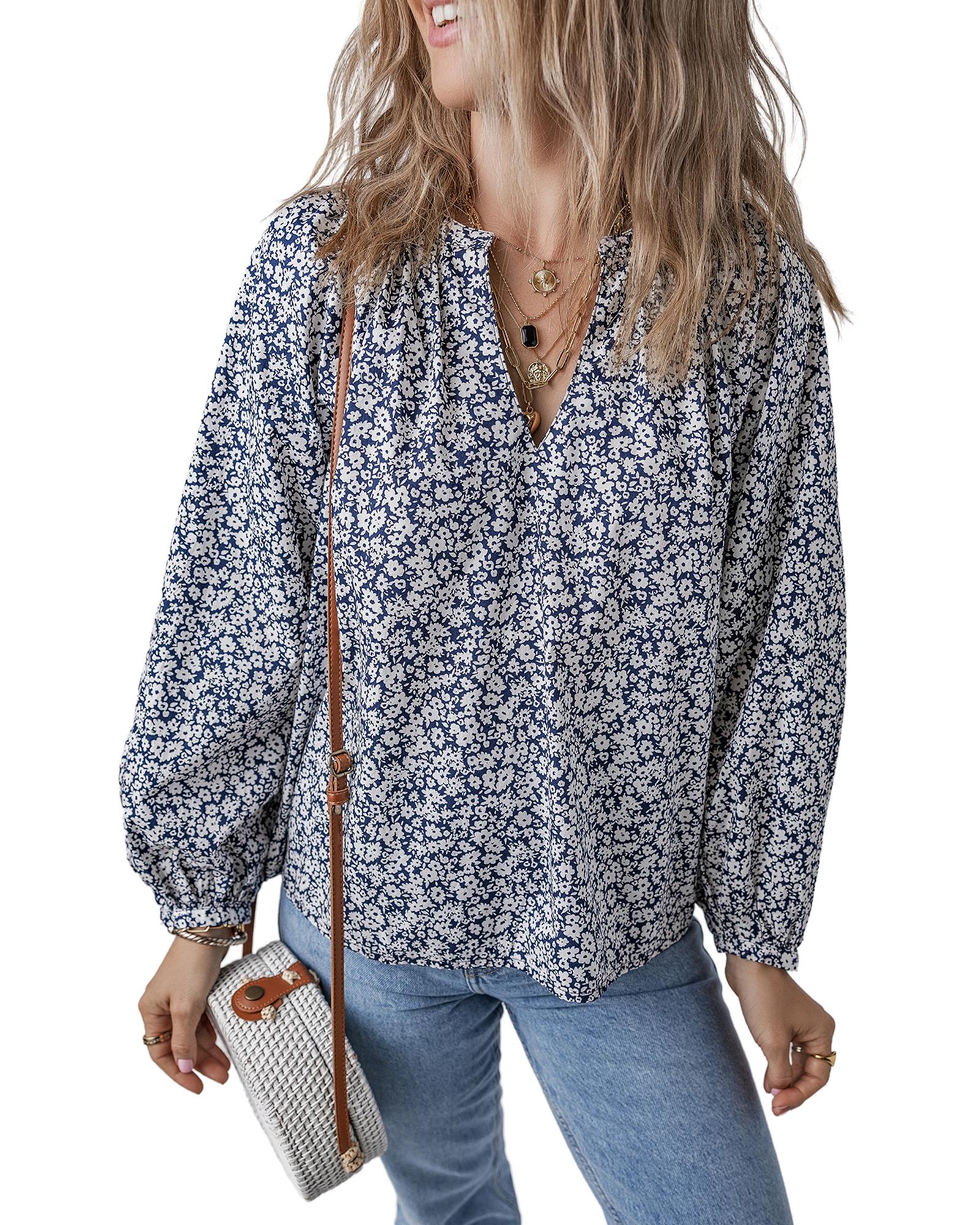 Blue Floral Print Notched V Neck Puff Sleeve Blouse – S