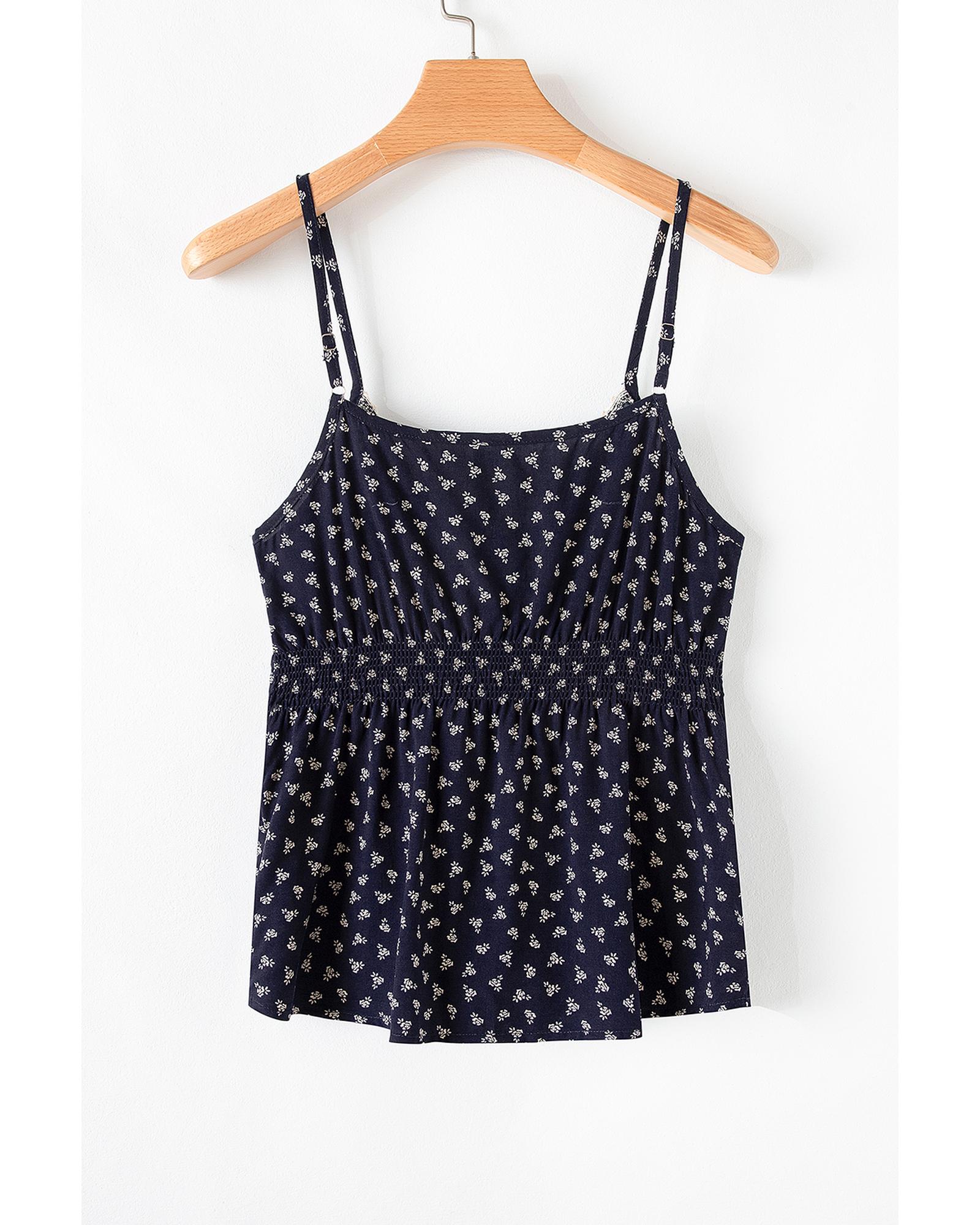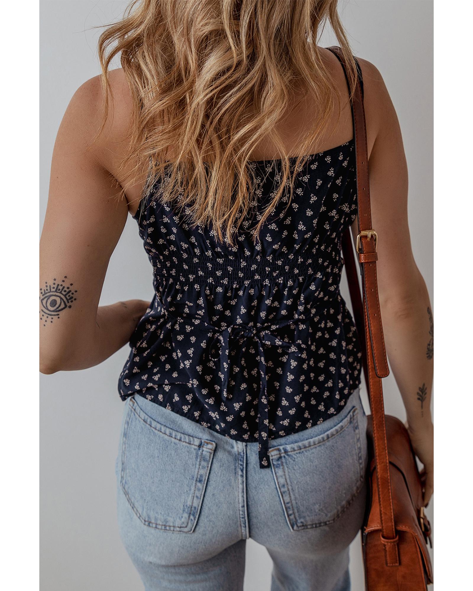 Blue Floral Print Spaghetti Strap Buttoned V Neck Tank Top – L