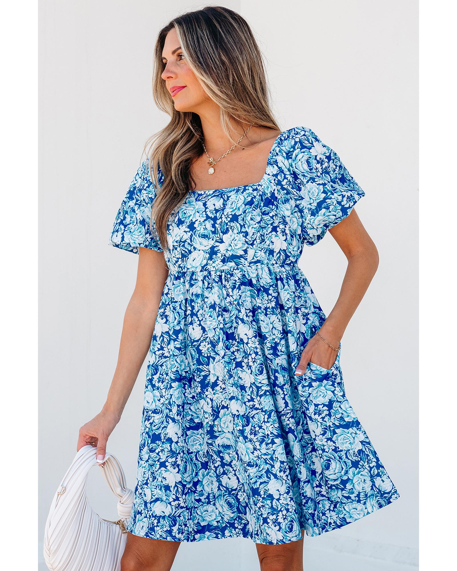 Blue Floral Puff Sleeve Babydoll Mini Dress – S