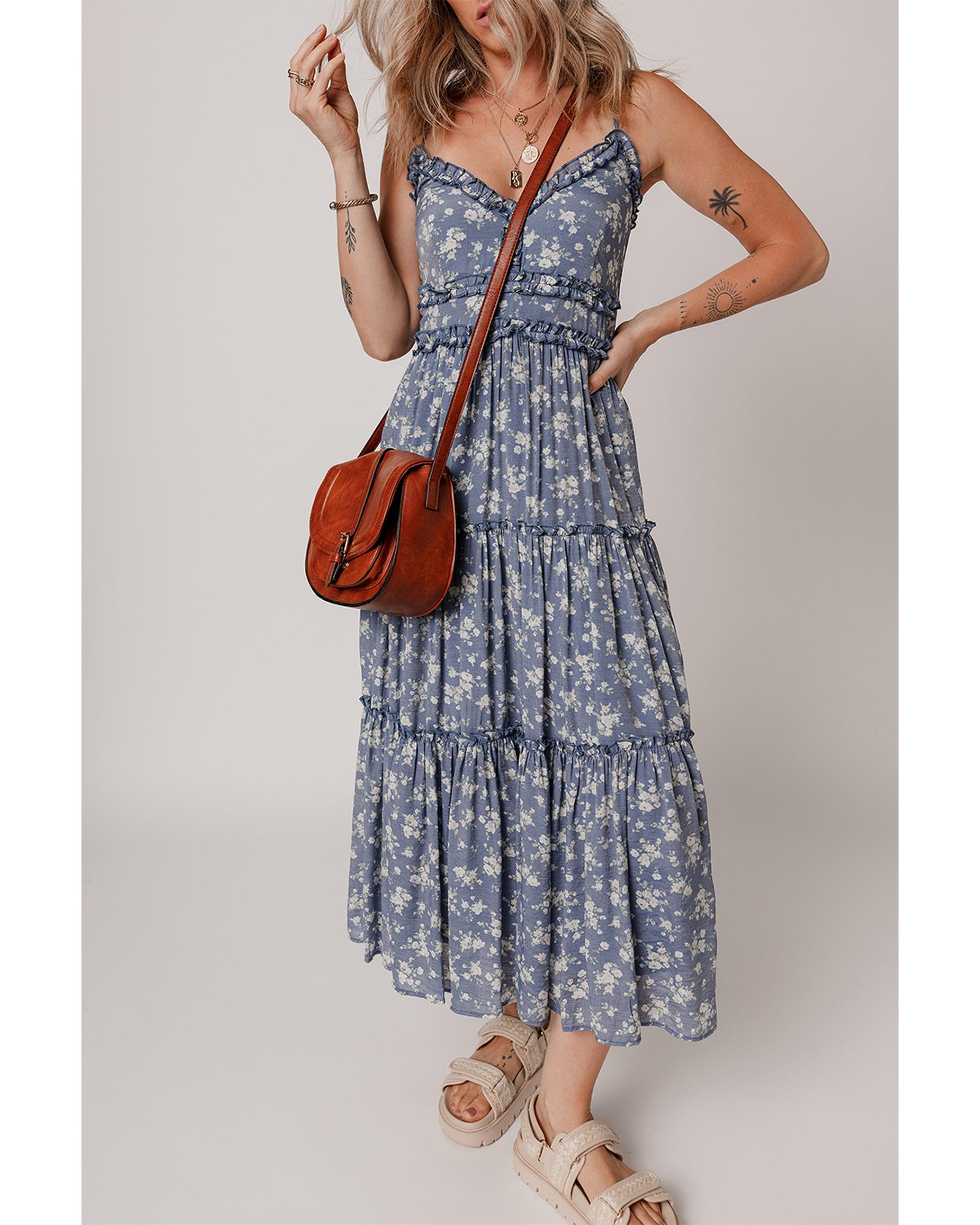 - Blue Floral Spaghetti Strap Frilled V Neck Tiered Midi Dress