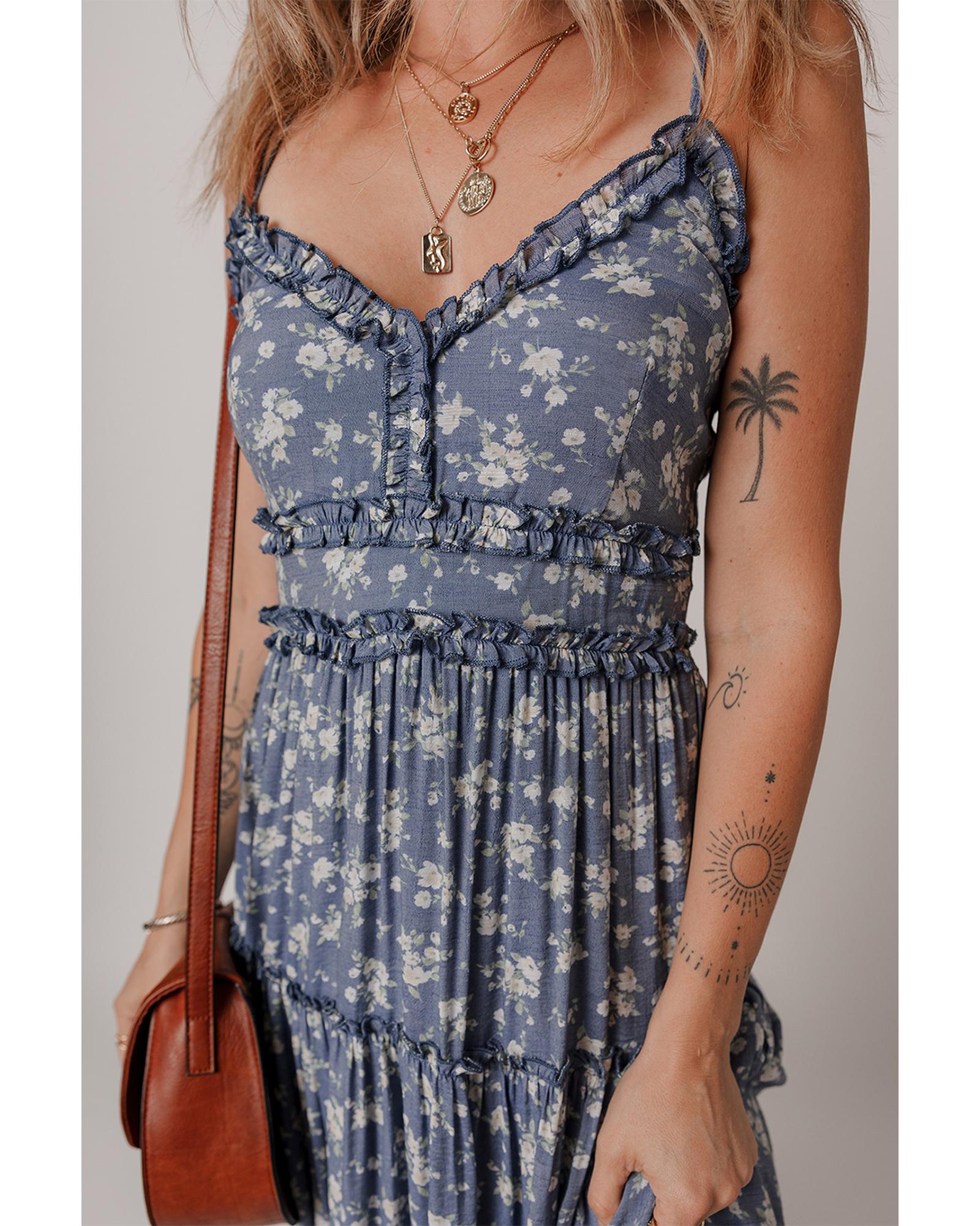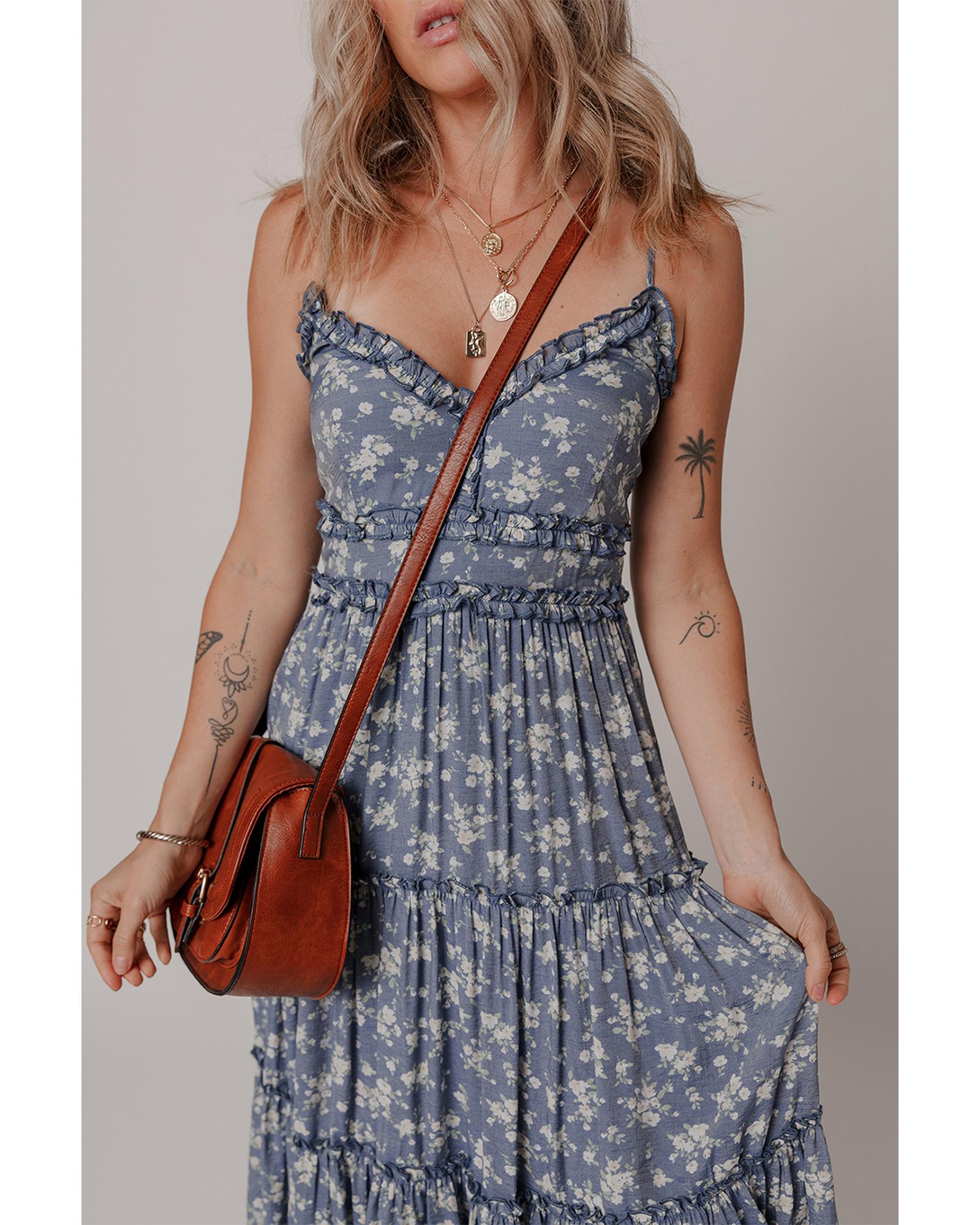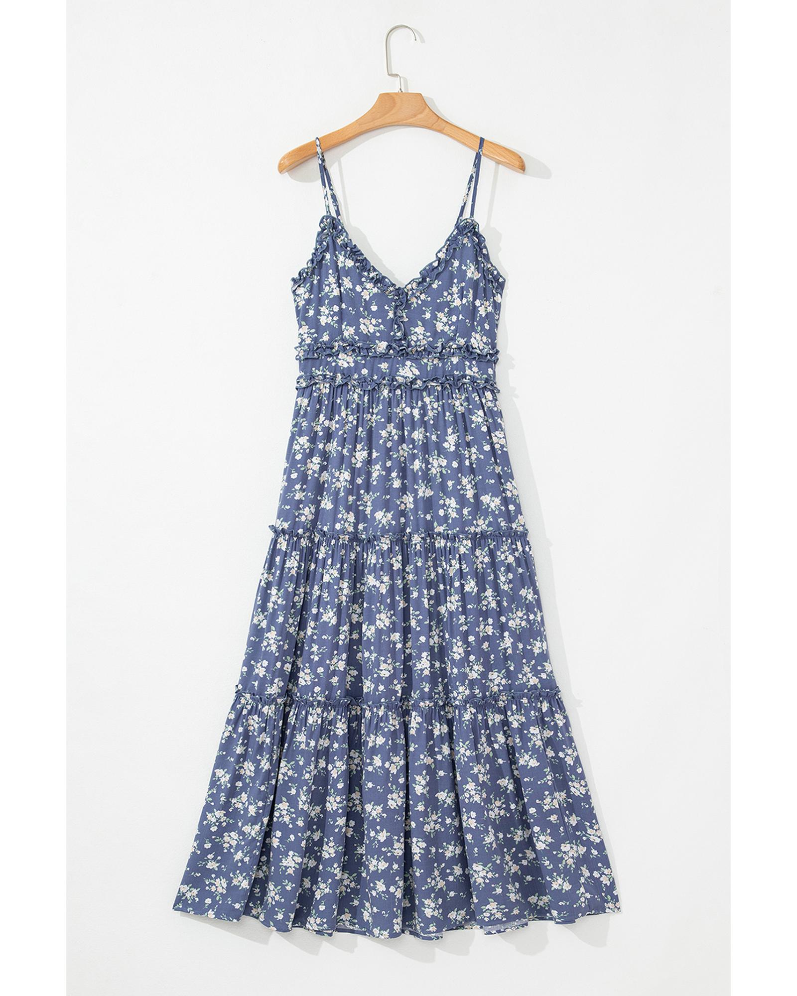 - Blue Floral Spaghetti Strap Frilled V Neck Tiered Midi Dress