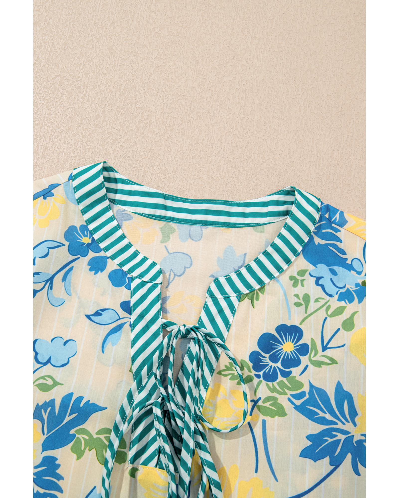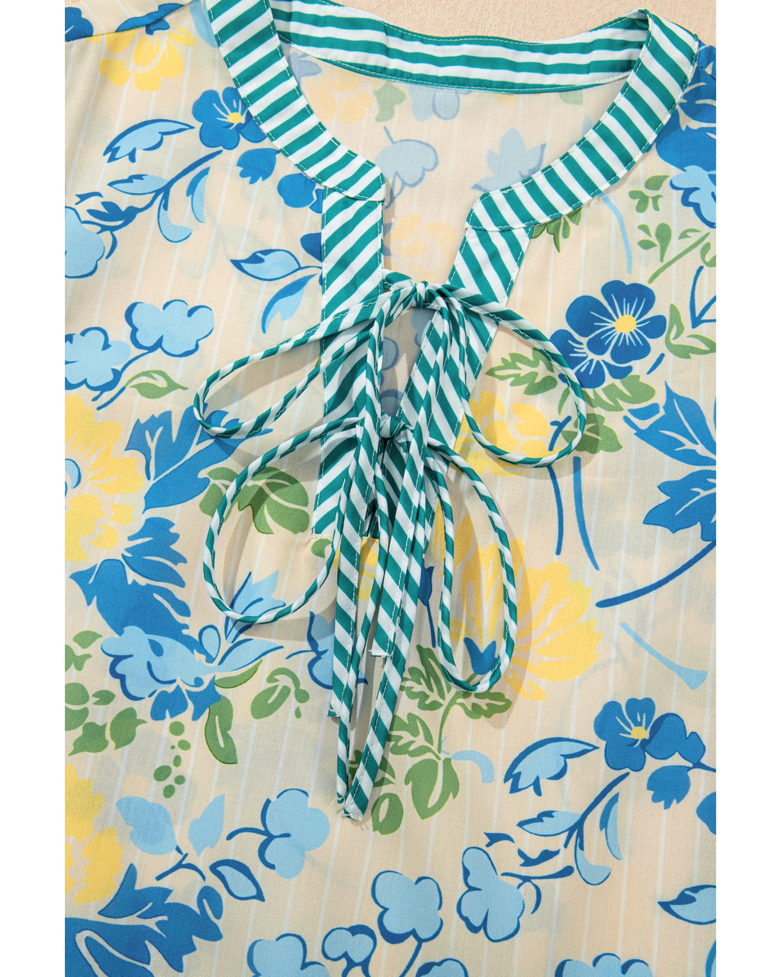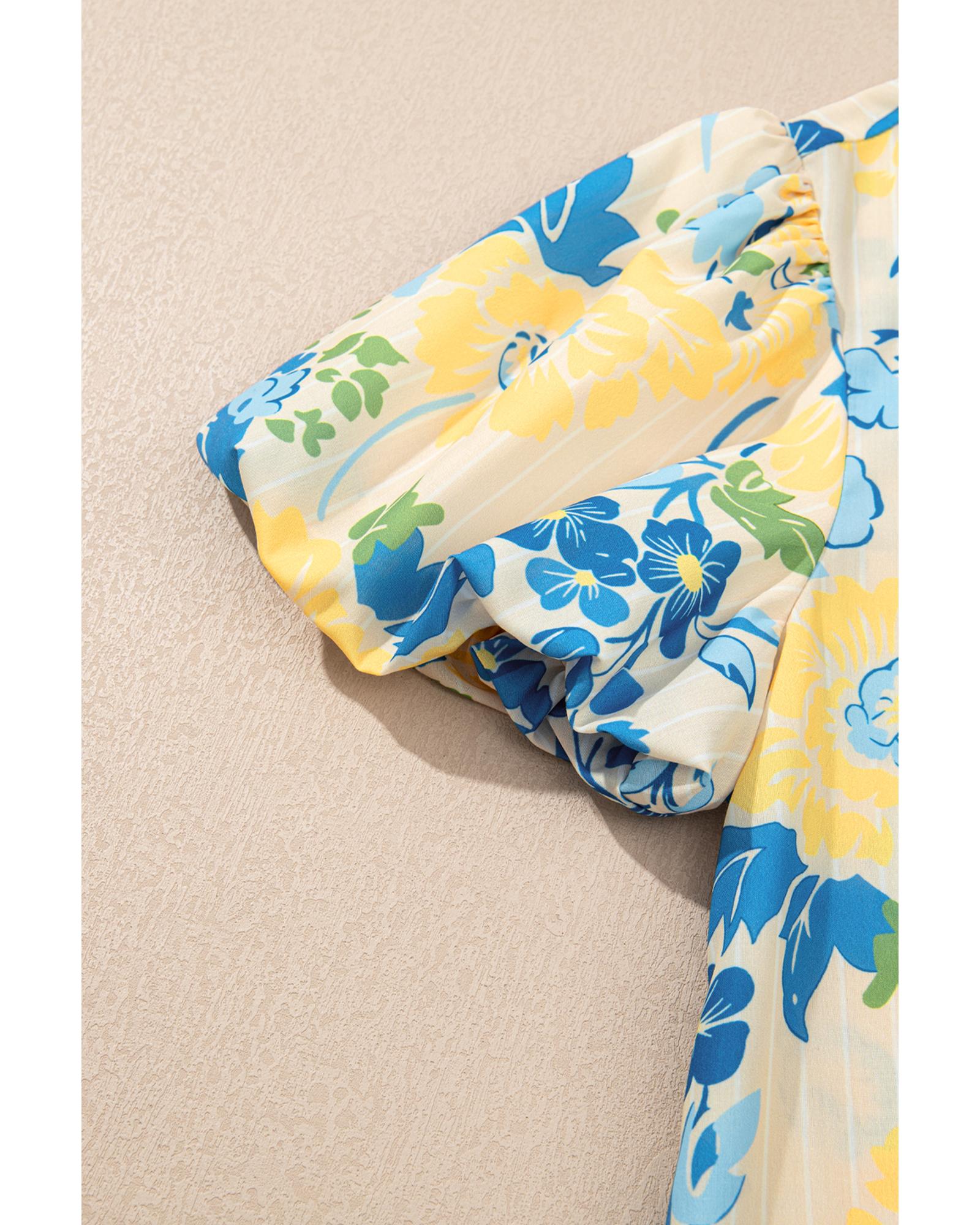 Blue Floral Striped Trim Puff Short Sleeve Dress – XL