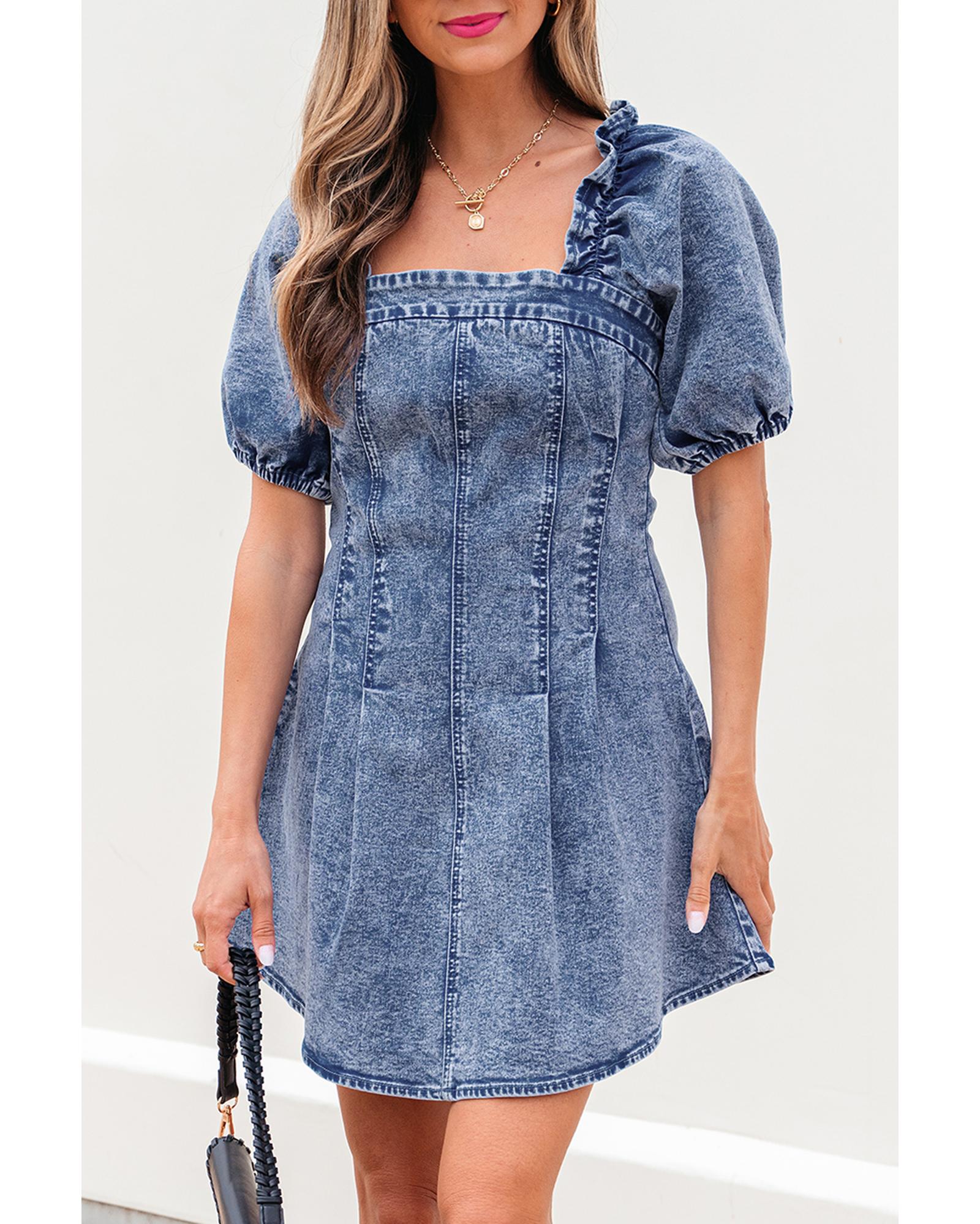 Blue Frilly Square Neck Bustier Puff Sleeve Short Denim Dress – XL