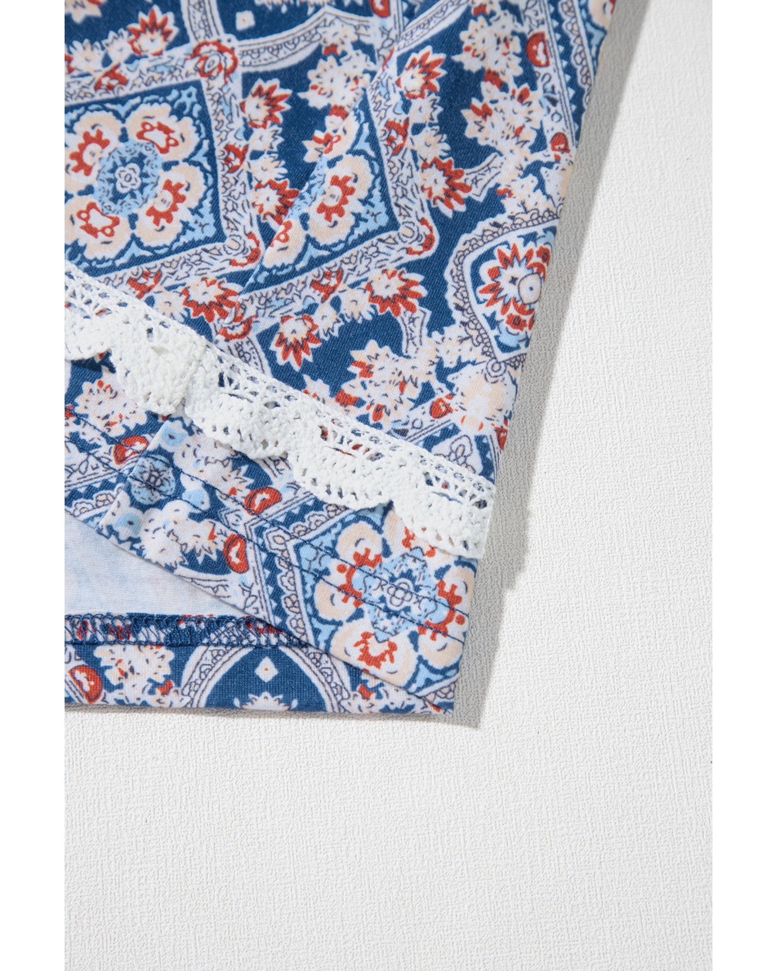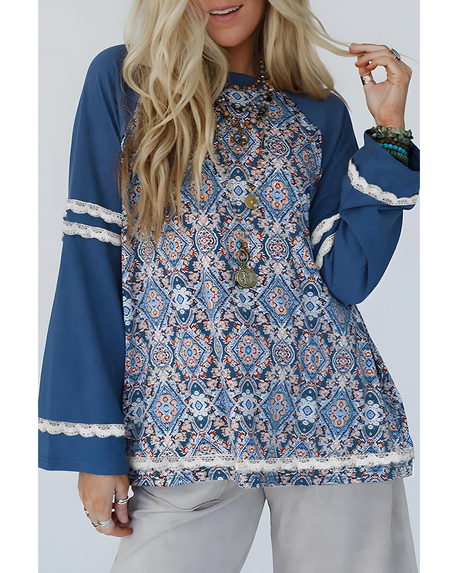 Blue Geometric Printed Lace Patchwork Ric Rac Raglan Long Sleeve Top – S