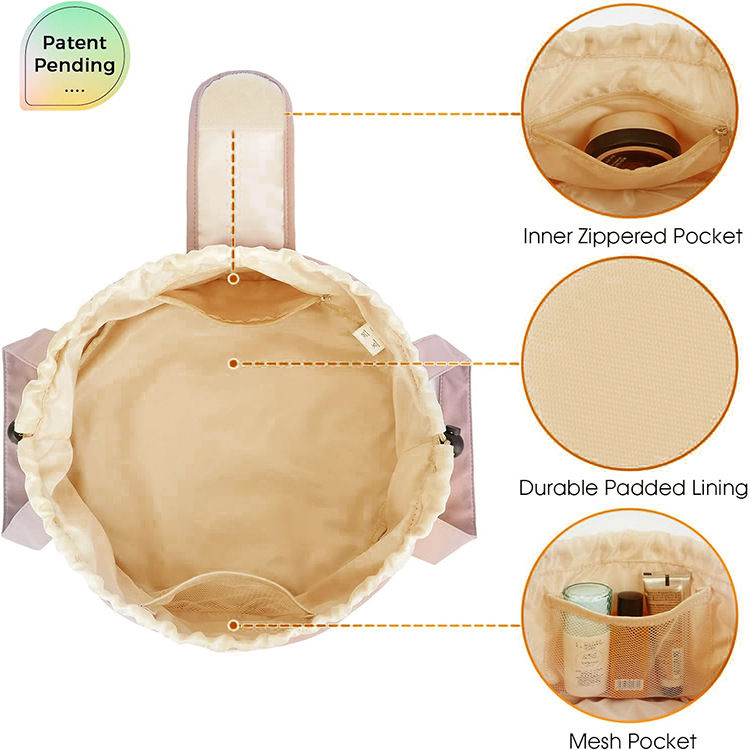 This cosmetic bag features a unique design that is currently pending patent approval, ensuring its exclusivity and practicality.