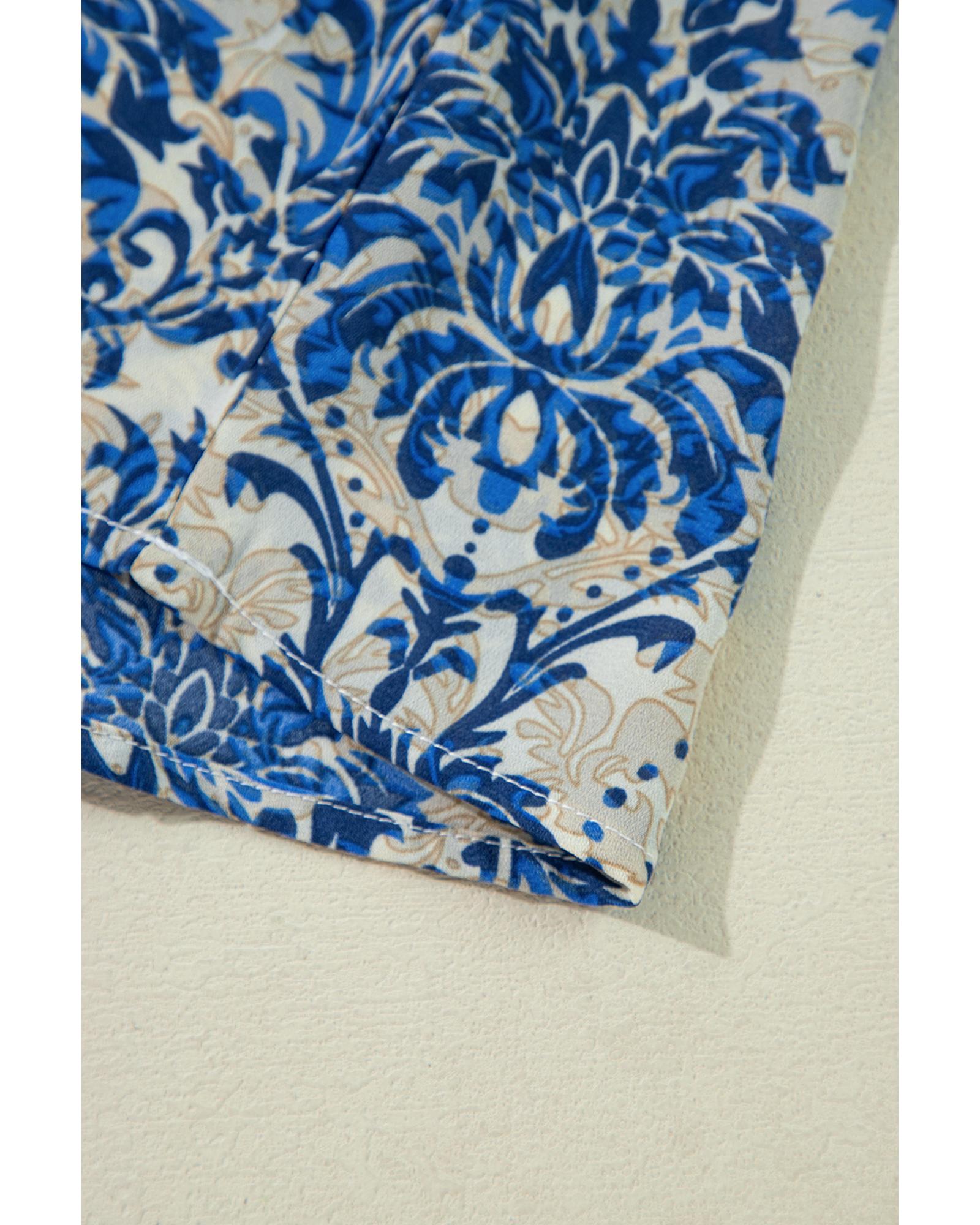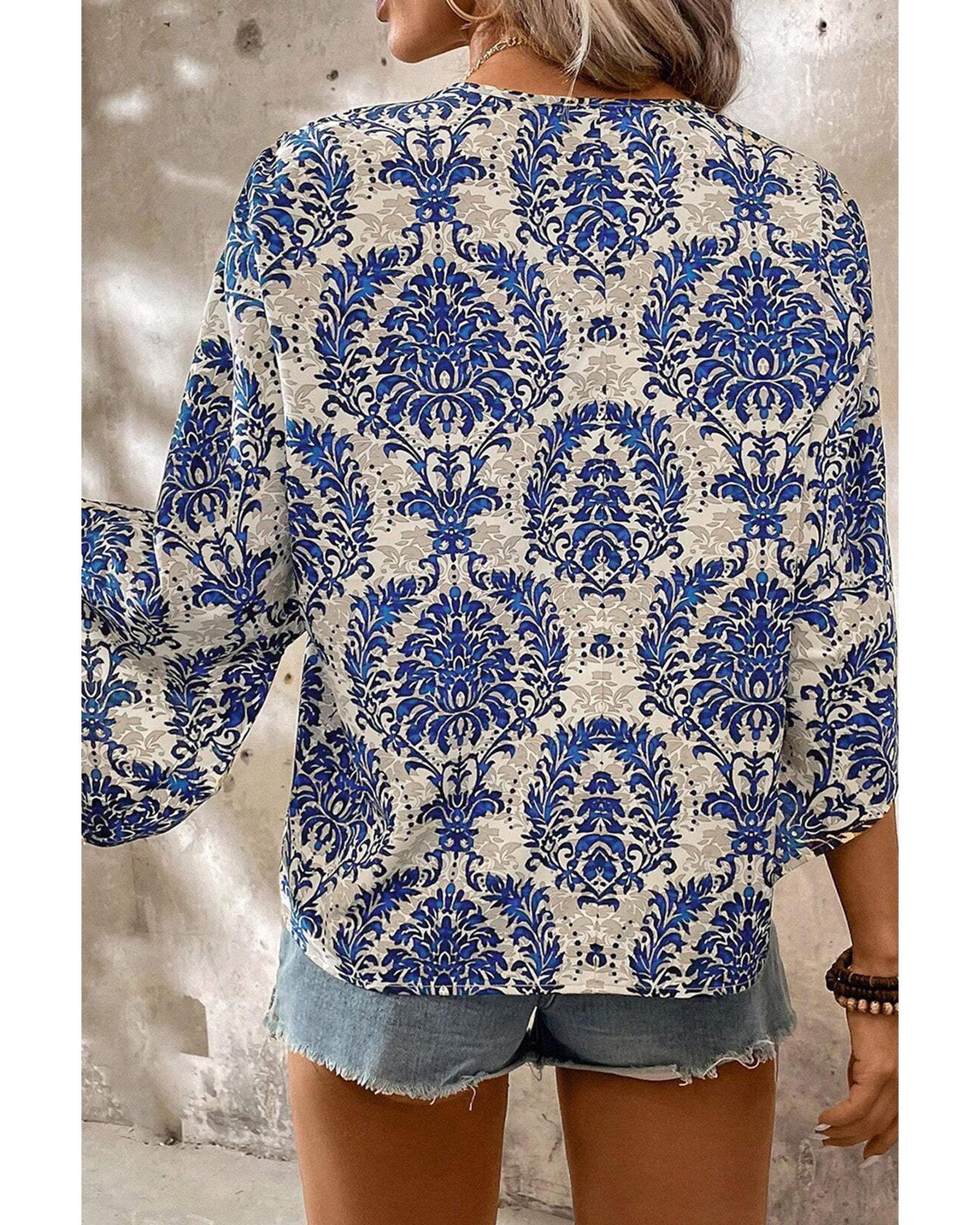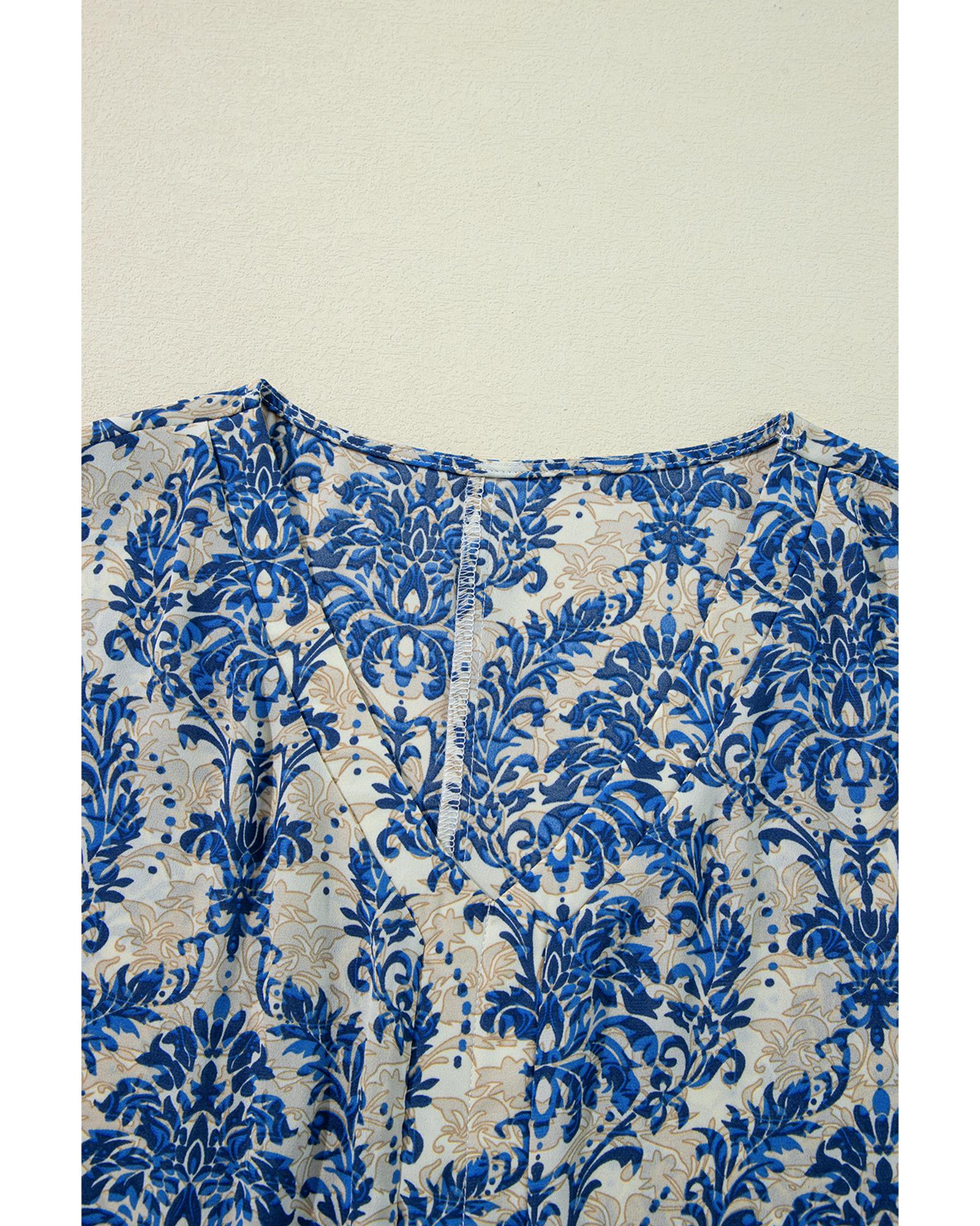 Blue Plus Size Ethnic Printed 3/4 Sleeve V Neck Loose Blouse – 2X