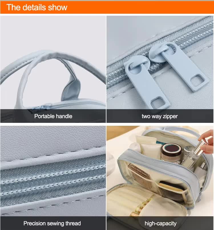 Blue Premium PU Leather Portable Makeup Bag – Large Capacity Waterproof Travel Cosmetic Organizer(Cosmetics are shooting props, not included)