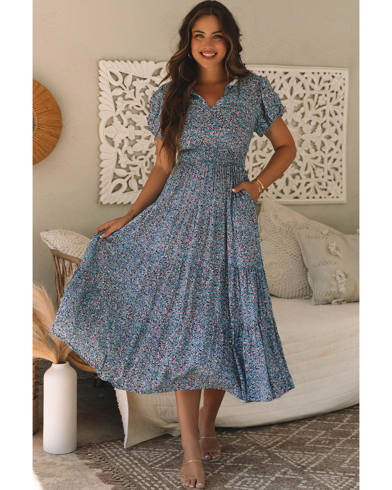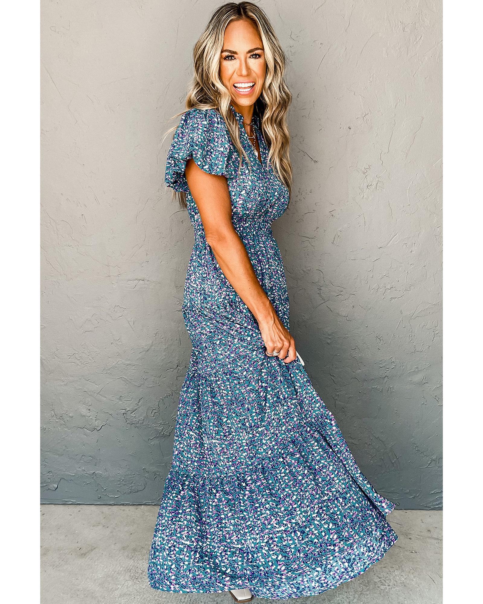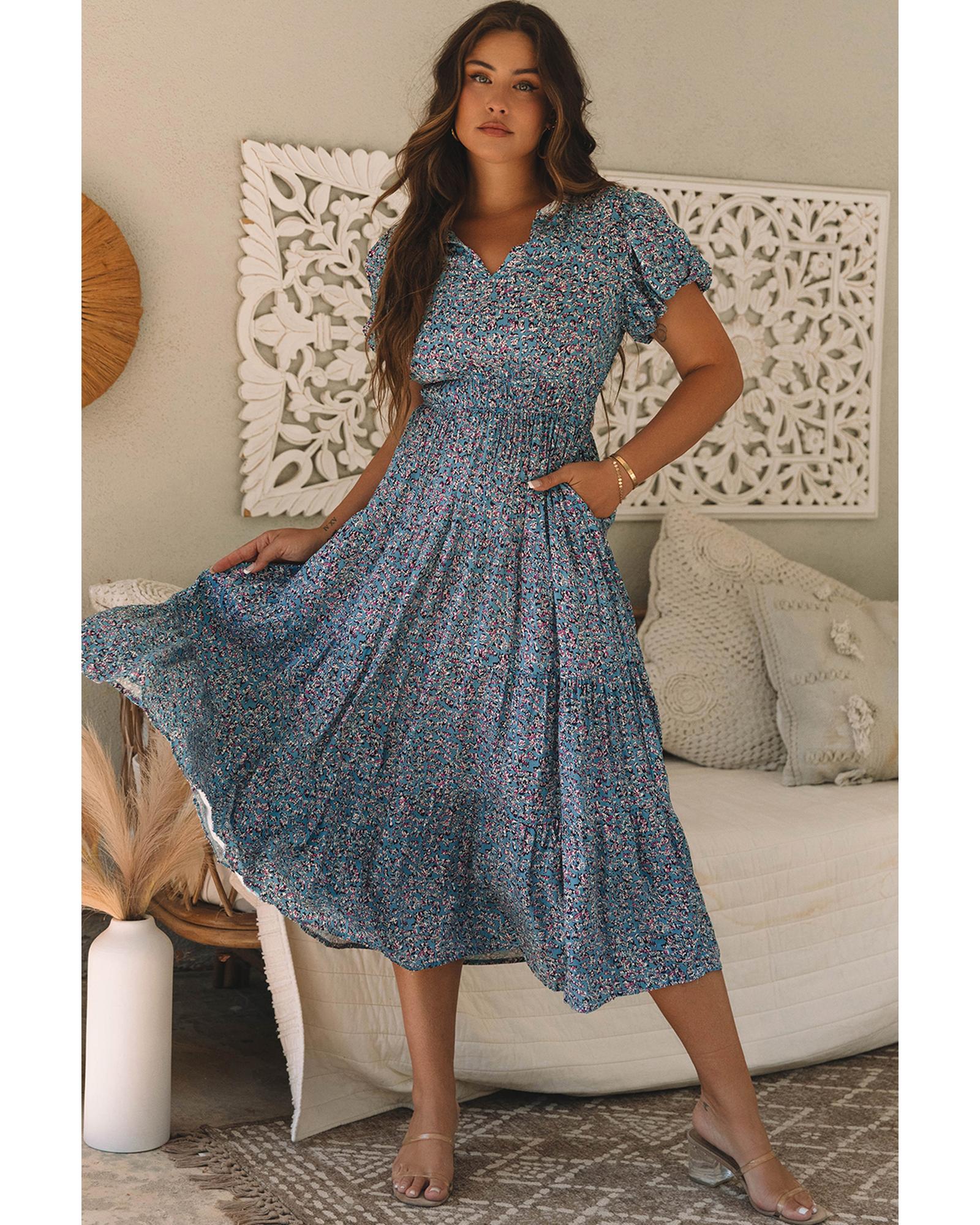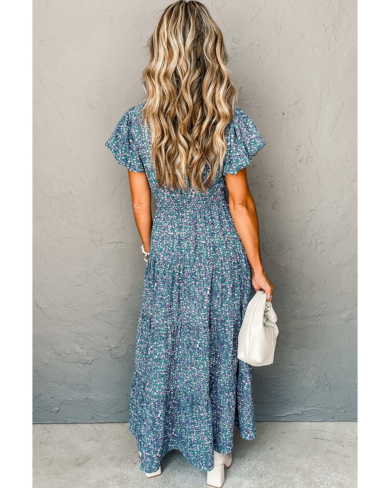 Blue Printed V Neck Shirred Short Puff Sleeve Maxi Dress – L