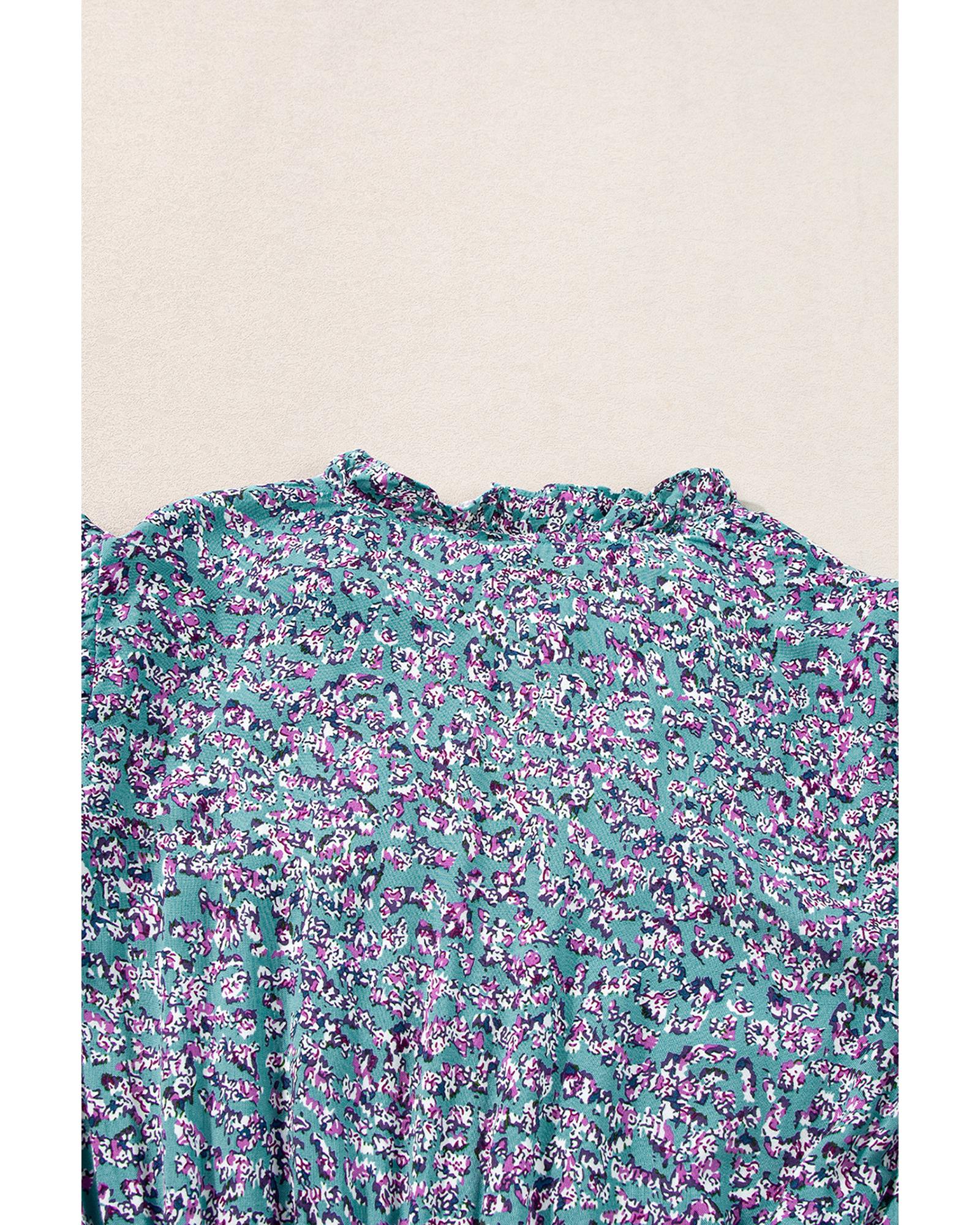 Blue Printed V Neck Shirred Short Puff Sleeve Maxi Dress – S