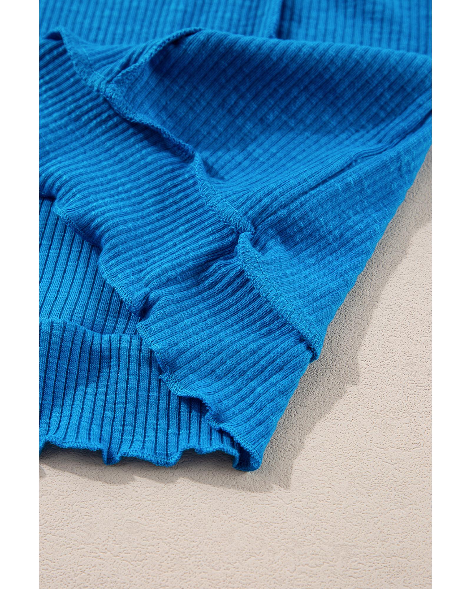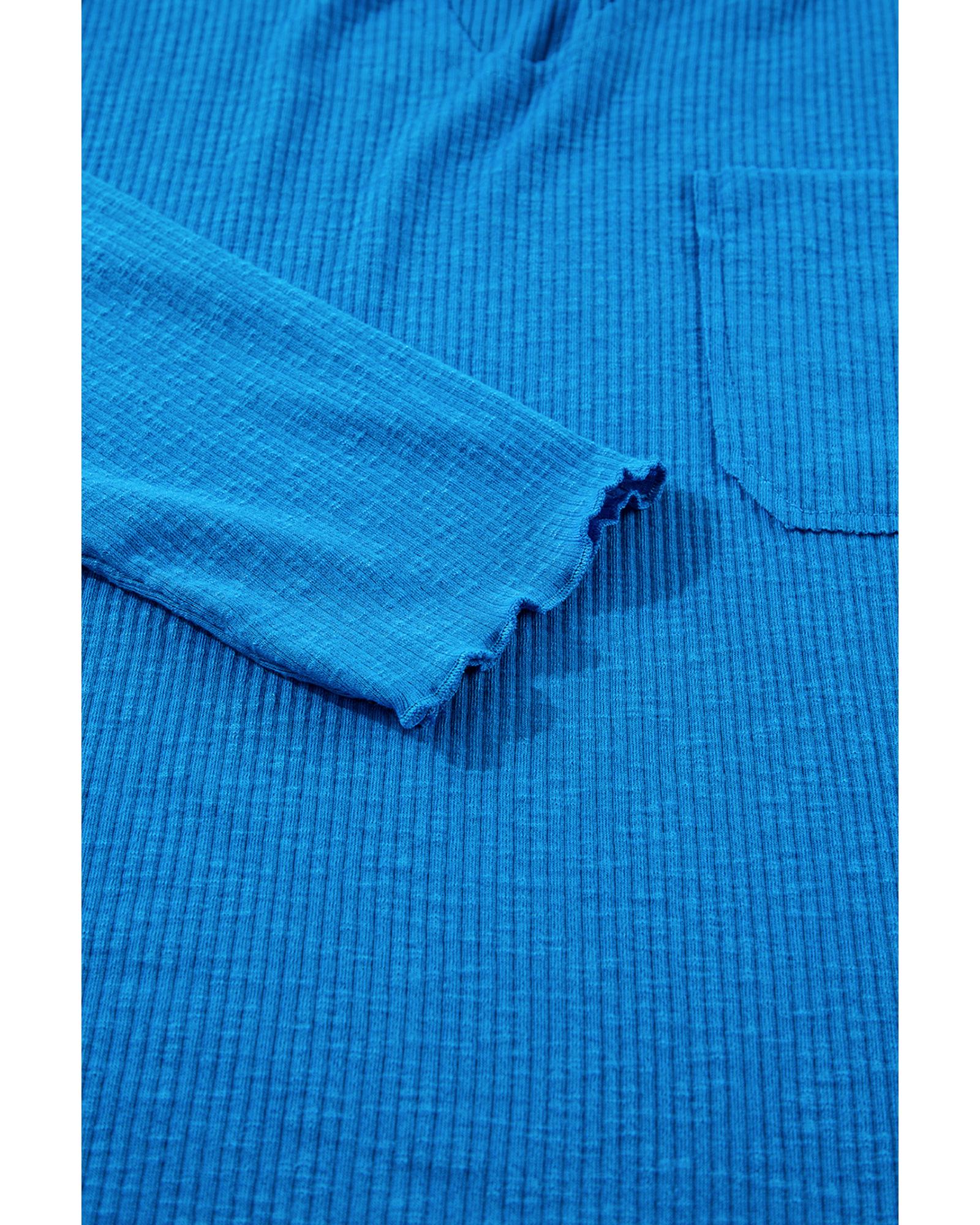 Blue Ribbed Exposed Seam Knit V Neck Long Sleeve Top – M