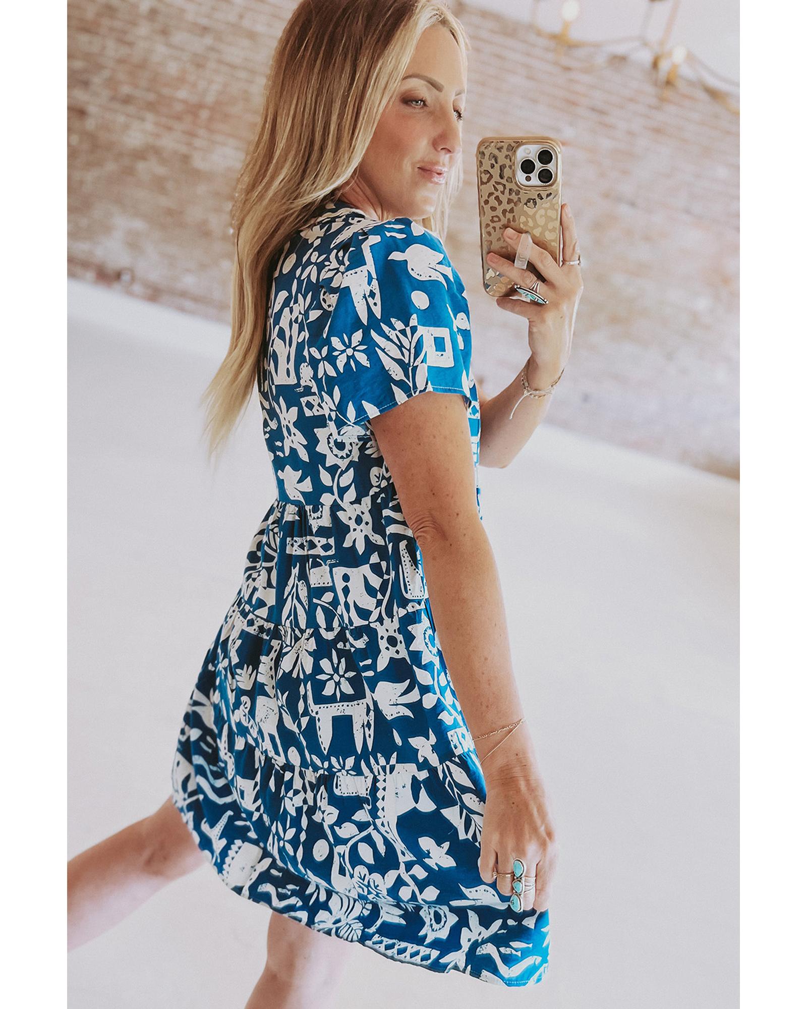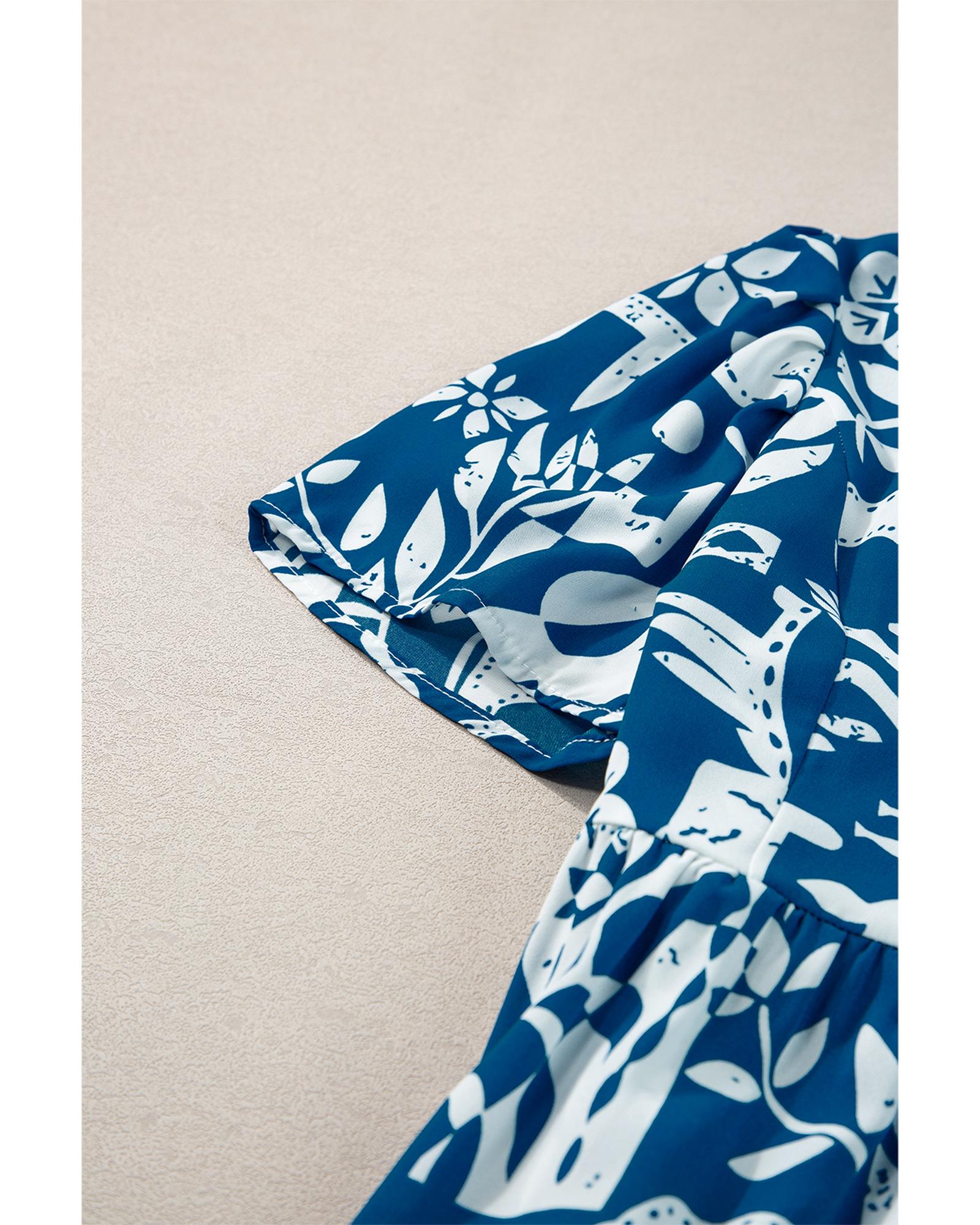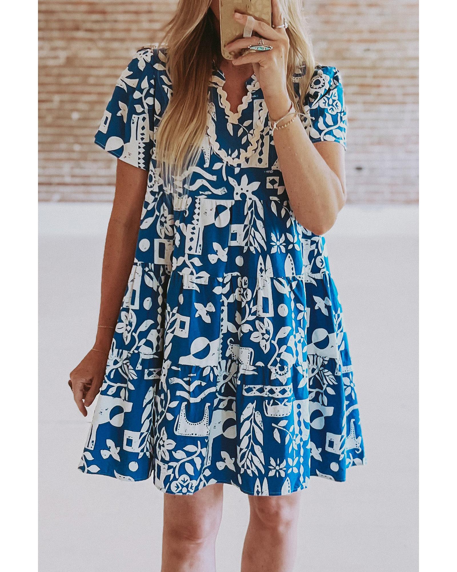 • Blue Ricrac Trim Split Neck Floral Loose Dress