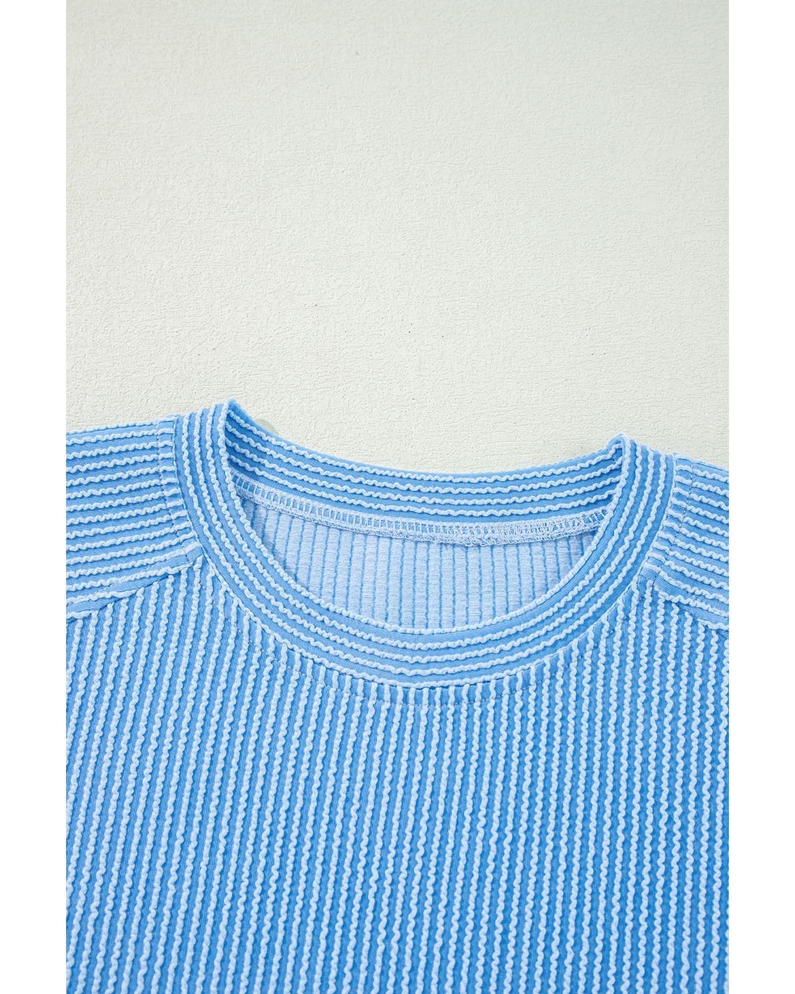 Blue Solid Corded Knit Short Sleeve T Shirt and Wide Leg Pants Set – S
