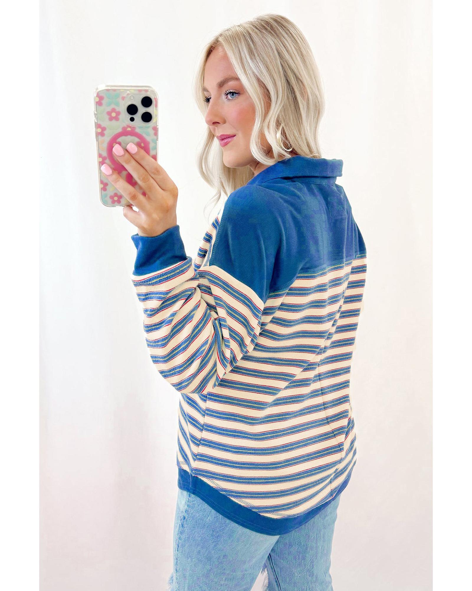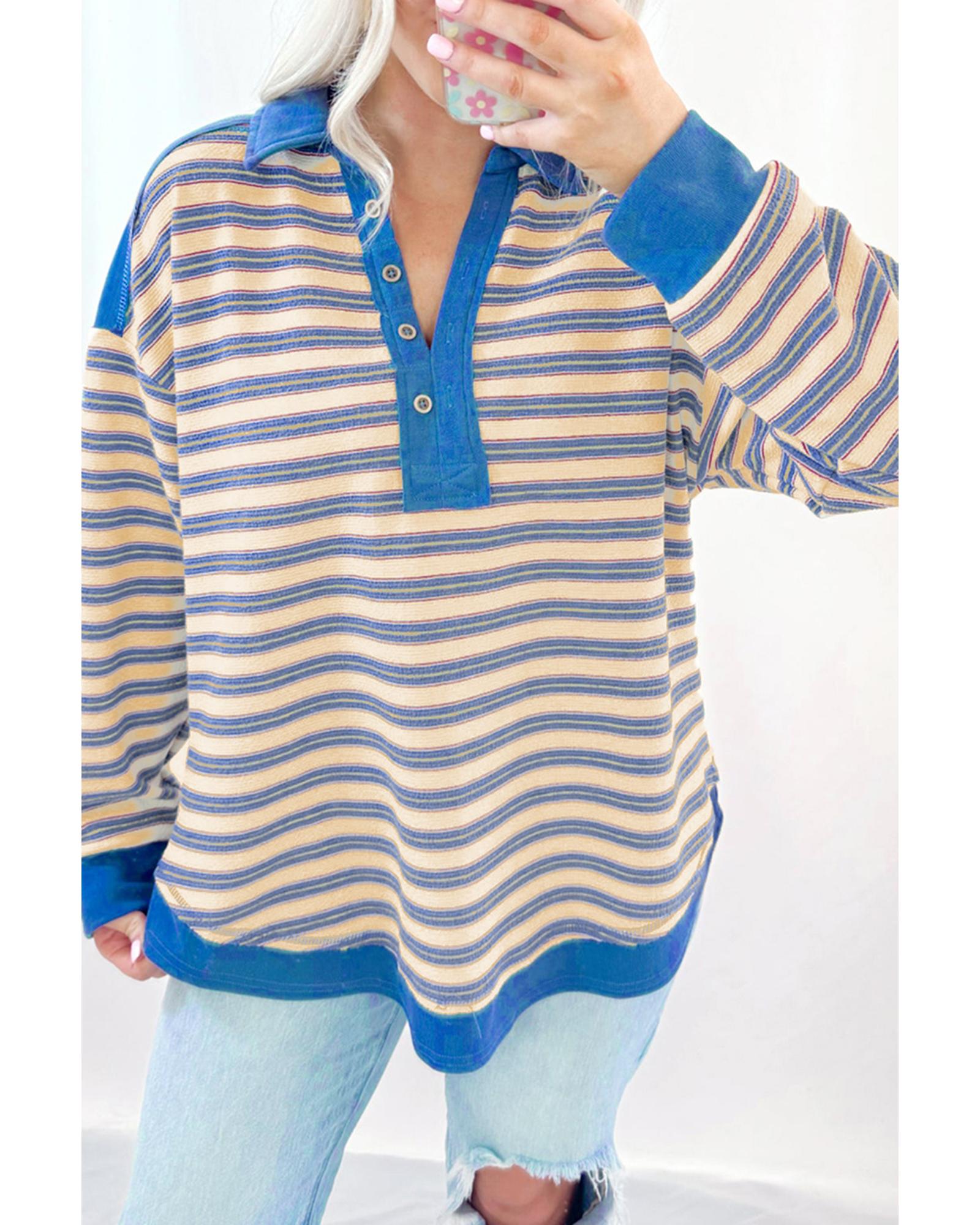 Blue Stripe Buttoned V Neck Collared Drop Shoulder Top – 2XL