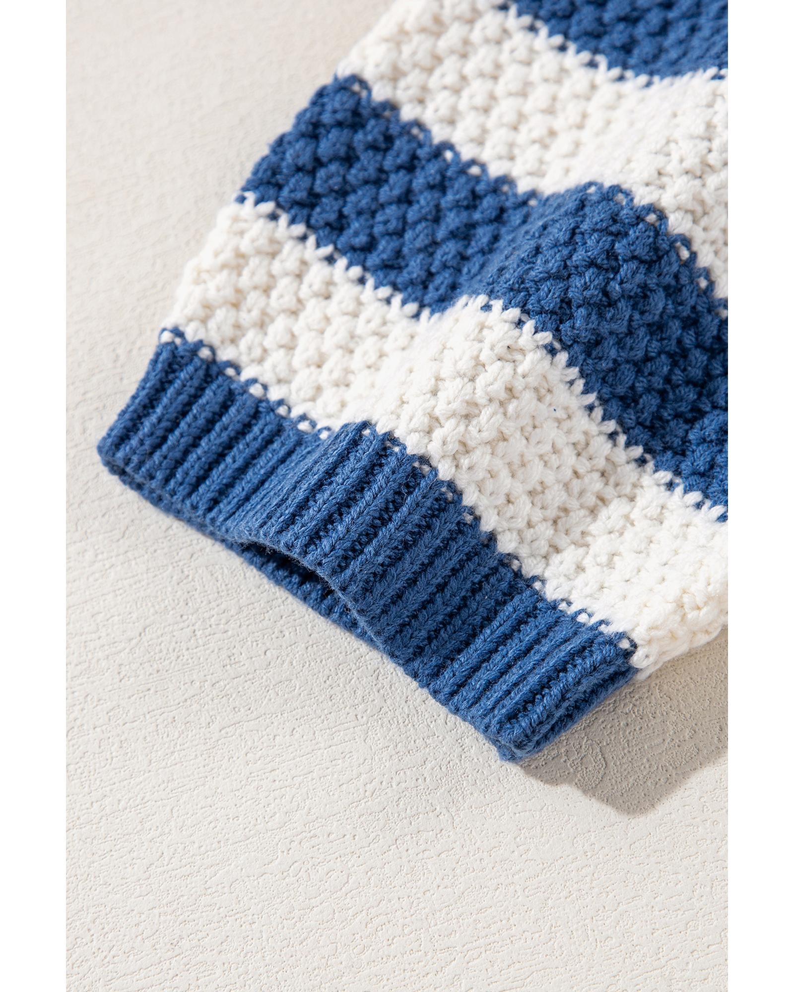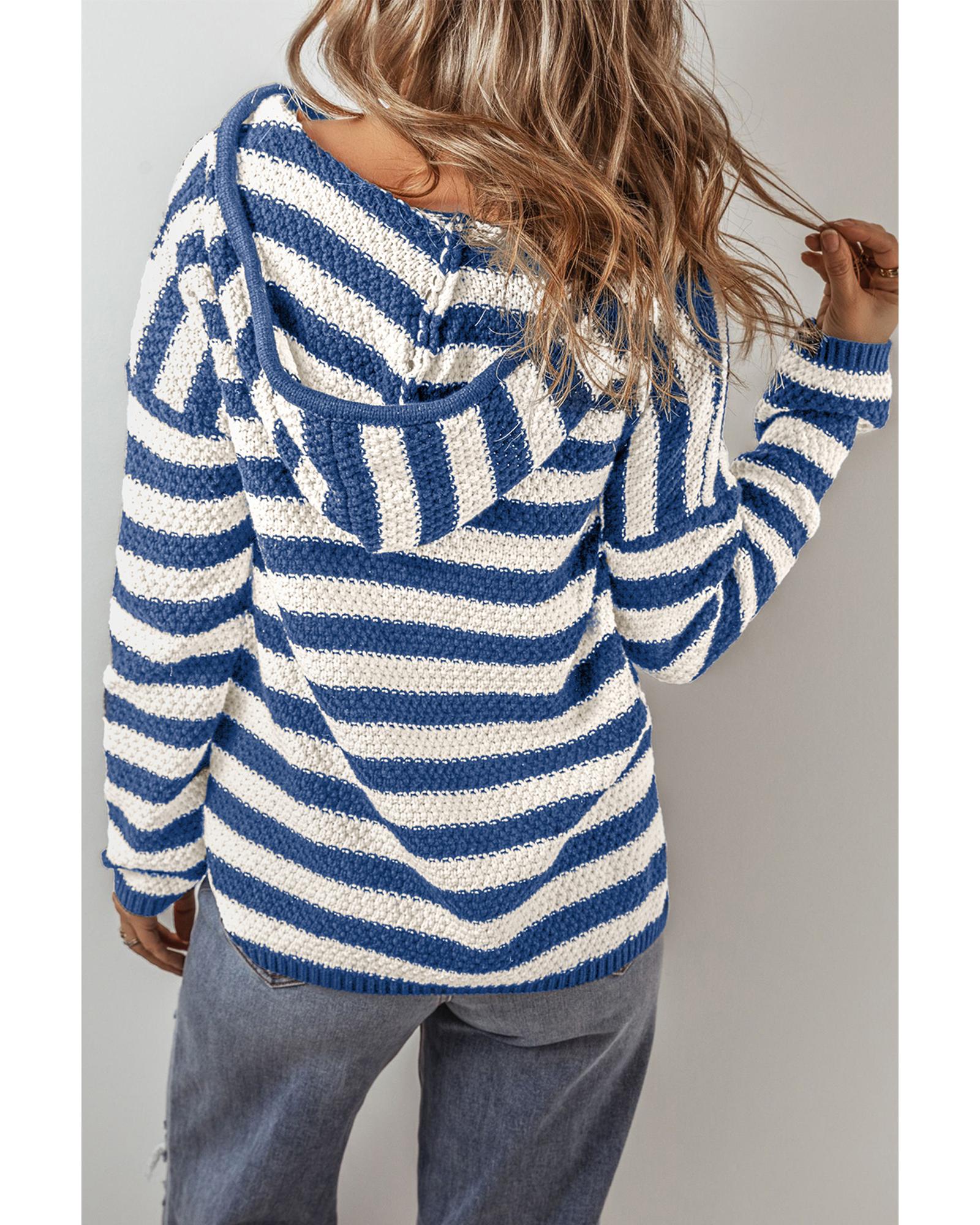 Blue Stripe V Neck Pocketed Drawstring Hooded Sweater – 2XL
