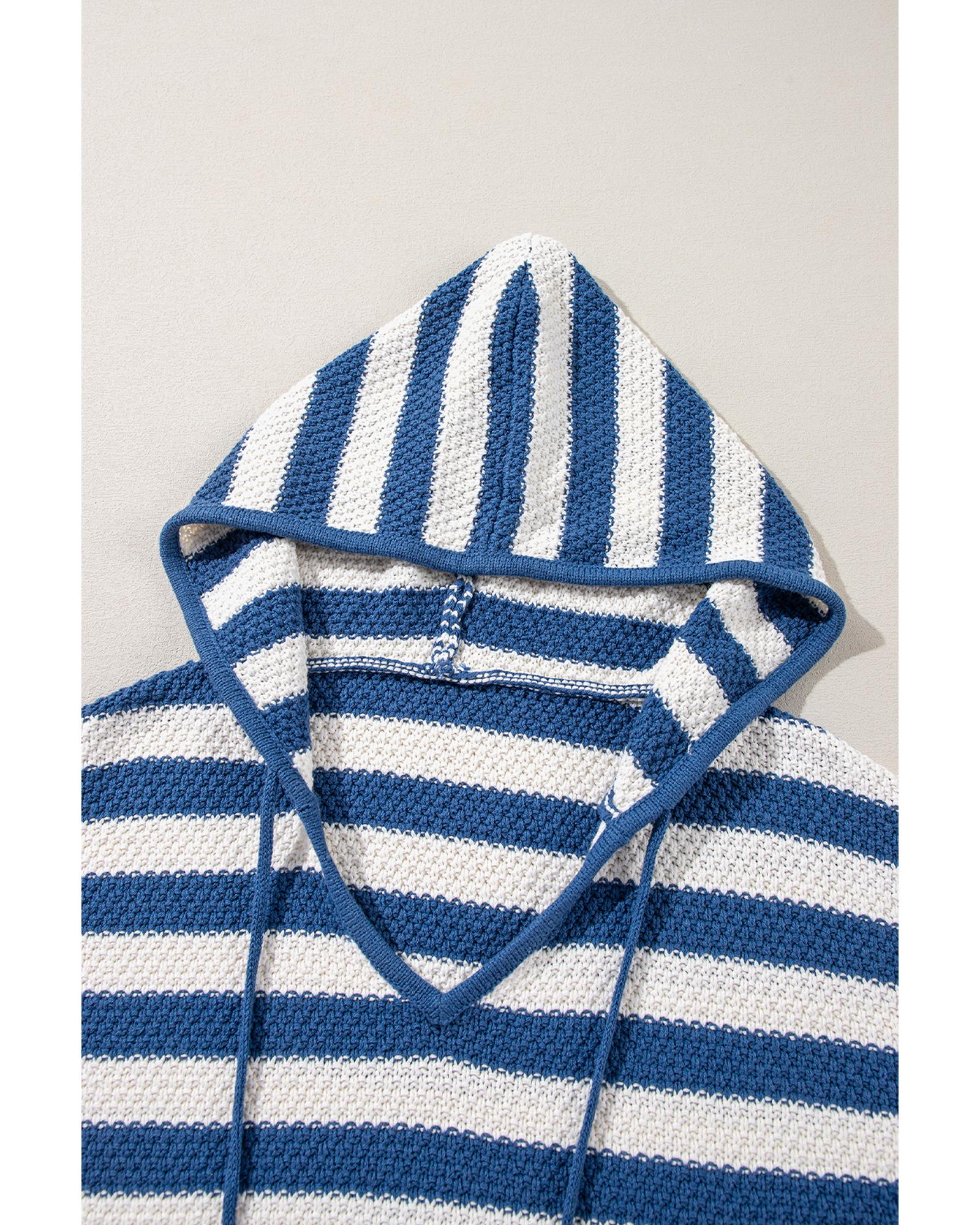 Blue Stripe V Neck Pocketed Drawstring Hooded Sweater – M