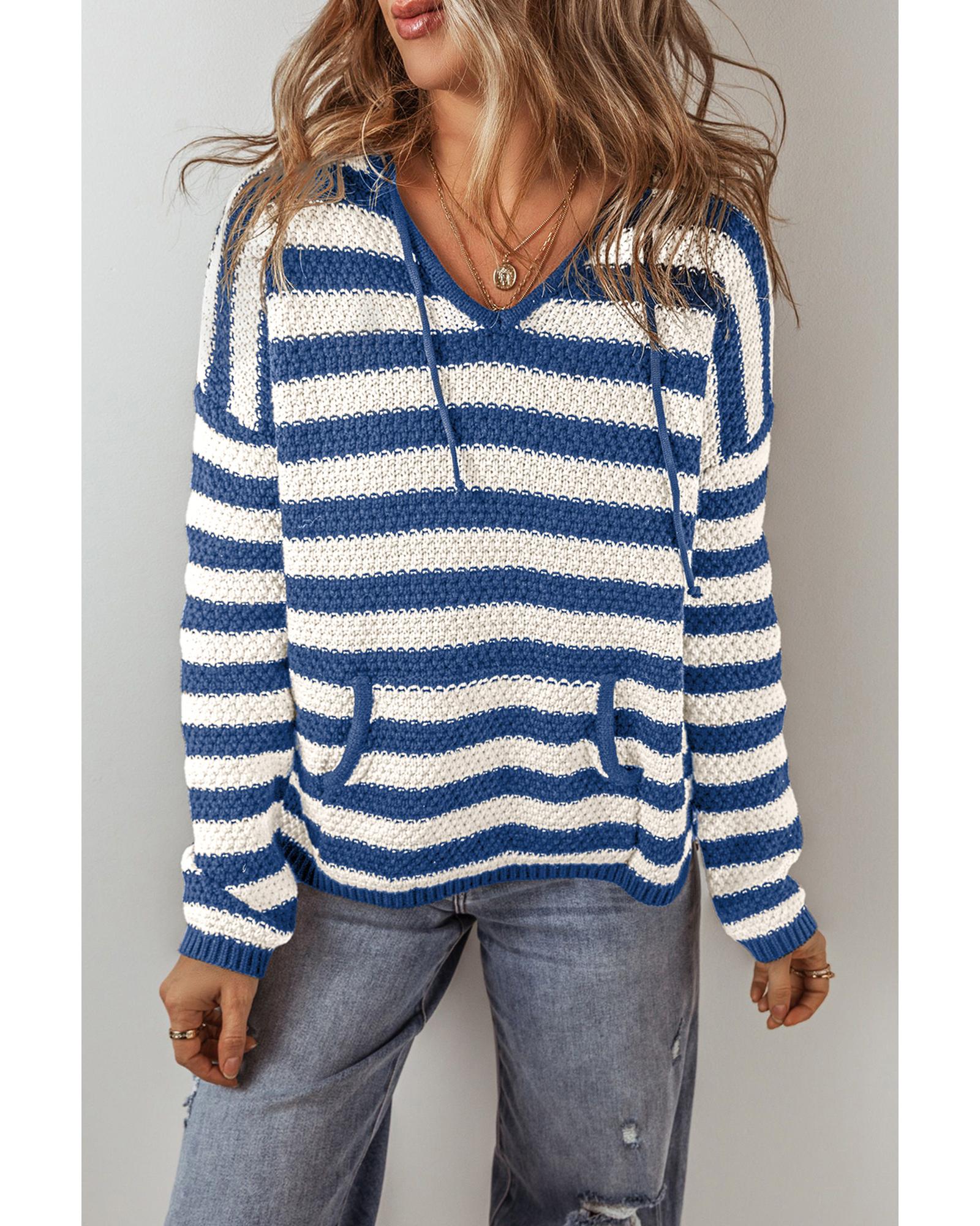 Blue Stripe V Neck Pocketed Drawstring Hooded Sweater – S