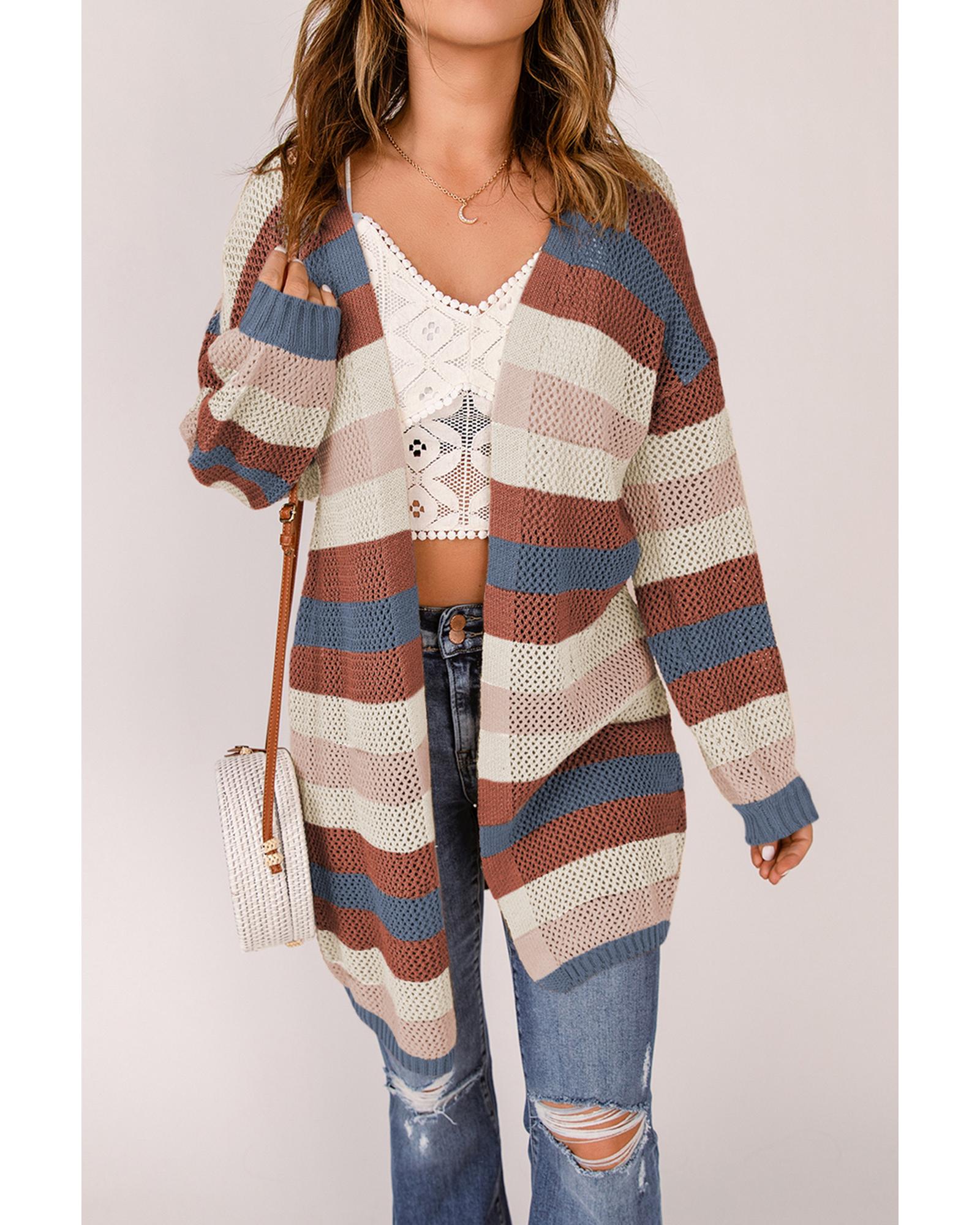 - Blue Striped Color Block Hollowed Knit Cardigan