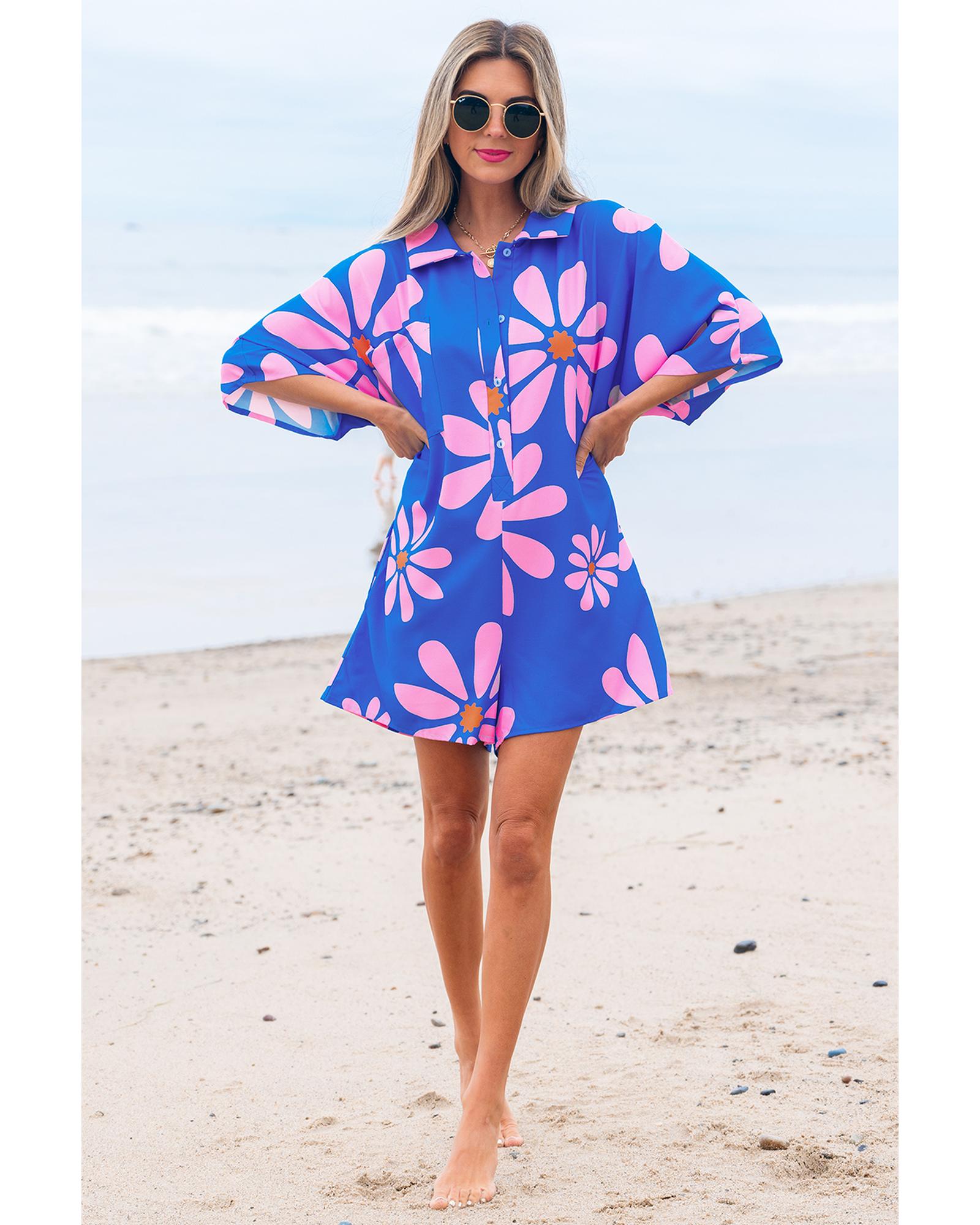 - Blue Summer Flower Print Shirt Collar Button Front Loose Romper