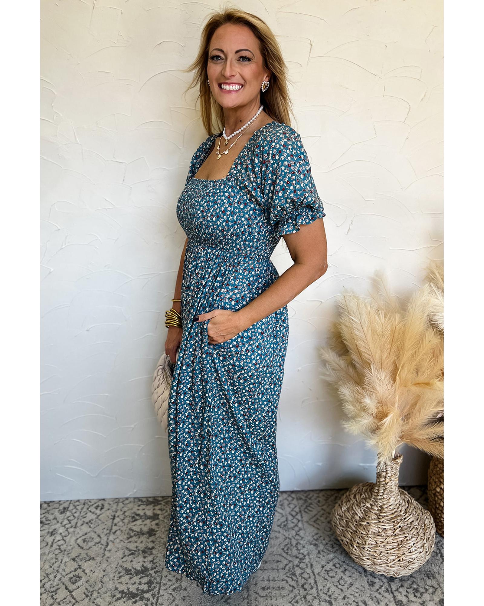 Blue Vintage Boho Floral Smocked Short Puff Sleeve Wide Leg Jumpsuit - L Original price was: $76.99.Current price is: $41.99.