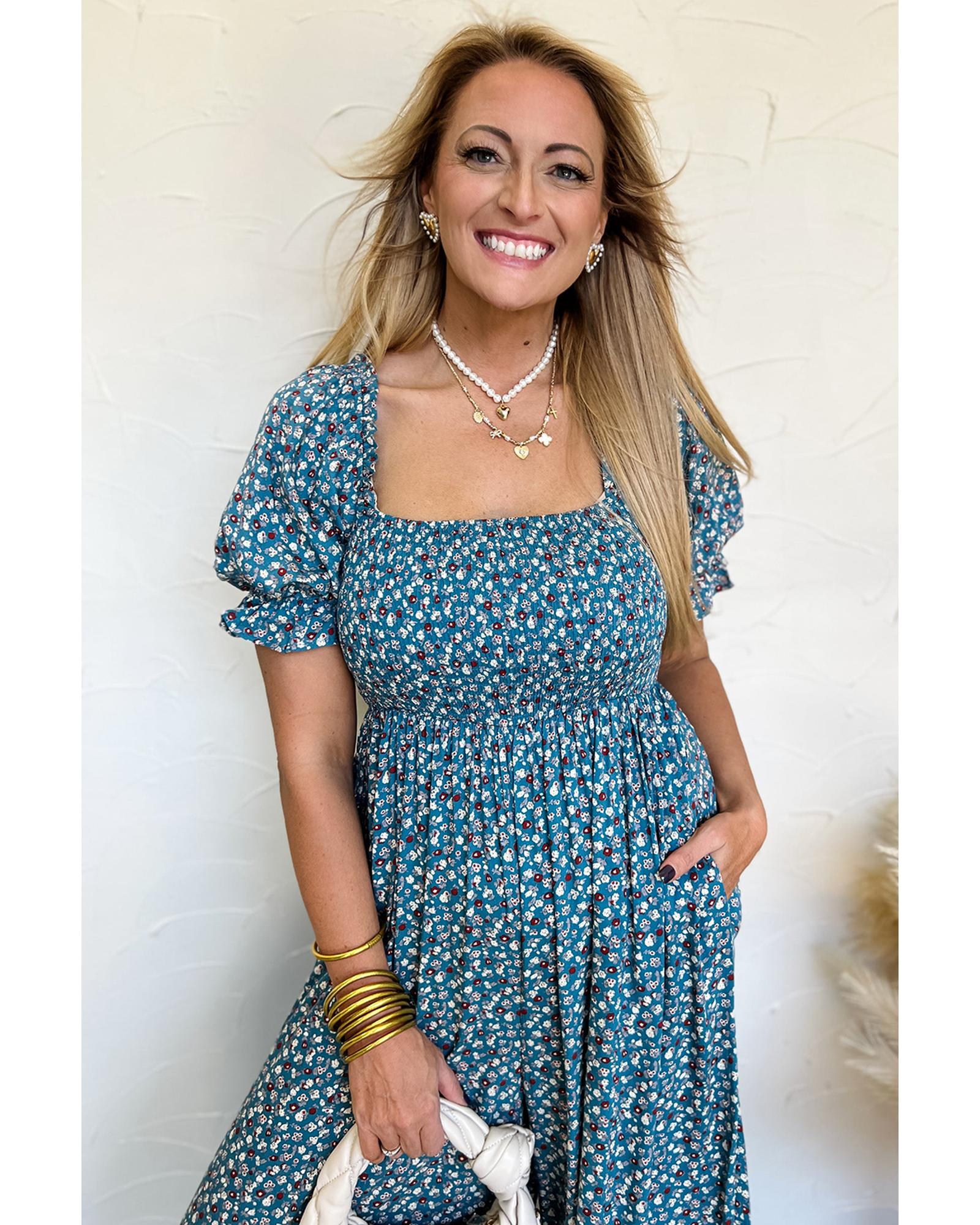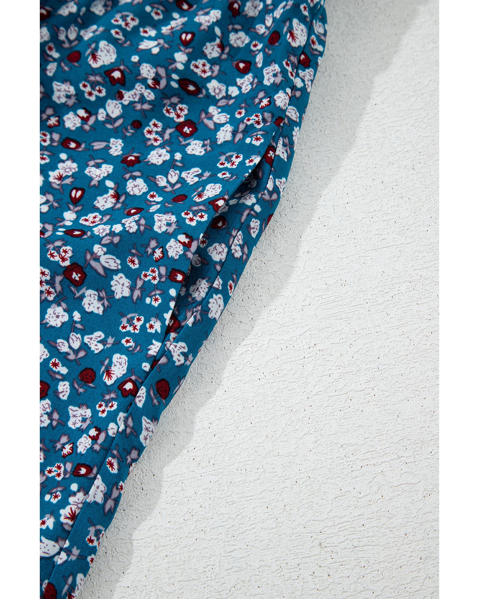 Blue Vintage Boho Floral Smocked Short Puff Sleeve Wide Leg Jumpsuit – S