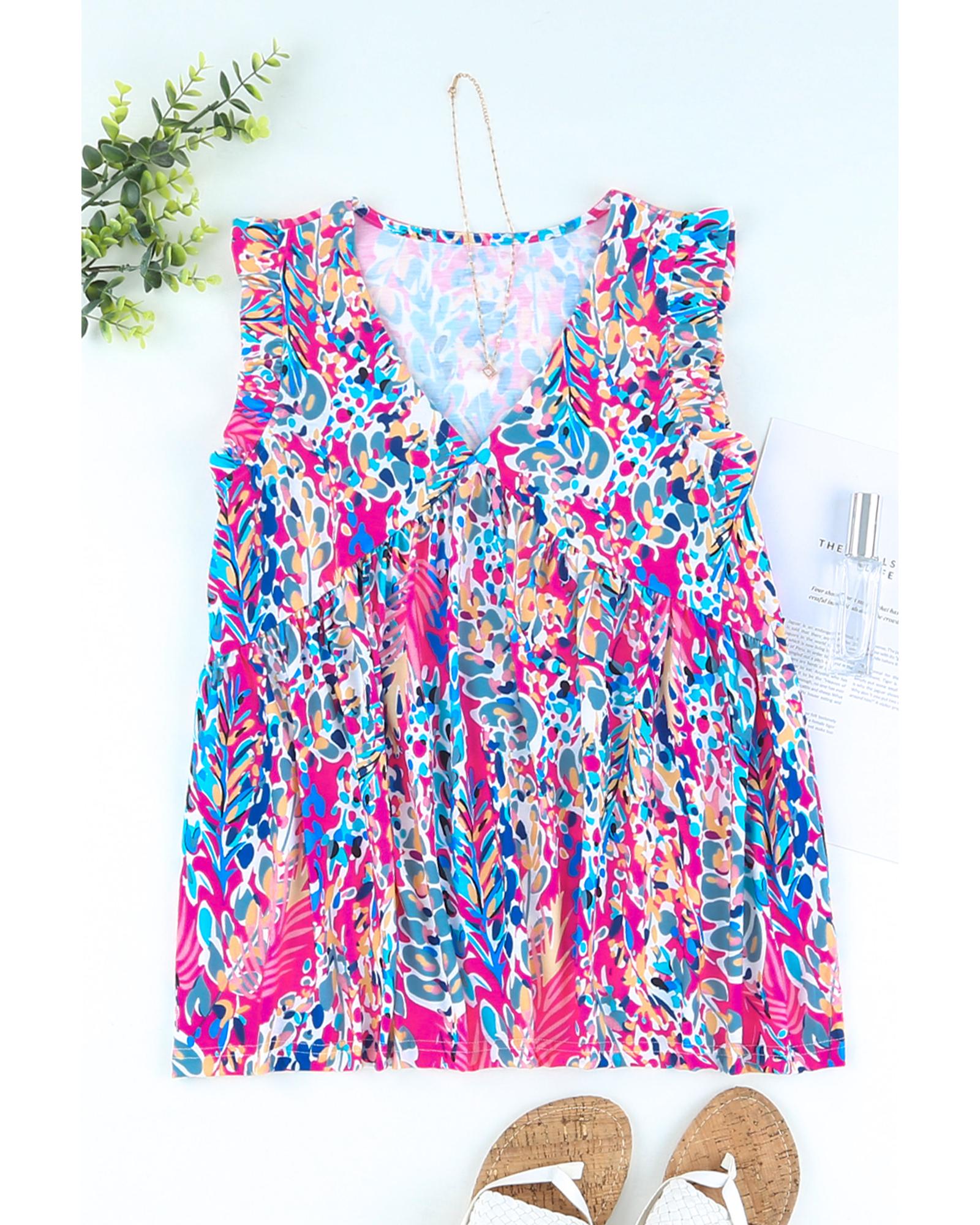 Boho Pattern Print Flounce V Neck Tank Top – L