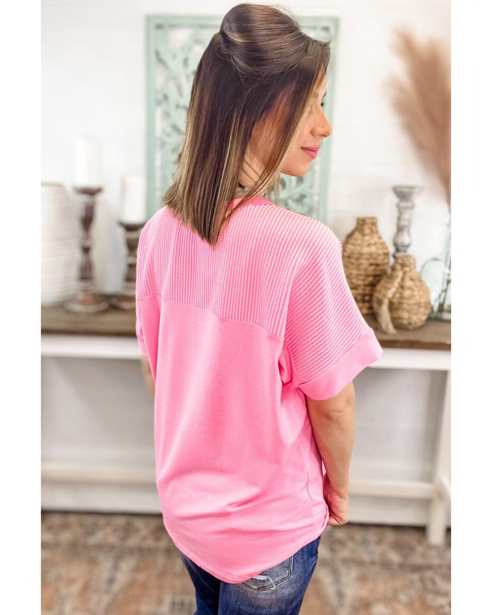 Pink Stripe Waffle Knit Pocketed Half Sleeve Plus Size T Shirt - 4X