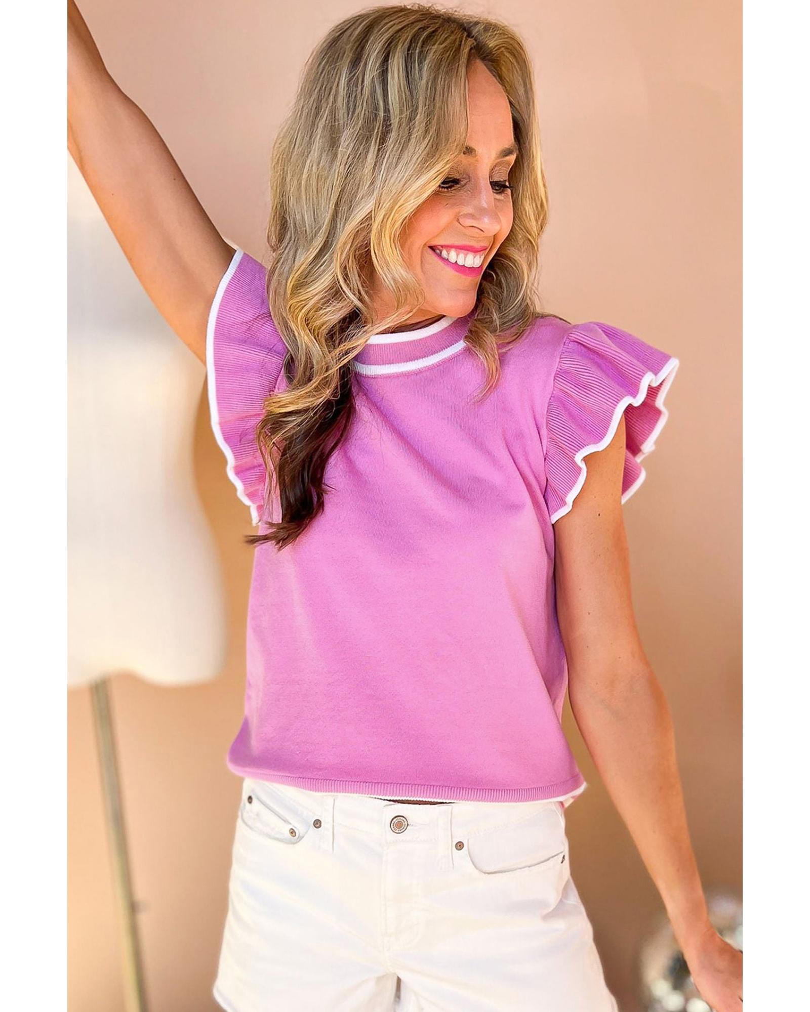 Bonbon Edge Piping Ruffled Sleeve Round Neck Knit Top – XL