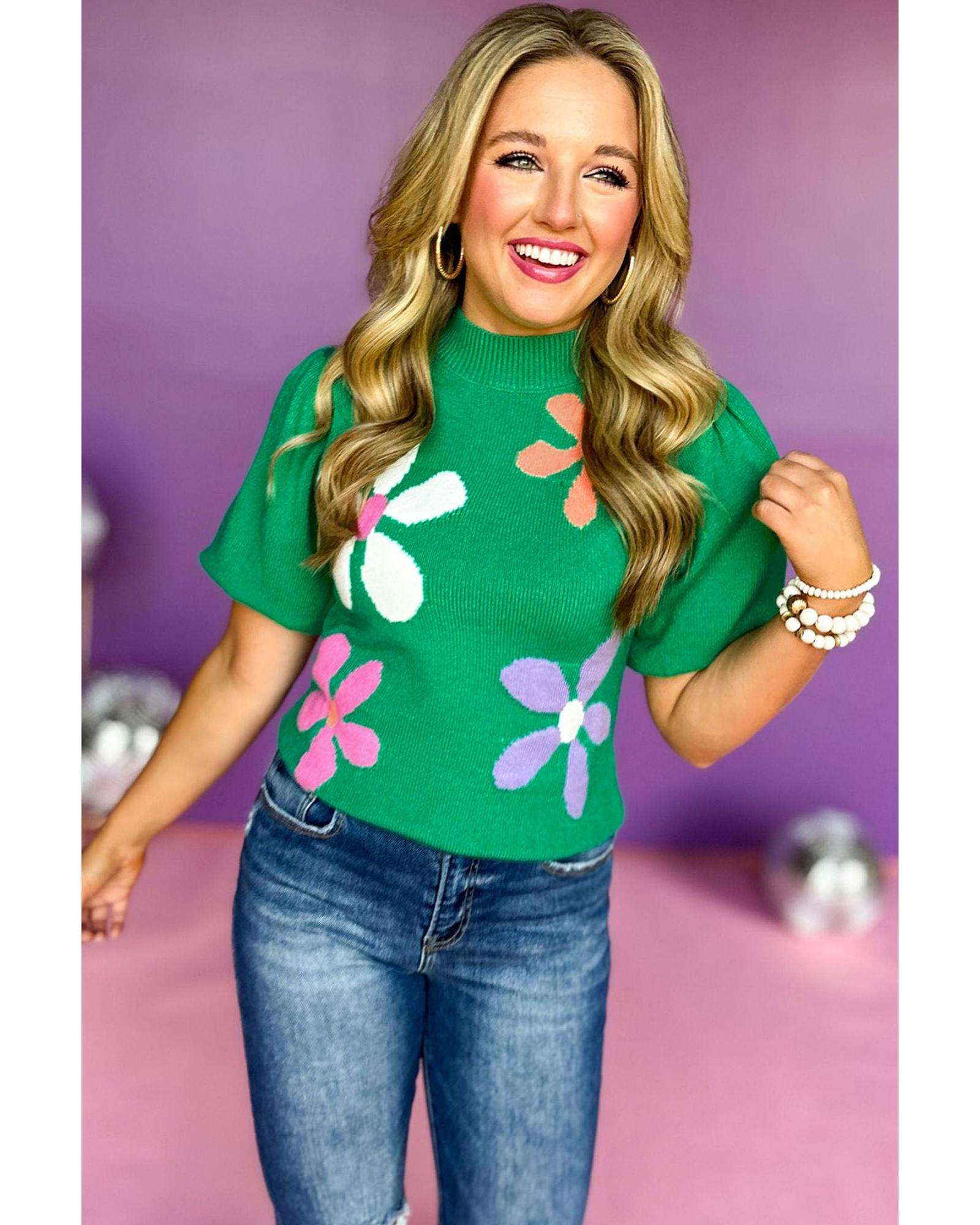 Bright Green Floral Bubble Short Sleeve Sweater – L