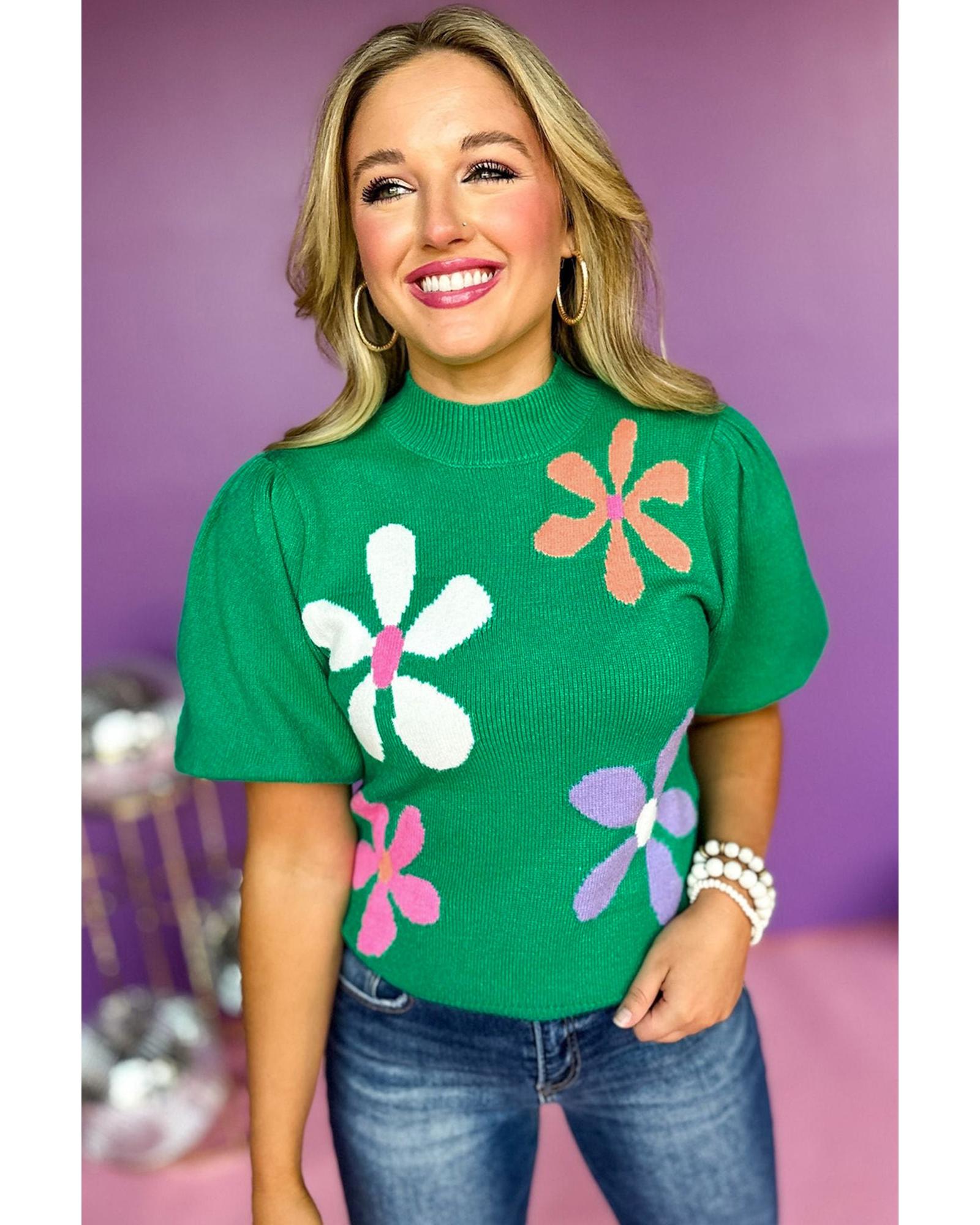 Bright Green Floral Bubble Short Sleeve Sweater – S
