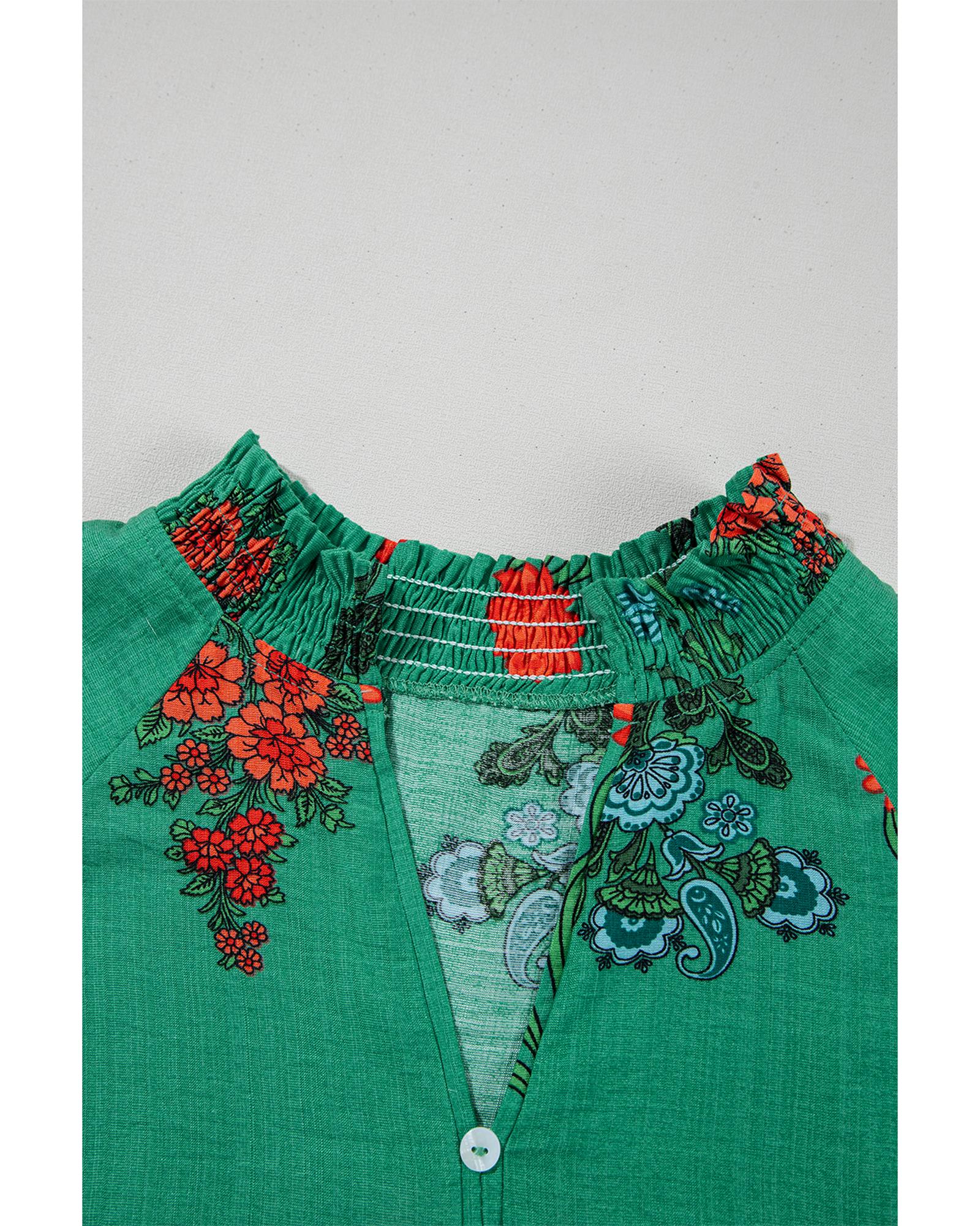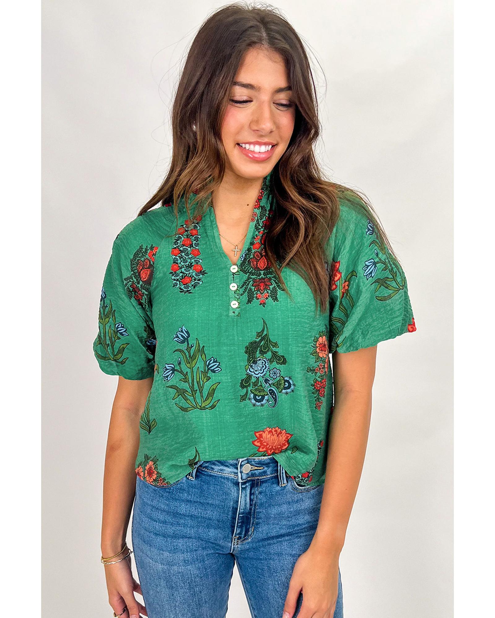 Bright Green Floral Print Buttoned V Neck Short Sleeve Blouse – M