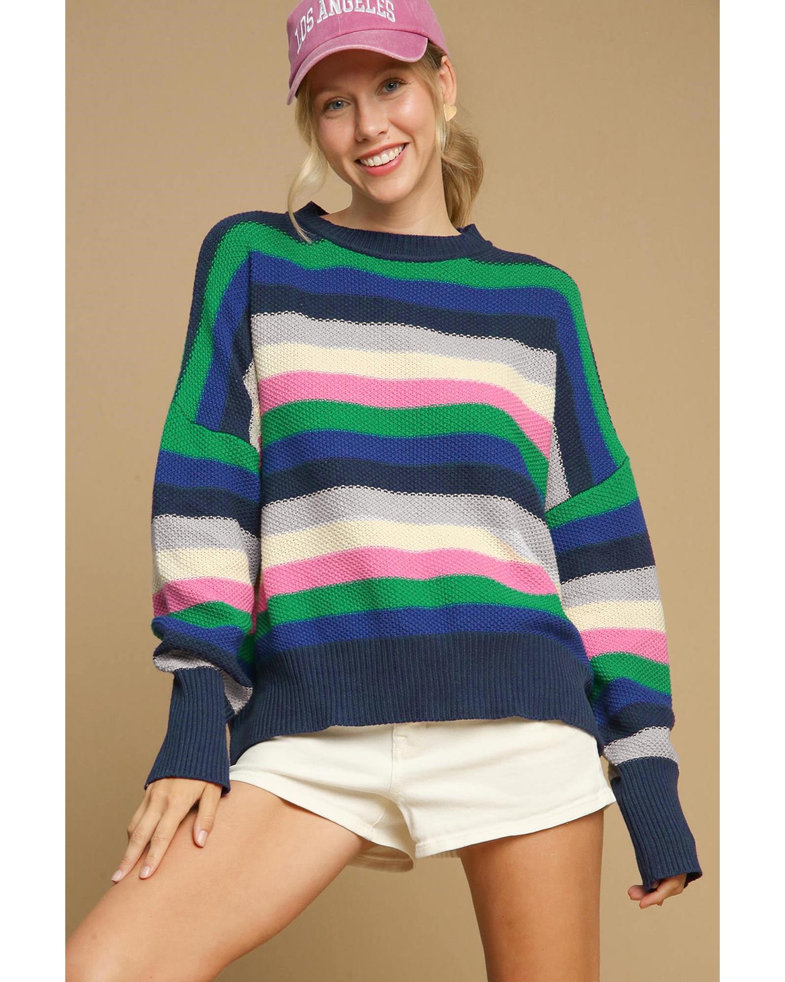 Bright Green Rainbow Striped Crew Neck Drop Shoulder Sweater – S