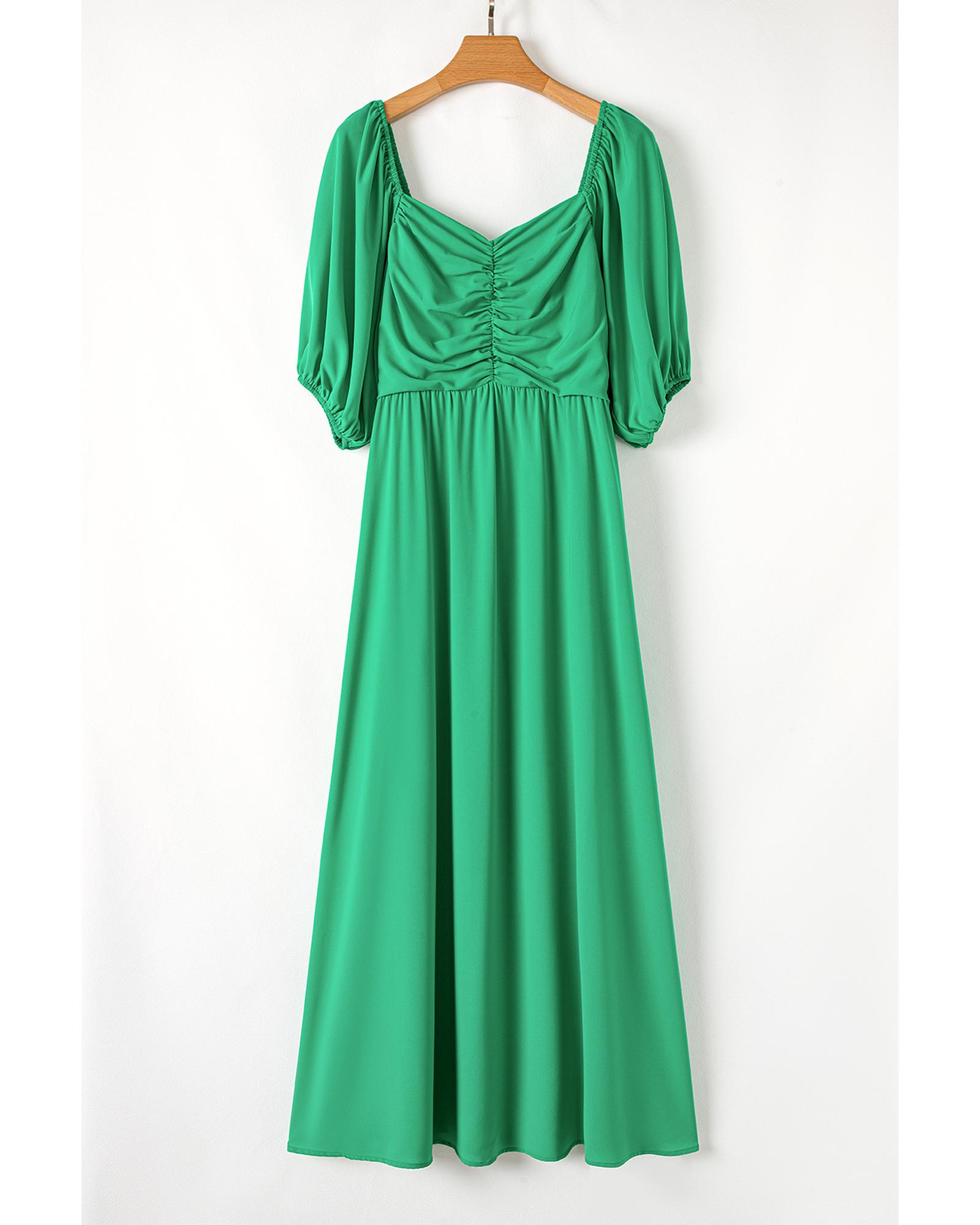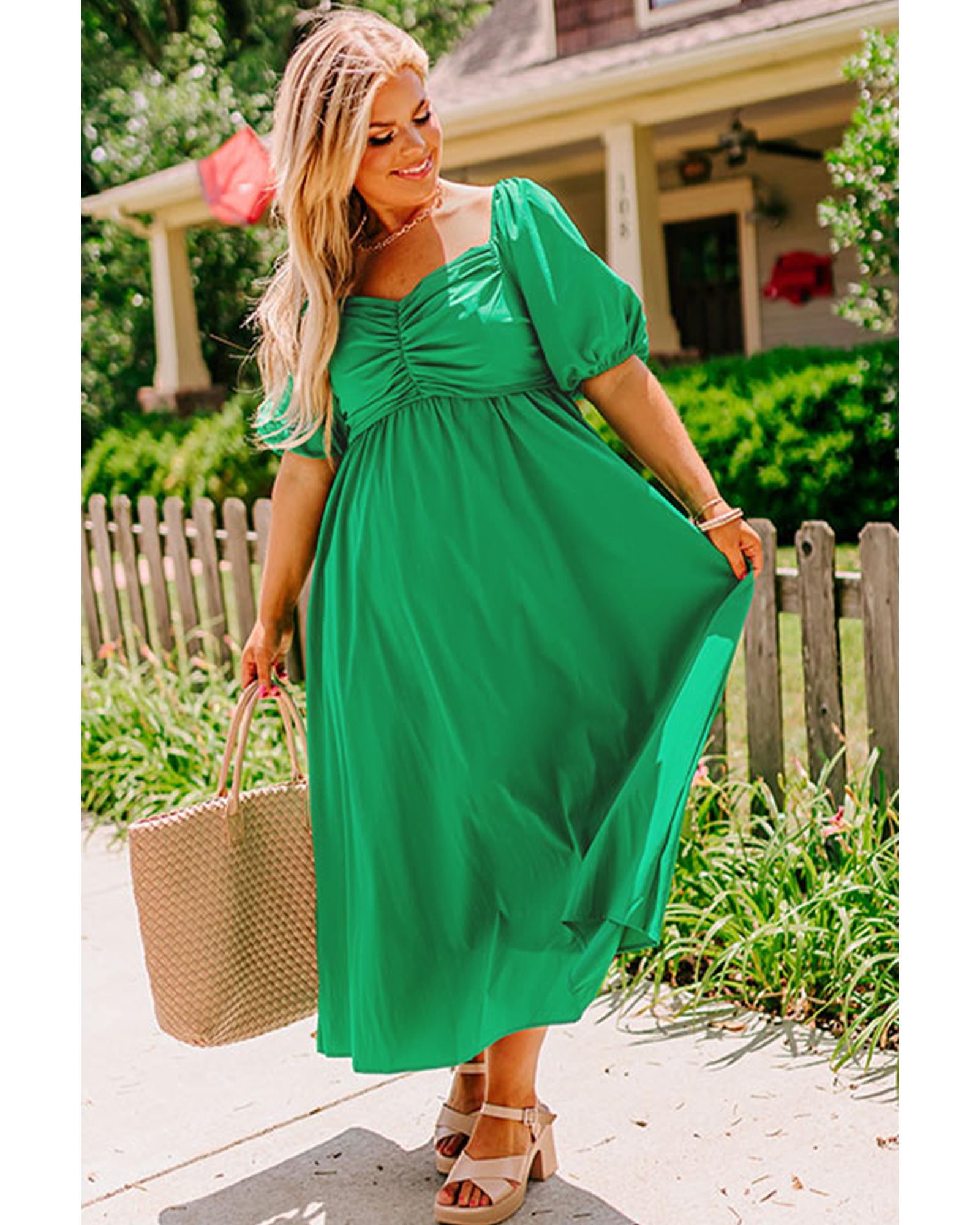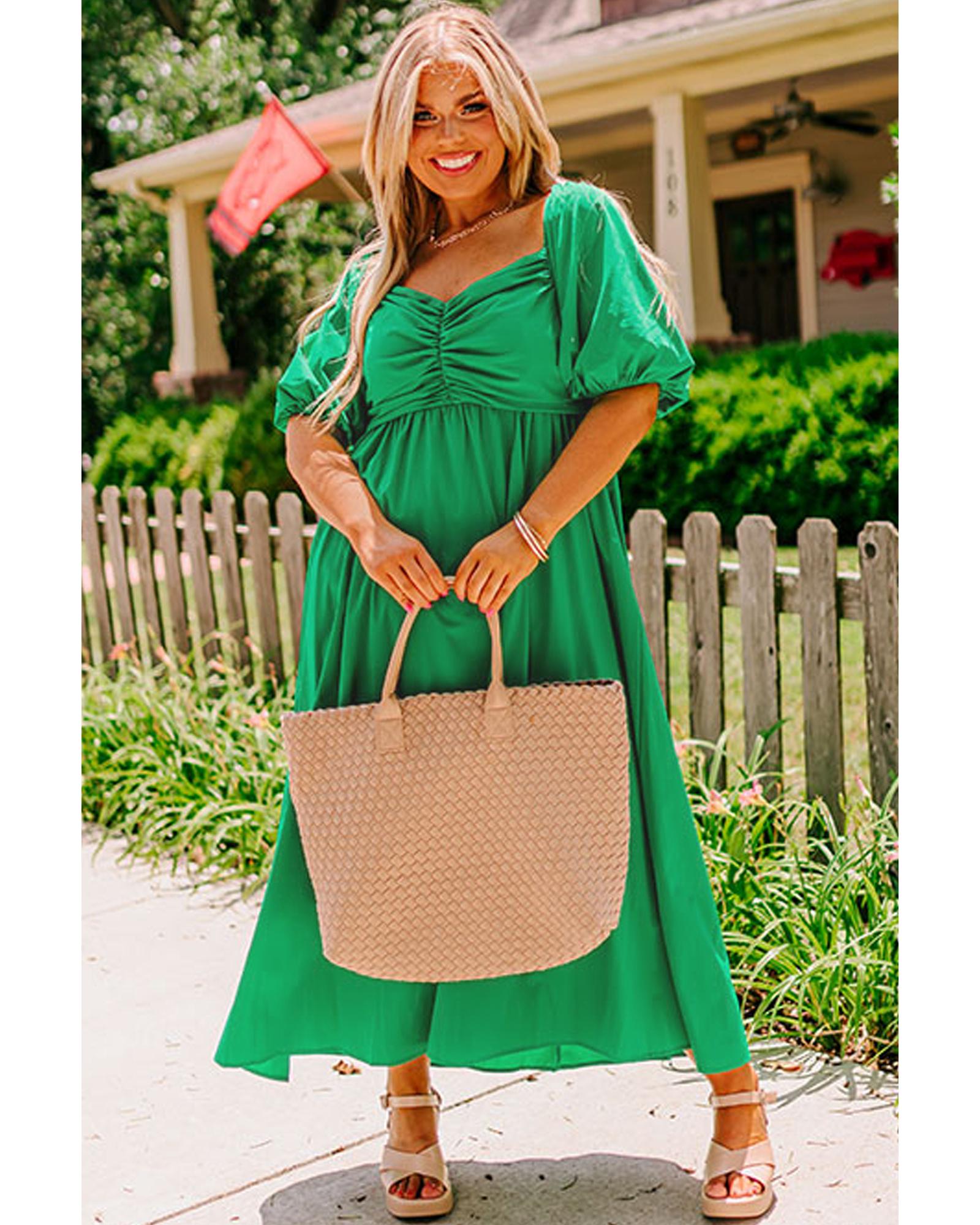 Bright Green Ruched Front Puff Sleeve Plus Size Long Dress – 4X