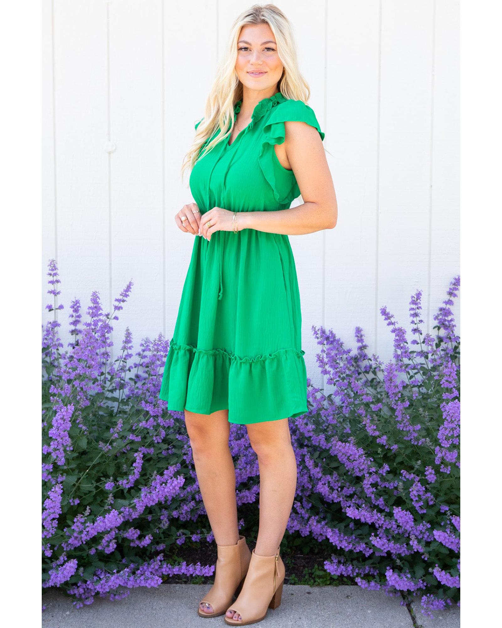 Bright Green Split V Neck Elastic Waist Ruffled Dress – L