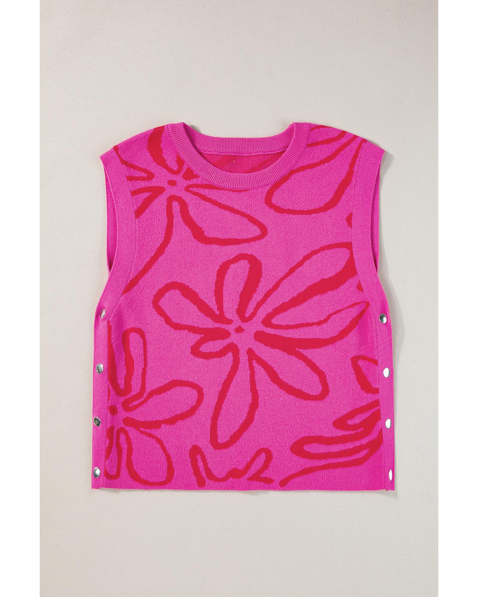 Bright Pink Button Sides Sleeveless Floral Knitted Top – L