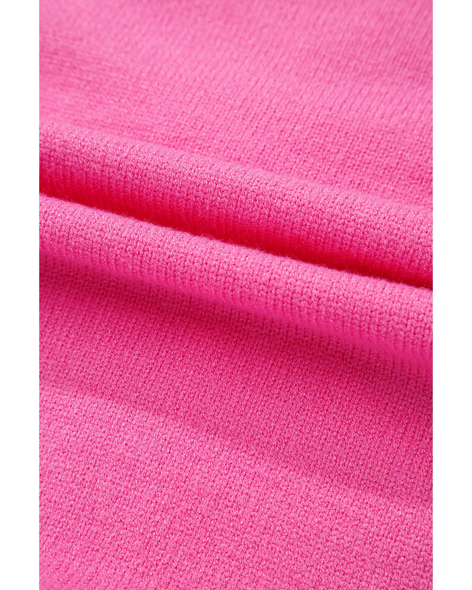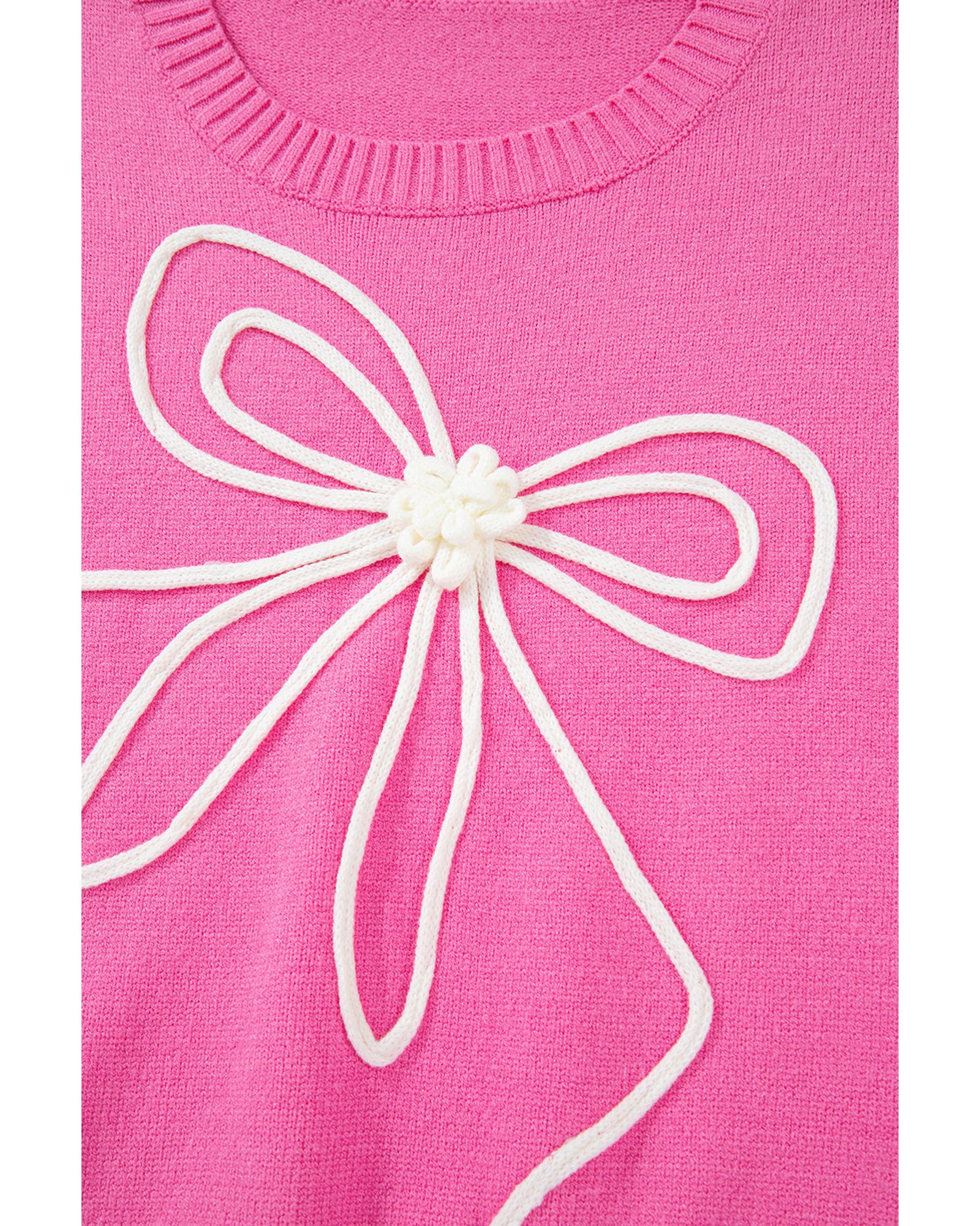 Bright Pink Corded Flower Bow Ribbed Trim Casual Sweater – L