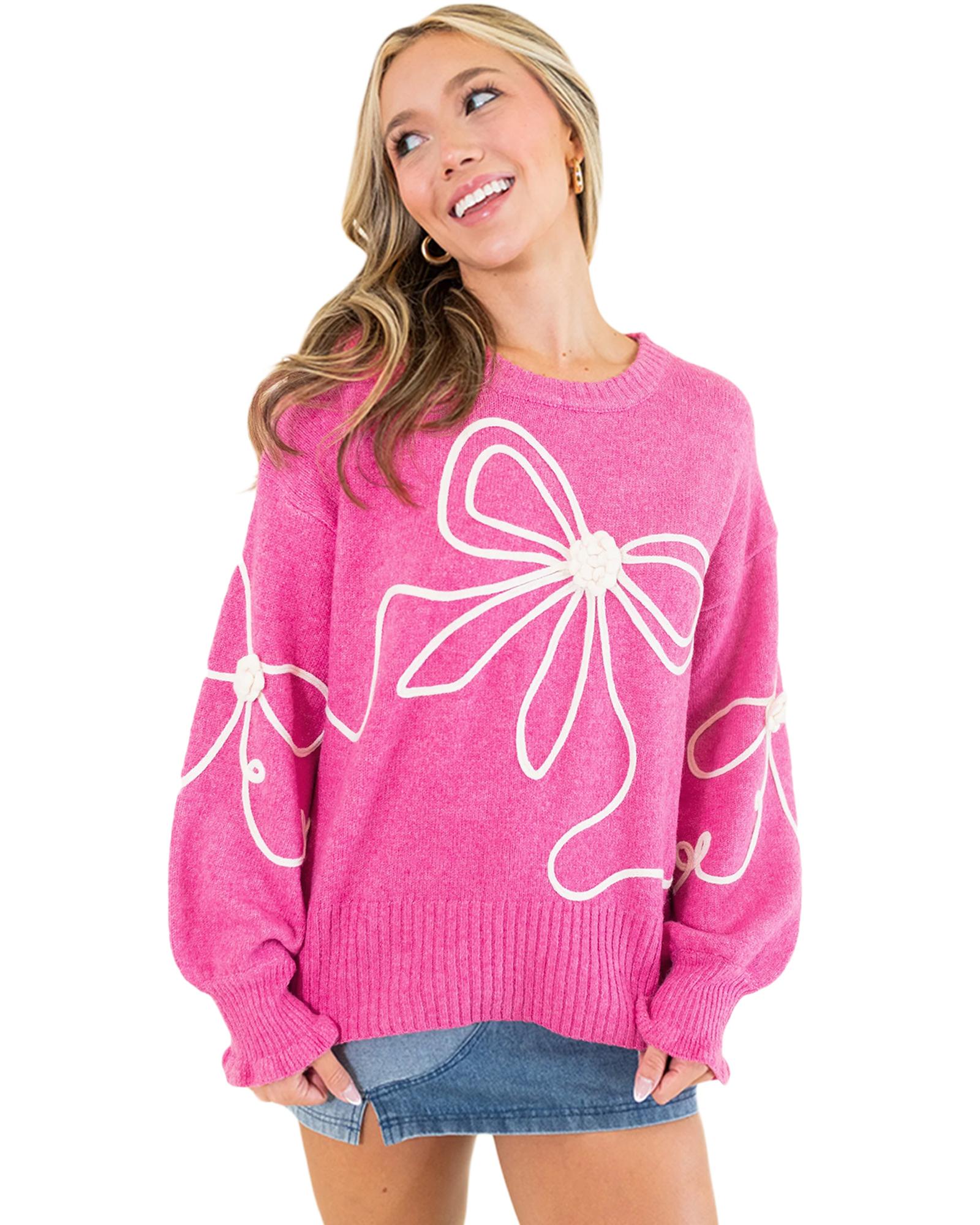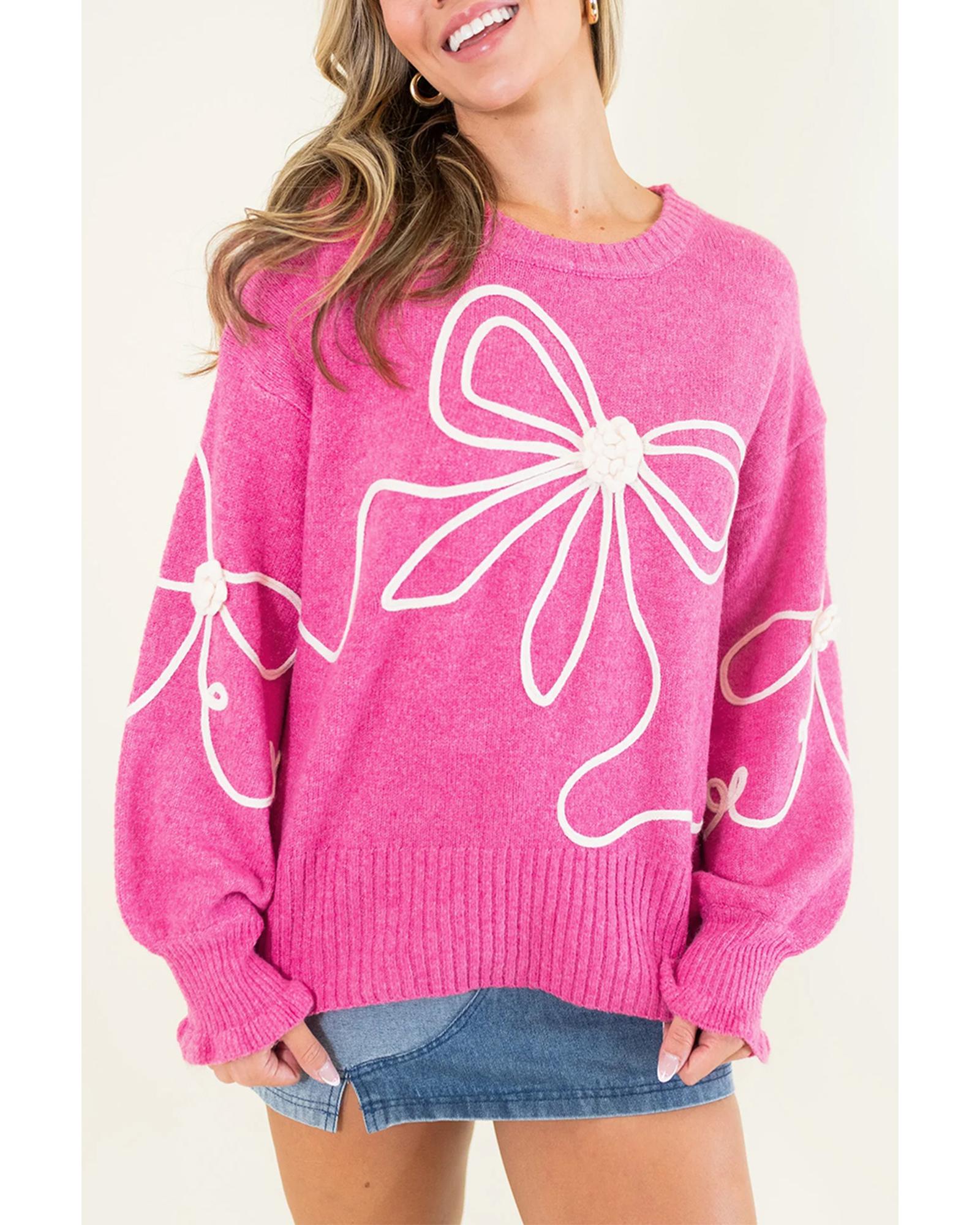 Bright Pink Corded Flower Bow Ribbed Trim Casual Sweater – S