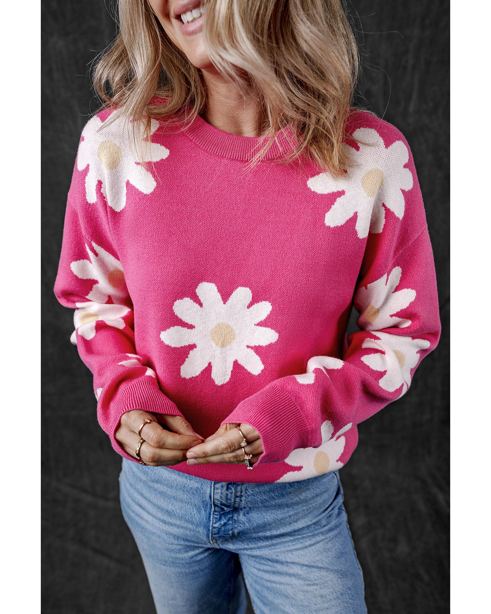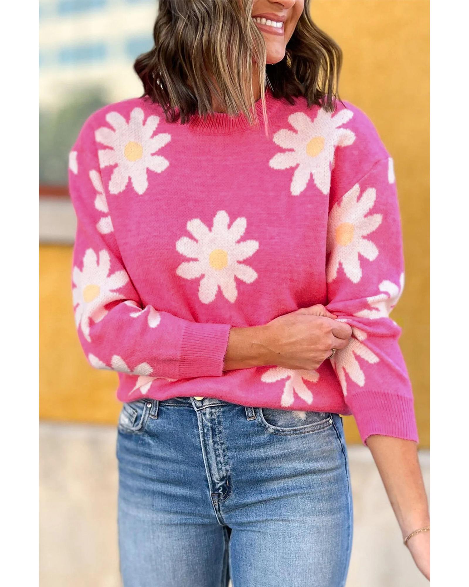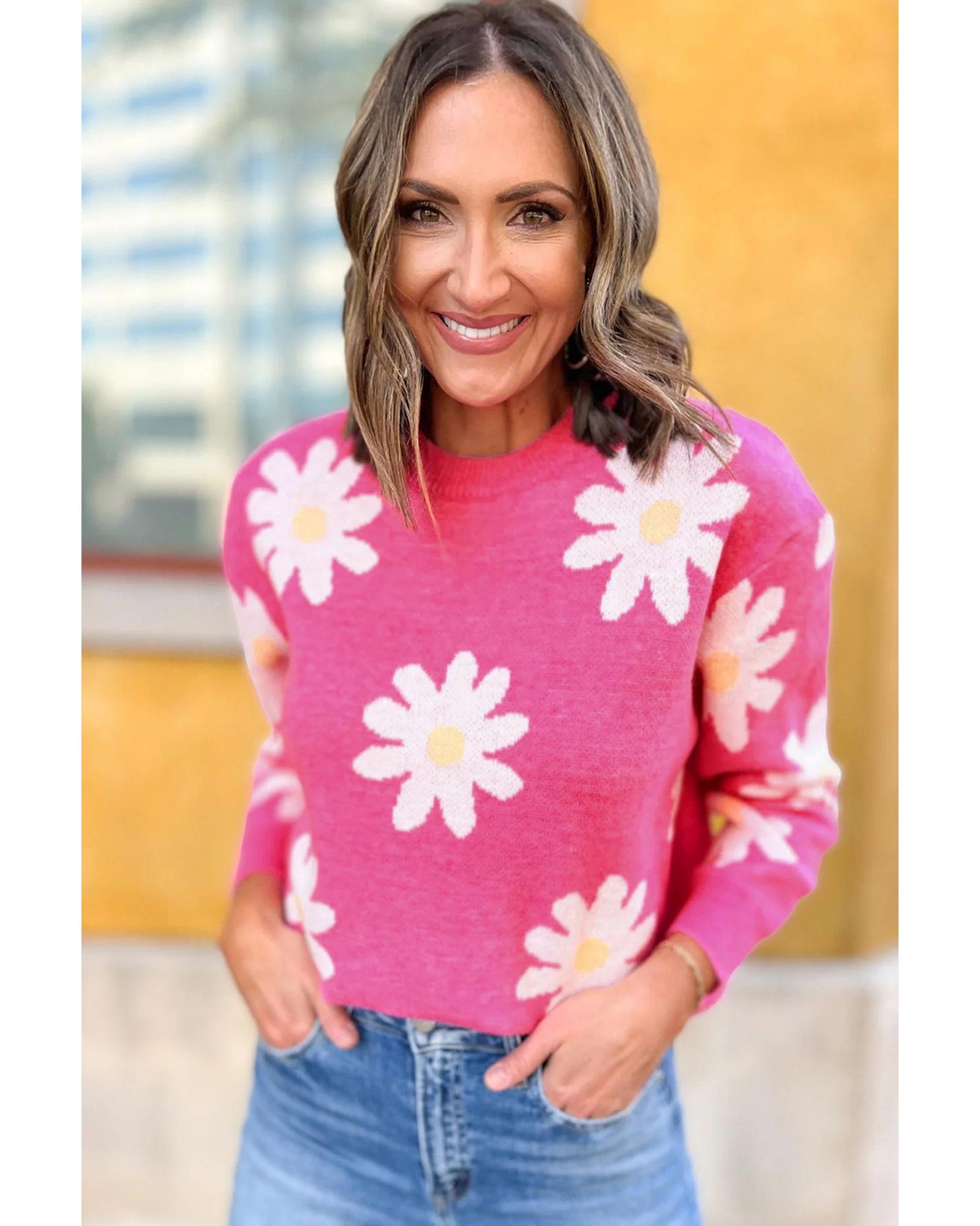 Bright Pink Daisy Flower Crew Neck Long Sleeve Sweater – L